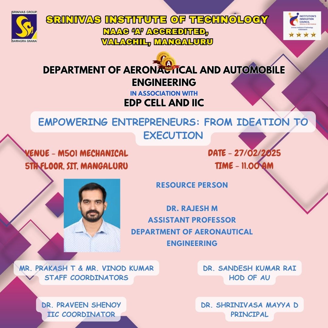 Srinivas Institute of Technology, Mangaluru organized a comprehensive workshop on entrepreneurship development focusing on the journey from ideation to execution...
