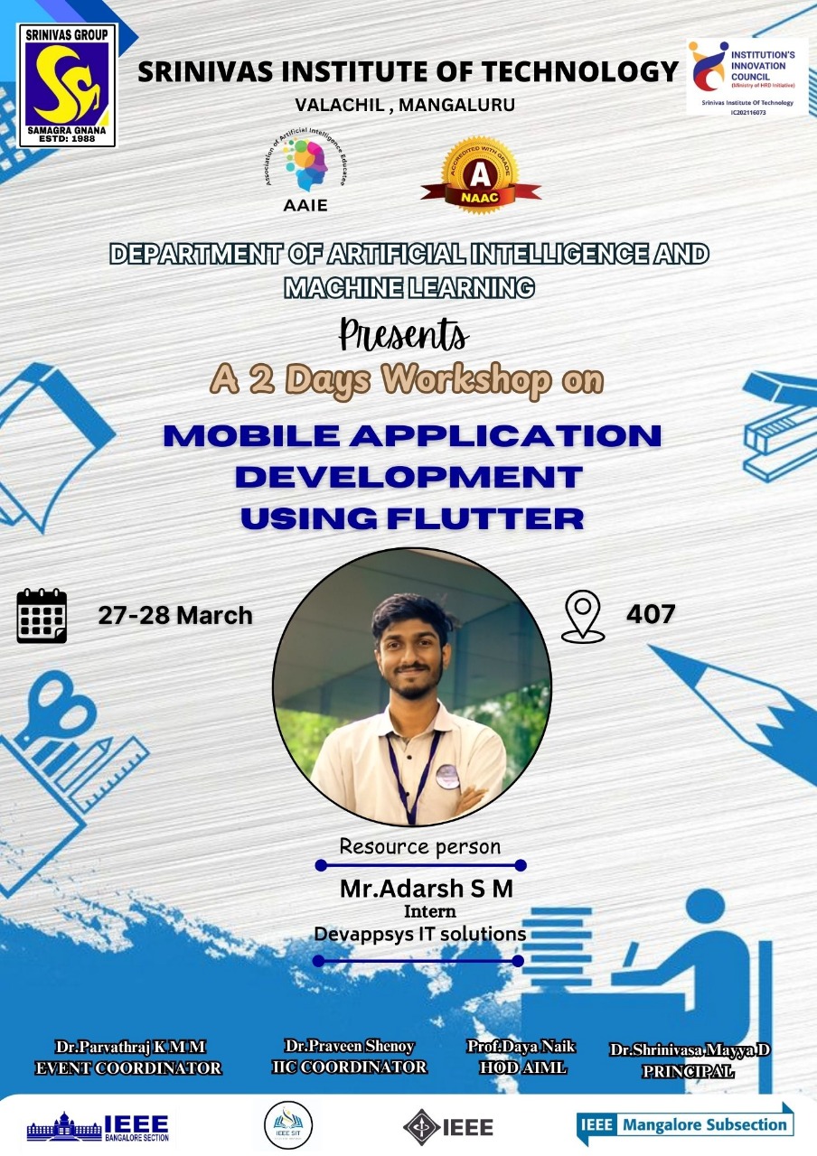 SRINIVAS INSTITUTE OF TECHNOLOGY, MANGALURU Department of Artificial Intelligence and Machine Learning The Department of AI & ML successfully conducted a Two-Day Workshop on Mobile Application Development Using Flutter on 27th & 28th March 2025 in association with Devapsys IT Solutions...