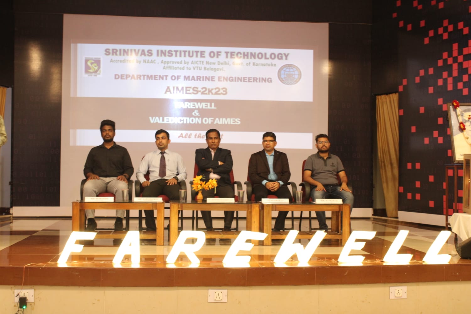 The Department of Marine Engineering organized the valedictory function of AIMES and farewell to the final year Marine Engineering students on 30th May 2023. Dr. Shrinivasa Mayya D, Principal of Srinivas Institute of Technology, presided over the program and addressed the graduating students, urging them to exhibit professionalism in their future endeavors. He encouraged them to return to the college, share their experiences with their juniors and join him on stage.