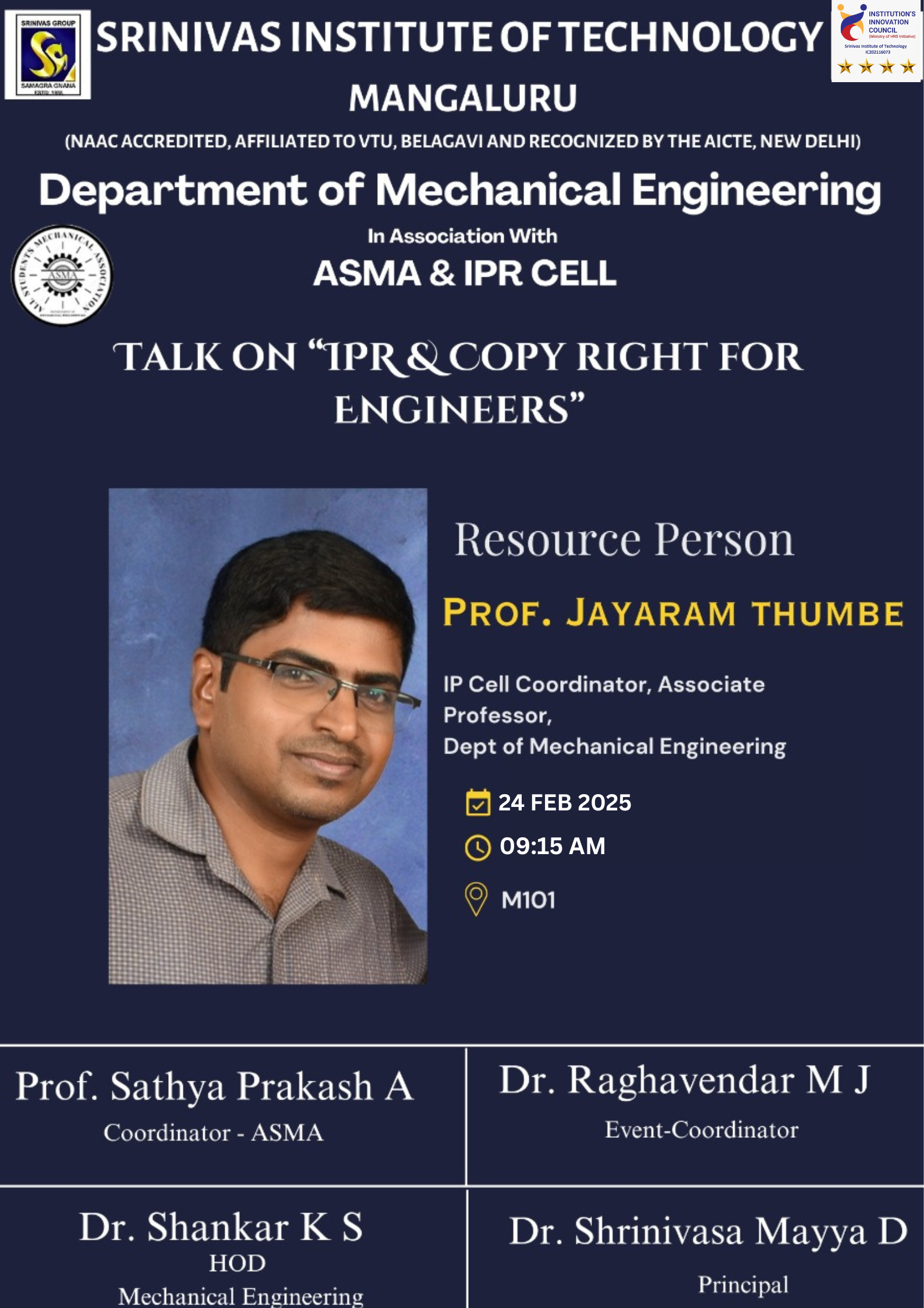 SRINIVAS INSTITUTE OF TECHNOLOGY, MANGALURU Institution's Innovation Council (IIC) The Intellectual Property Rights (IPR) Awareness Program was organized to educate students and faculty about the importance of intellectual property protection in innovation and entrepreneurship...