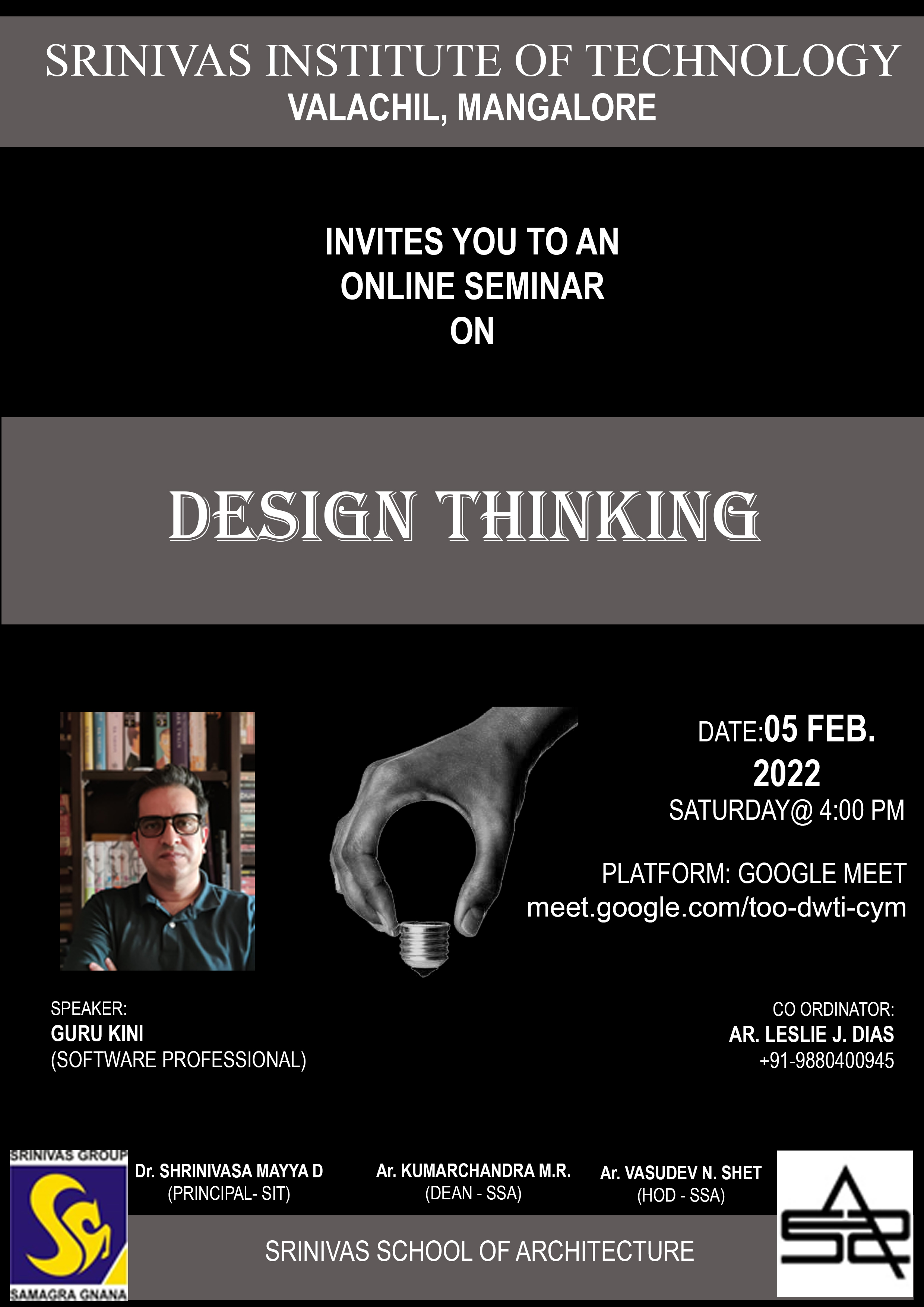The department of architecture conducted an online webinar on design thinking and innovation for the 1’st yr. B.Arch. and 1’st yr. BE students. The speaker was Mr. Guruprasad Kini, a veteran software professional with more than 20 years of experience.