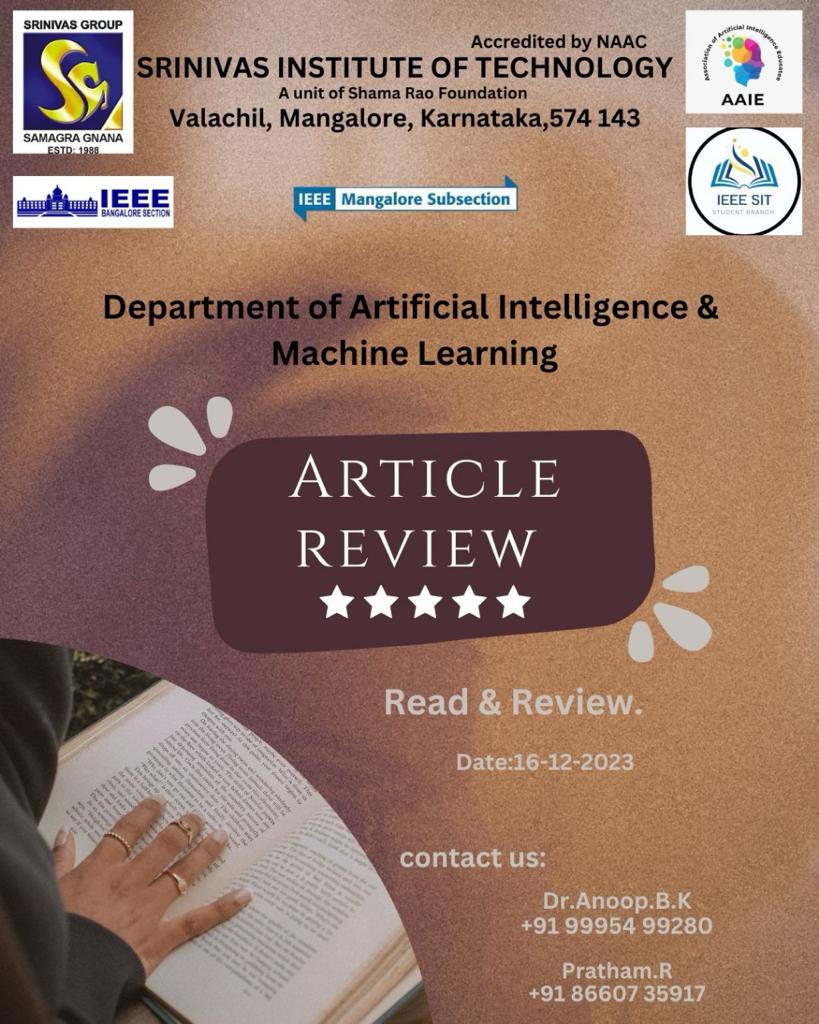 : The Article Read and Review event held at Srinivas Institute of Technology was a collaborative initiative by AAIE and IEEE SB_SIT on December 16, 2023. Aimed at 5th Semester students specializing in Artificial Intelligence and Machine Learning (AIML), the event provided a platform for in-depth exploration and discussion of relevant articles in the field.