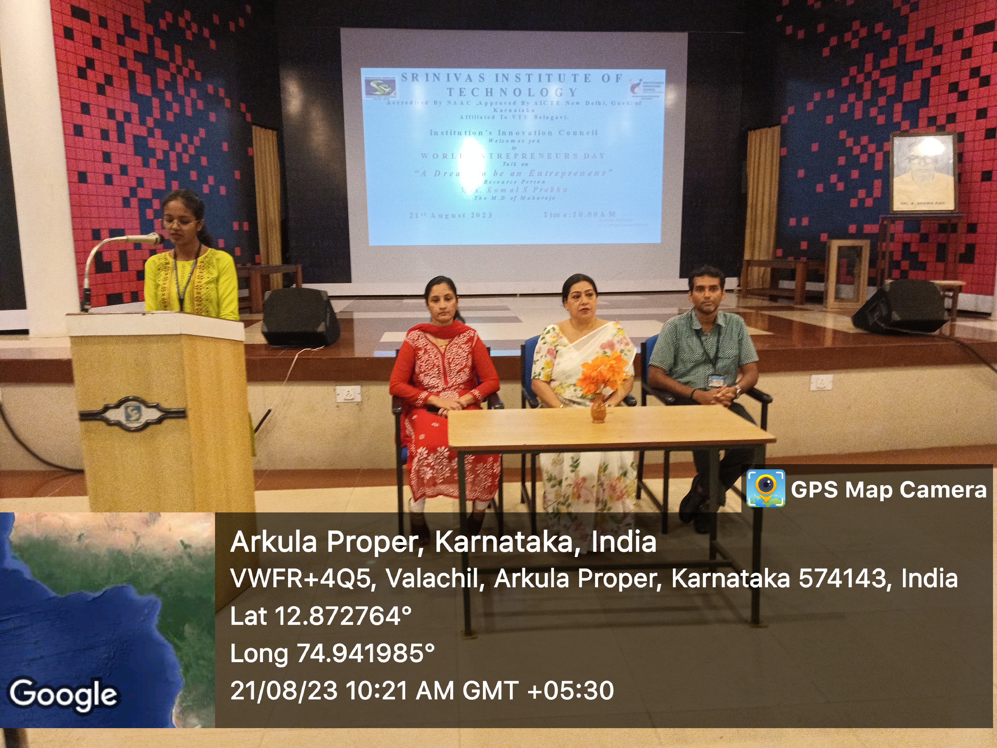 Srinivas Institute of Technology Valachil, Mangaluru and Institution's Innovation Council (IIC) celebrated the World Entrepreneurs Day in the college on 21/08/2023. Ms Lisha of 4th sem ECE Department welcomed the gathering and introduced the Chief guest Mrs Komal S Prabhu , The M.D of Maharaja family restaurant. Mrs Komal S Prabhu delivered the talk on the topic “A Dream to be an Entrepreneur”. Around 190 students actively participated in this program from different engineering streams.
