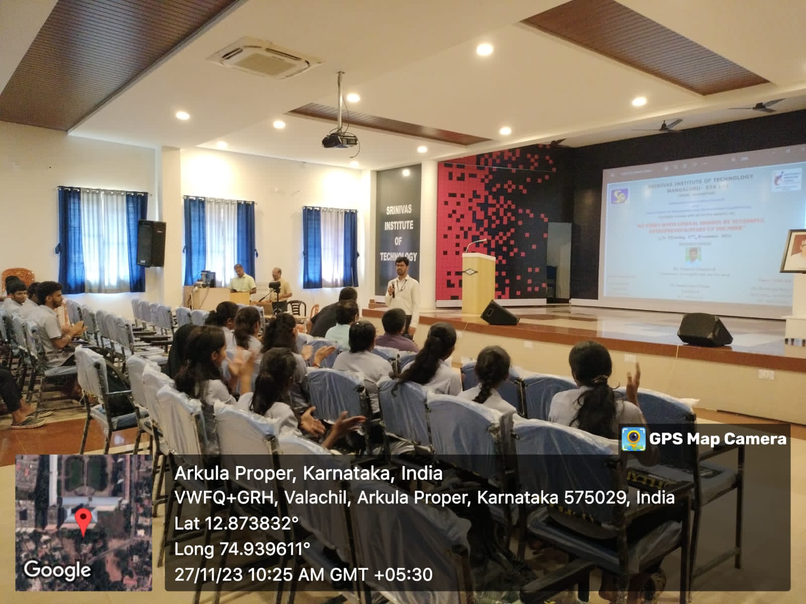 The Association of Artificial Intelligence and Data Science Department, AADE, and the Institution’s Innovation Council (IIC) organized the visit to students of 3rd-semester Artificial Intelligence and Data Science visited NaVinod Technologies LLP(Aykan®) Skill house, Mangaluru on 29-11-2023.Ganapathi Sharma Attachments Nov 30, 2023, 1:31 PM (4 days ago)to me Department of Electrical &Electronics Engineering of Srinivas Institute of Technology and Institution’s Innovation Council (IIC) jointly organized programme on“My Story – Motivational Session by Successful Entrepreneur/Startup founder” on November 29, at 11:00am in Research Lab of Library Block to inspire the students and educate them about the importance of Entrepreneurship, the challenges that they will come across and how to overcome it.Mr. BharathKumar, founder of M4S Marketing Company and M4S Finance was the guest speaker.