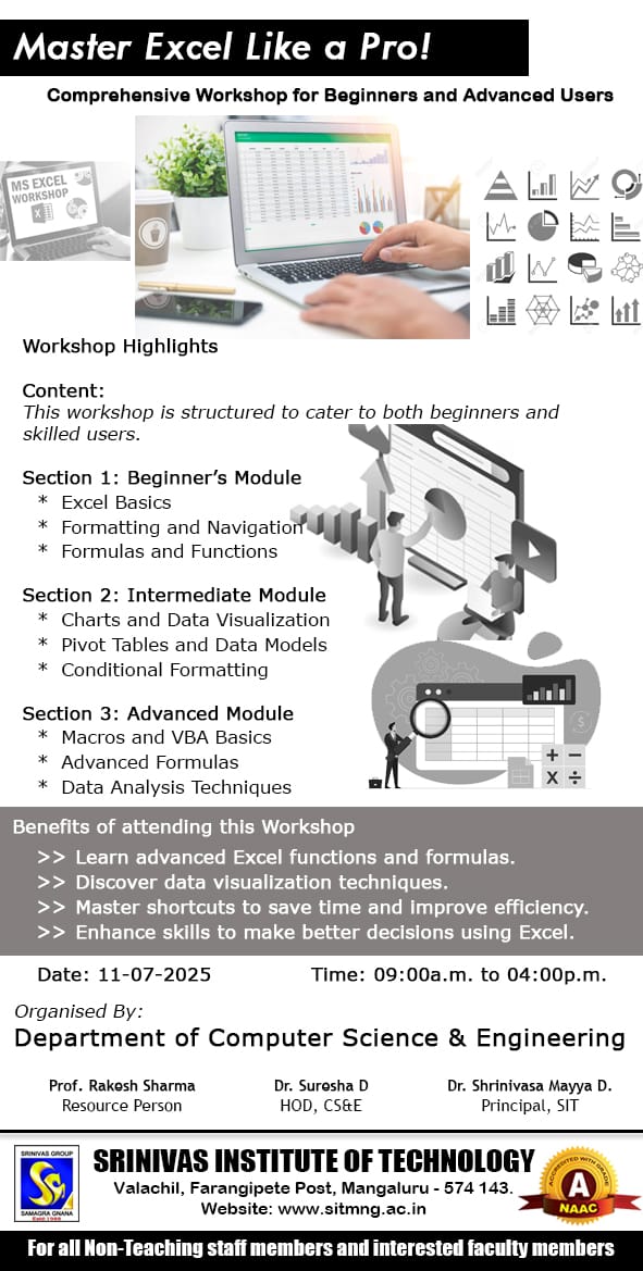 The Department of CSE organized a one-day hands-on workshop titled 'MS Excel for Office Work' on July 11, 2025, aimed at teaching and non-teaching staff to improve workplace productivity through Excel.
