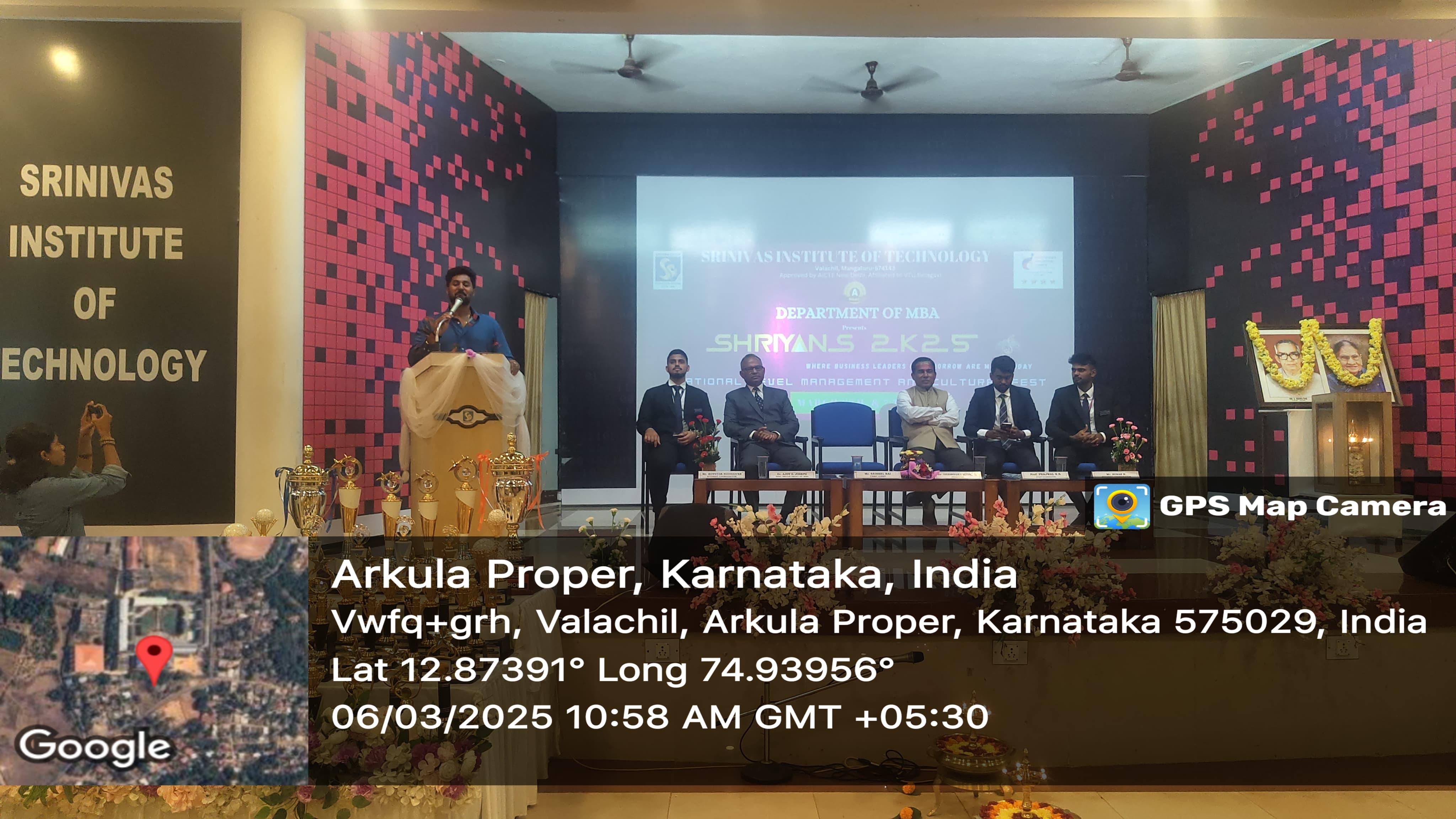 Mangaluru, March 6-7, 2025: The **MBA Department of Srinivas Institute of Technology, Valachil** successfully organized a **two-day UG and PG National Level Management and Cultural Fest – Shriyans-2K25**. The event was inaugurated by **Mr. Saiheel Rai**, Host, Actor, Entrepreneur, and Managing Director of Sai Productions, The Event Company, Mangaluru. He emphasized the importance of **management skills** and inspired students with live examples of **success stories**.