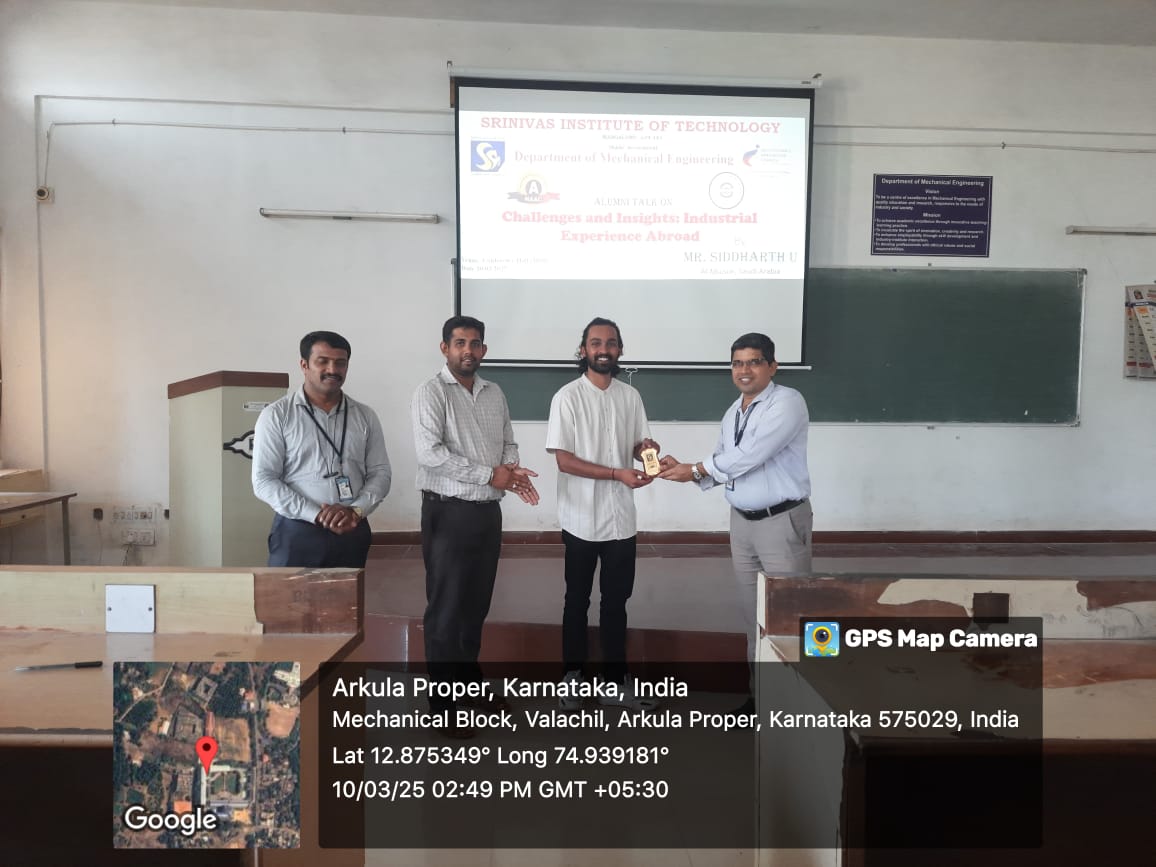 On **March 10, 2025**, **Mr. Siddharth U**, an alumnus of **Srinivas Institute of Technology**, shared his **experiences working abroad** at **Al-Muzain Company, Saudi Arabia**. He spoke about **challenges faced in the global job market**, **cultural adjustments**, and the **importance of unique skills**. The event was attended by faculty and students, with **Dr. Shankar K S**, HoD of Mechanical Engineering, expressing gratitude for the insightful session.