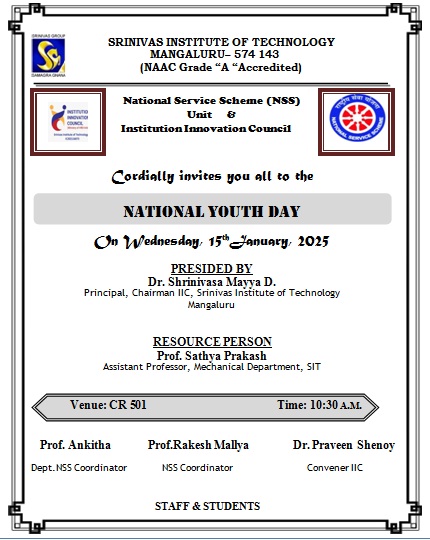 SRINIVAS INSTITUTE OF TECHNOLOGY, MANGALURU Institution's Innovation Council (IIC) In commemoration of National Youth Day, the Institution's Innovation Council (IIC) organized an inspiring and insightful talk titled "Empowering Budding MBA Students to Start & Handle Business" on 15th January 2025...