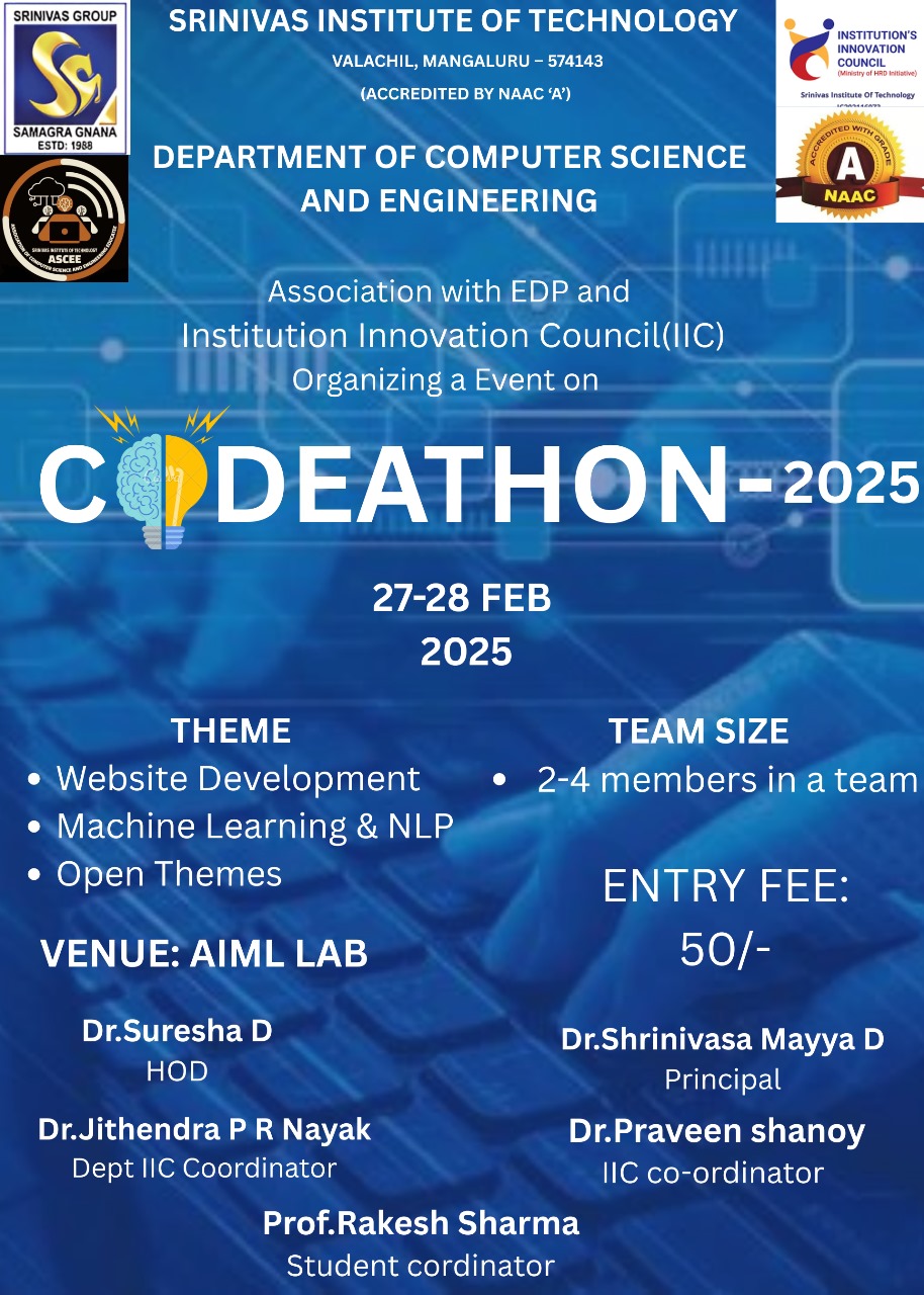 SRINIVAS INSTITUTE OF TECHNOLOGY, MANGALURU Department of Computer Science and Engineering The Department of CSE, in association with the Institution's Innovation Council (IIC) and EDP, successfully organized Codeathon– Coding Master on February 27-28, 2025, with 21 teams competing across diverse domains...