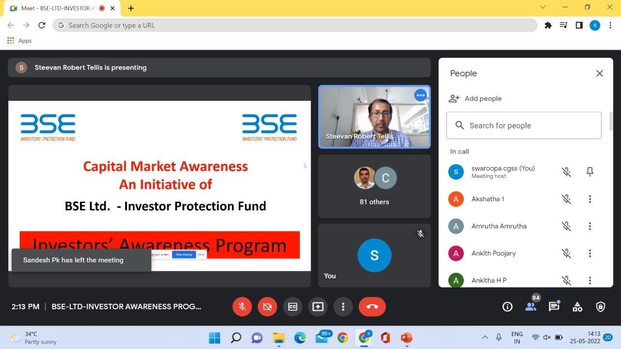 A webinar did on topic of “Capital market awareness” to the final year degree students of Govt. First Grade College, Punjalkatte on 25/5/2022.
