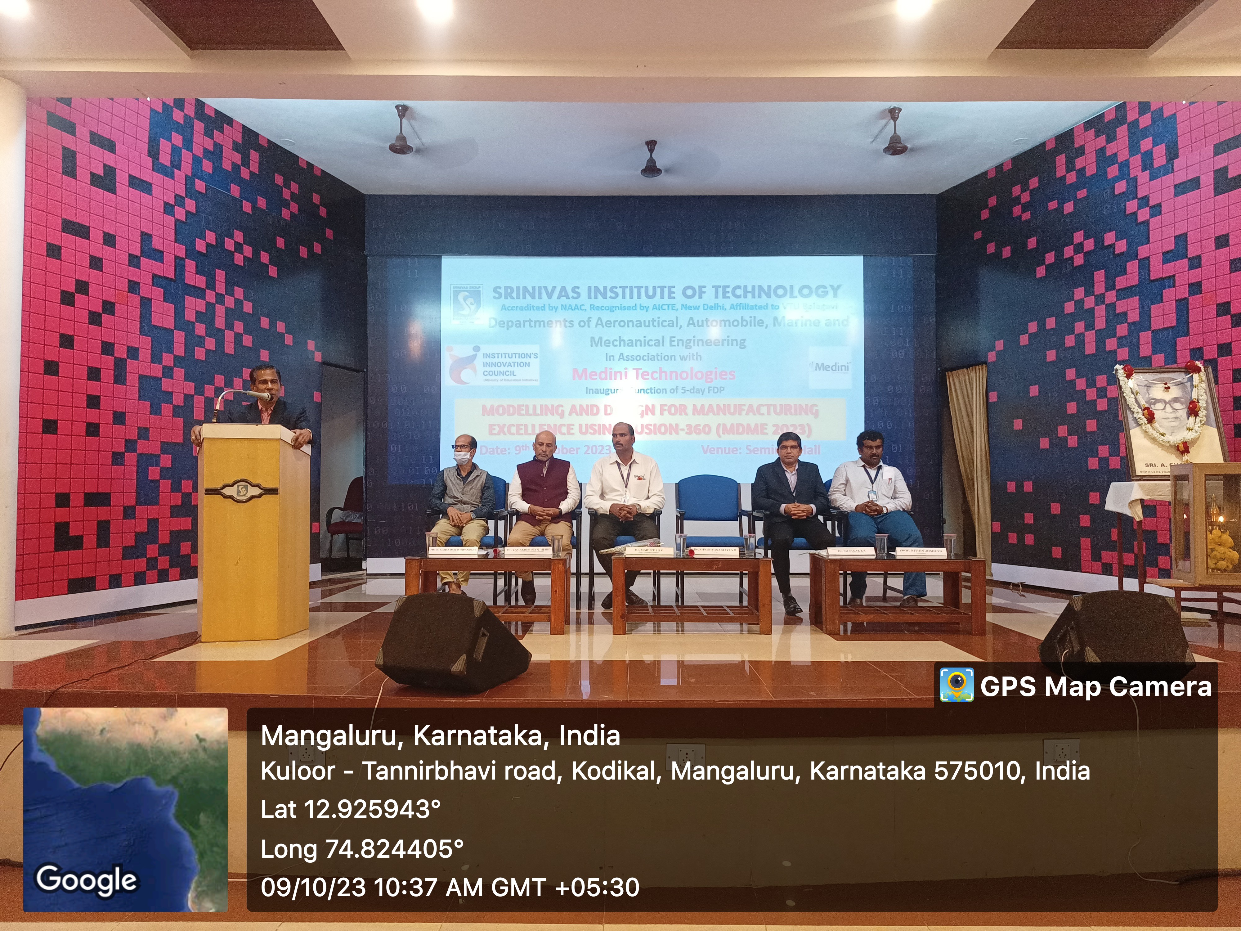 The inauguration of 5 days Faculty Development Programme (FDP) on “Modelling and design for Manufacturing Excellence (MDME)” was held on 09/10/2023. The FDP was organized jointly by the departments of Mechanical, Marine, Automobile and Aeronautical Engineering, Srinivas Institute of Technology, Valachil, Mangaluru. The Programme was presided by Dr. Shrinivasa Mayya D, Principal, Srinivas Institute of Technology, Valachil, Mangaluru and Mr. Maruthi G V, Design engineer, Medini Technologies was the chief guest. Dr. Shankar. K.S, HoD, Department of Mechanical Engineering, briefed about the FDP and gave insight into the FDP. Mr. Maruthi G. V, in his inaugural speech,gave suggestions for the skill set improvement and explained how these FDPs will help to improve the skill sets in the field of design, modeling, analysis or manufacturing. In his presidential address, Dr. Shrinivasa Mayya D, Principal, Srinivas Institute of Technology, Valachil, Mangaluru, called the faculties to update their skillsets by attending such FDPs. Programme began with a prayer from Ms. Sharanya, 7th semester Student for Aeronautical department. Prof. Nithin Joshuva, Joint Coordinator of the FDP welcomed the gathering and Prof. Mohd. Gowspeer, Joint Coordinator of the FDP thanked the participants. The programme was compered by Prof. Vivek Vijay Kumar, Assistant Professor, Dept of Marine engineering.