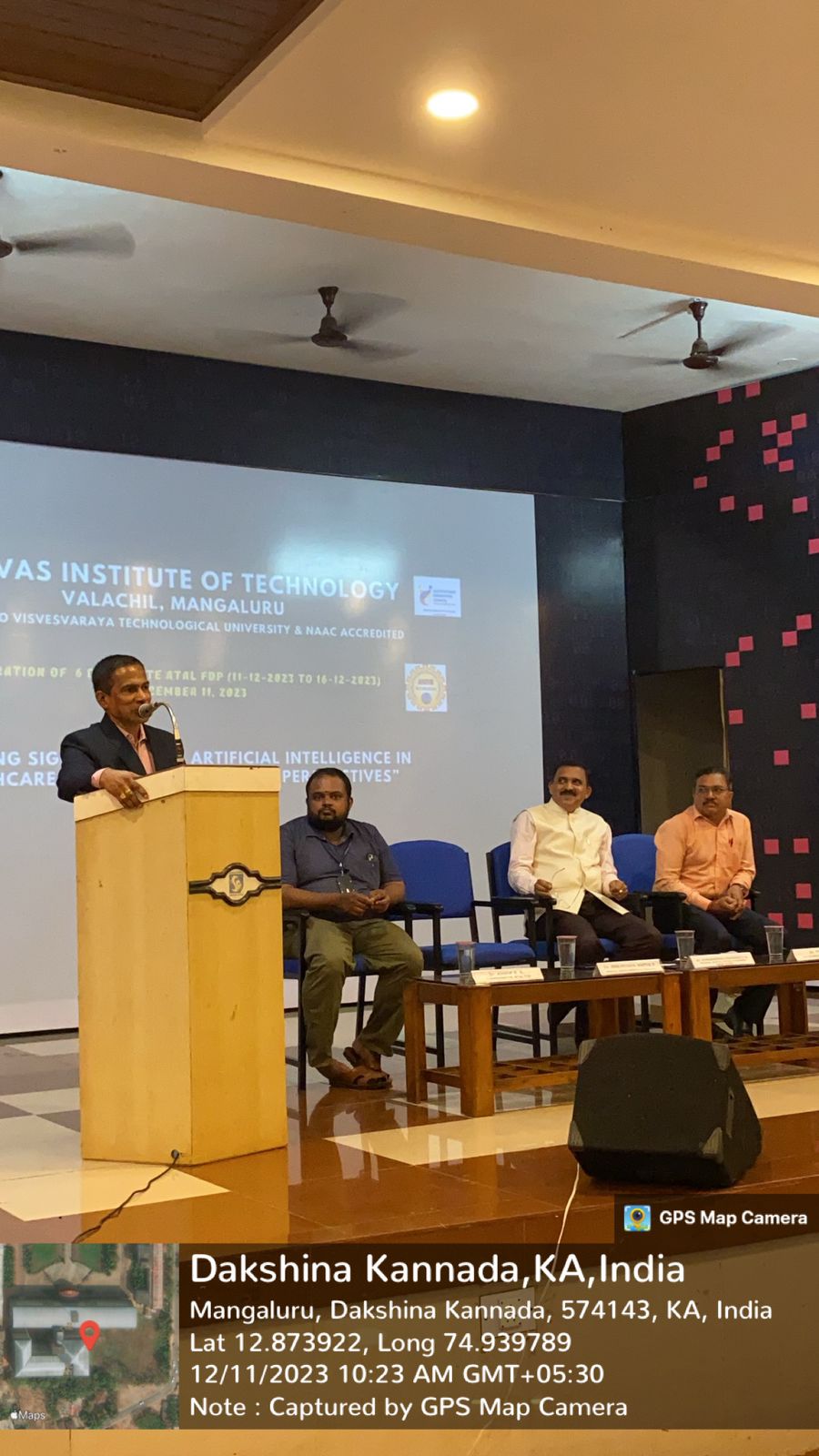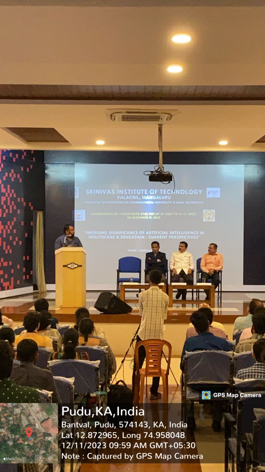 The inauguration of the ATAL Faculty Development Program (FDP) on the Emerging Significance of Artificial Intelligence in Health Care and Education, Current Perspectives took place on 11th December 2023 at Srinivas Institute of Technology, Mangaluru. The event commenced with a prayer led by Yashmitha and her team, followed by the traditional lighting of the lamp.Chief Guest Address Dr. Ramakrishna Shabraya, the esteemed Principal of Srinivas College of Pharmacy, served as the chief guest for the occasion. In his address, he delved into the growing impact of Artificial Intelligence in the fields of health care and education. His insights provided a valuable perspective on the current trends and future possibilities in these domains. Dr. Srinivasa Mayya D, the President of the ceremony and Principal of Srinvas Institute of Technology, emphasized the transformative potential of Artificial Intelligence in shaping the future of education and healthcare. His address highlighted the importance of staying abreast of technological advancements for educators and healthcare professionals alike.Dr. Anoop B K and Dr. Prasad P, the coordinators of the ATAL FDP, introduced the program, outlining its objectives and the specific focus on Artificial Intelligence. They provided an overview of the upcoming sessions, emphasizing the practical insights participants could gain.Prof. Vivek Kumar, in his welcome speech, set the tone for the FDP by underlining the critical role of Artificial Intelligence in the contemporary landscape of education and healthcare. He expressed gratitude to the participants guests and organizers for their involvement in this pioneering initiative.Prof. Parvathraj K M M conveyed sincere thanks to all attendees collaborators and sponsors who contributed to the success of the inauguration. His words of appreciation acknowledged the collective effort invested in making the event possible.The inauguration ceremony not only marked the commencement of the ATAL FDP but also served as a platform to explore the dynamic intersections of Artificial Intelligence in healthcare and education. As the program unfolds, participants are anticipated to gain valuable insights and skills, fostering innovation and progress in their respective fields.