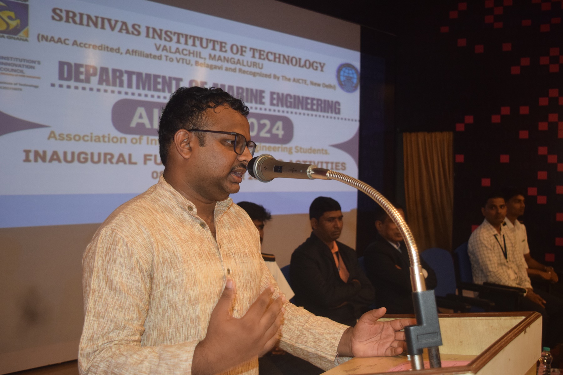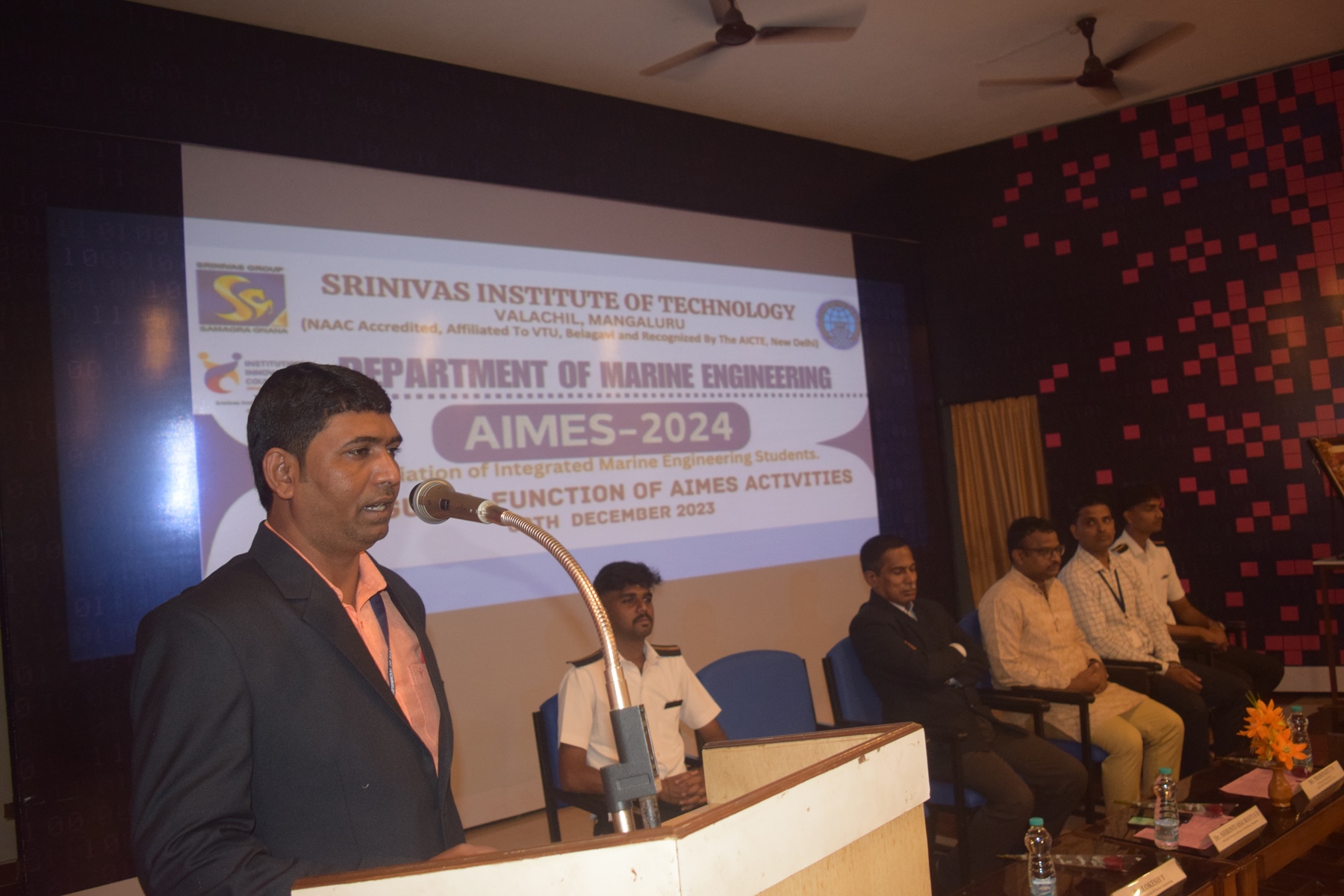 The Inaugural function of Marine Student Association AIMES-2023-24 was held on 8th December 2023 at Srinivas Institute of Technology, Valachil, Mangaluru. Mr. Prasenjit T S, alumnus and PMS Data Administrator at Apollo Ship Management Pte.Ltd was the chief guest for the function. The function was presided by Dr. Shrinivasa Mayya D, Principal of Srinivas Institute of Technology.Dr. Shrinivasa Mayya D highlighted the seamless integration of Information Technology into the maritime field, underscoring the abundant opportunities available for marine engineers. He expressed delight in sharing the stage with a distinguished alumnus and commended the student association's pre-inaugural activities, urging students to actively participate. The esteemed chief guest emphasized the applicability of marine engineering knowledge in securing IT positions within the marine sector and assured ongoing support for students. He expressed gratitude to the organizers for extending the invitation.Dr. Lokesh V, Head of Marine Engineering, encouraged students to use college resources efficiently for smooth event planning. He thanked the distinguished guests for taking the time to attend despite busy schedules. Dr. Lokesh V stressed the importance of connecting with industry professionals, emphasizing that events like these provide valuable opportunities for students to engage with experts in their fields.Dr. Shankar KS, Head of the Mechanical Engineering Department, Dr. Dheeraj Hebri, Head of the Training & Placement Department, along with faculty members from various departments, witnessed the function. The program was coordinated by Prof. Sunil Prakash R, AIMES Faculty Advisor. Mr. Karthik H K, AIMES President welcomed the gathering. Mr. Haroon M Nadaf, AIMES Secretary delivered vote of thanks. Mr. Prithuesh P B, 5th Semester Marine Engineering, introduced the chief guest. Ms. Nithya M R and Mr. Jude A James, 7th Semester Marine Engineering, were the masters of ceremony.