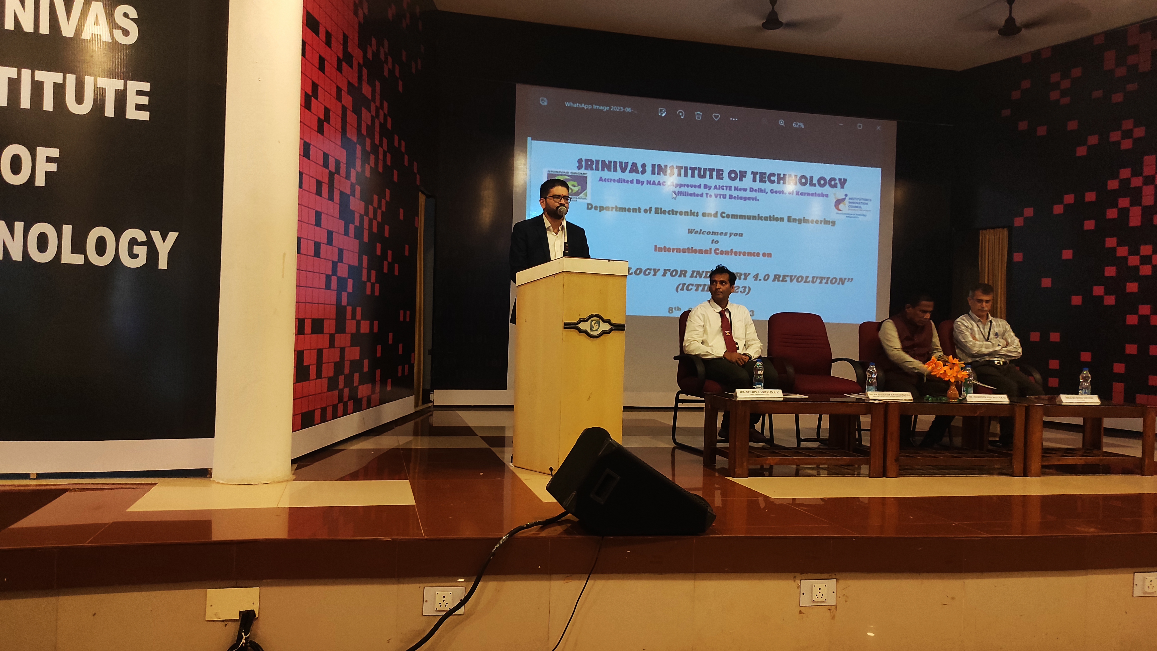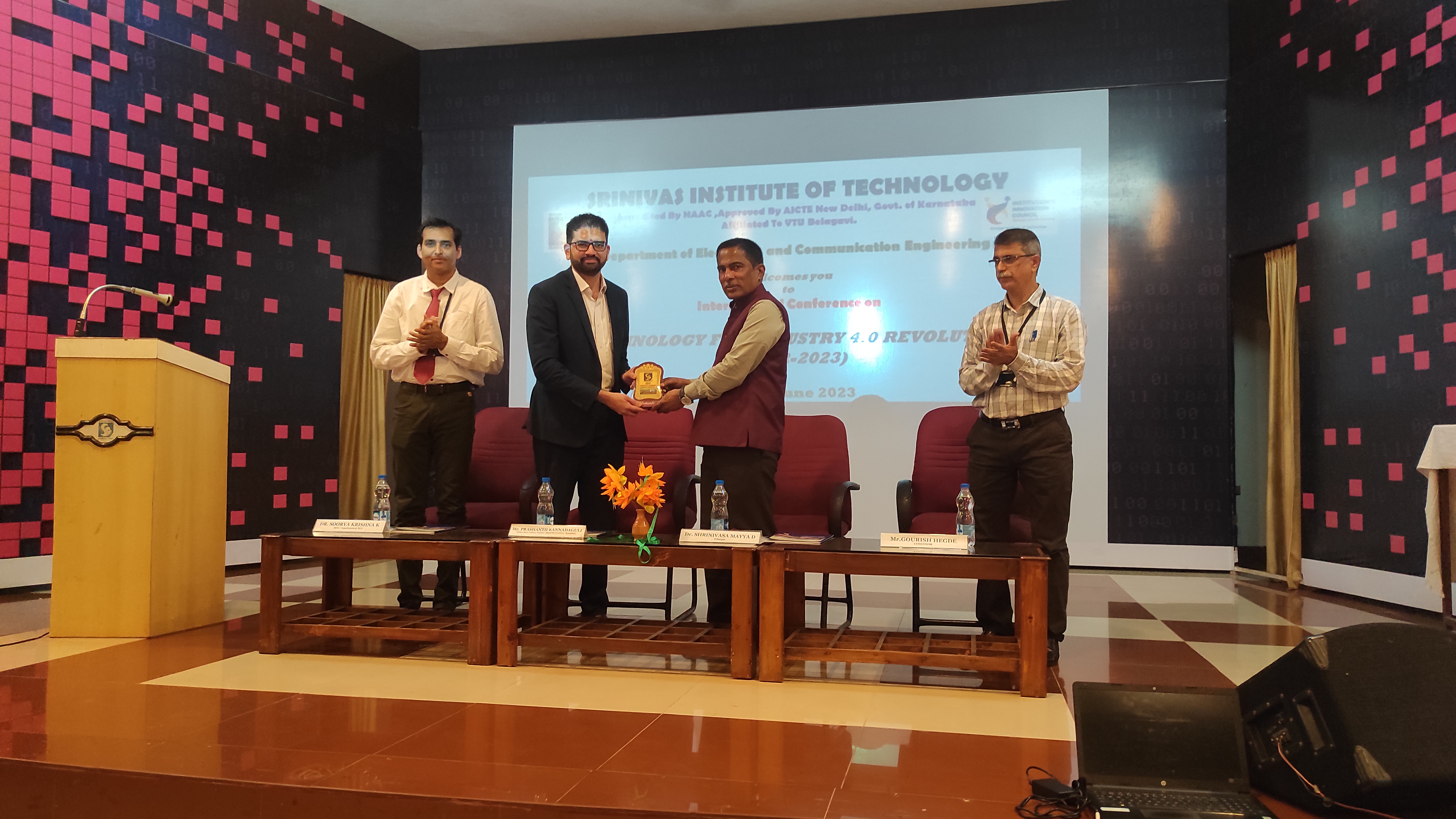 The International Conference on Technology for Industry 4.0 Revolution (ICTIR - 2023) organized by the Department of Electronics and Communication Engineering took place on June 8-9, 2023, at the AC Seminar Hall. The President of the function, Dr. Shrinivas Mayya D, Principal of Srinivas Institute of Technology, Mangalore, inaugurated the conference by lighting the lamp on June 8, 2023. In his address, he emphasized the importance of the international conference in helping students refine their skills and abilities, indicating the value of such events in fostering their growth.Mr. Prashanth Kannadaguli from Dharini Academy served as the chief guest of the function. In his speech, he urged the students to stay updated with the latest trends in technology, recognizing the significance of being aware of emerging developments in the field.Dr. Soorya Krishna K, the Head of the Department (H.O.D) of Electronics and Communication Engineering, welcomed the gathering and introduced the chief guest, Mr. Prashanth Kannadaguli. Mr. Gourish S Hegde provided a brief overview of ICTIR-2023, giving attendees a glimpse into the conference's objectives, themes, and significance. Mrs. Marina Chandy and Mrs. Sahana Girish served as the Masters of Ceremony (MCs) for the program, guiding the proceedings and ensuring the smooth conduct of the event.The conference featured two keynote addresses. Mr. Prashanth Kannadaguli delivered the first keynote address on The Machine Learning Process. His speech covered the principles, techniques, and applications of machine learning within the context of Industry 4.0.The second keynote address was given by Dr. Vivek from the University of Technology and Applied Science in the Sultanate of Oman. He spoke on the topic of Transforming Distributed Sensor Networks with Compressive Sensing. In total, the conference featured 25 paper presentations from various engineering colleges. These papers likely covered a wide range of topics related to Industry 4.0, including technologies, applications, research findings, and innovative solutions proposed by participants from different institutions.