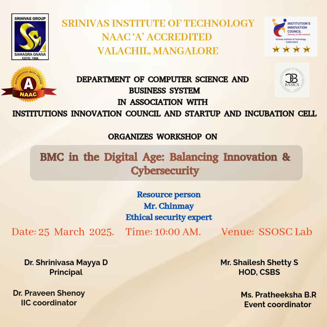 REPORT ON BMC IN THE DIGITAL AGE: BALANCING INNOVATION & CYBERSECURITY The Department of Computer Science and Business Systems (CSBS) at Srinivas Institute of Technology, Valachil, Mangaluru, in association with the Institution's Innovation Council (IIC) and Startup and Incubation Cell, organized a workshop titled BMC in the Digital Age: Balancing Innovation & Cyber security on 25th March 2025. The session aimed to provide students with insights into the Business Model Canvas (BMC) while addressing the crucial role of cyber security in modern digital enterprises. The workshop was conducted at SSOSC Lab and featured Mr. Chinmay, an ethical security expert, as the resource person. The session began at 10:00 AM and saw active participation from students eager to learn about the intersection of business innovation and cyber security. Mr. Chinmay commenced the workshop by explaining the significance of the Business Model Canvas (BMC) in structuring a startup or business idea effectively. He elaborated on the nine building blocks of BMC, which include value propositions, customer segments, channels, customer relationships, revenue streams, key resources, key activities, key partnerships, and cost structure. Emphasis was placed on how digital transformation is influencing modern business strategies and the increasing dependence on technology-driven solutions. In the second half of the session, cyber security and ethical hacking took center stage. Mr. Chinmay discussed the importance of securing digital assets and proactive cyber security measures to prevent cyber threats. He provided an overview of common vulnerabilities businesses face in the digital age, including phishing attacks, ransomware, and data breaches. Hands-on demonstrations of penetration testing tools, network security techniques, and ethical hacking practices helped students understand real-world cyber security challenges. The workshop concluded with an interactive session where students clarified their doubts and explored career opportunities in cyber security and entrepreneurship. It effectively emphasized the importance of balancing innovation with security to build sustainable and resilient businesses in the digital era. Overall, the event was a great success, inspiring students to develop technologically sound and secure business models.