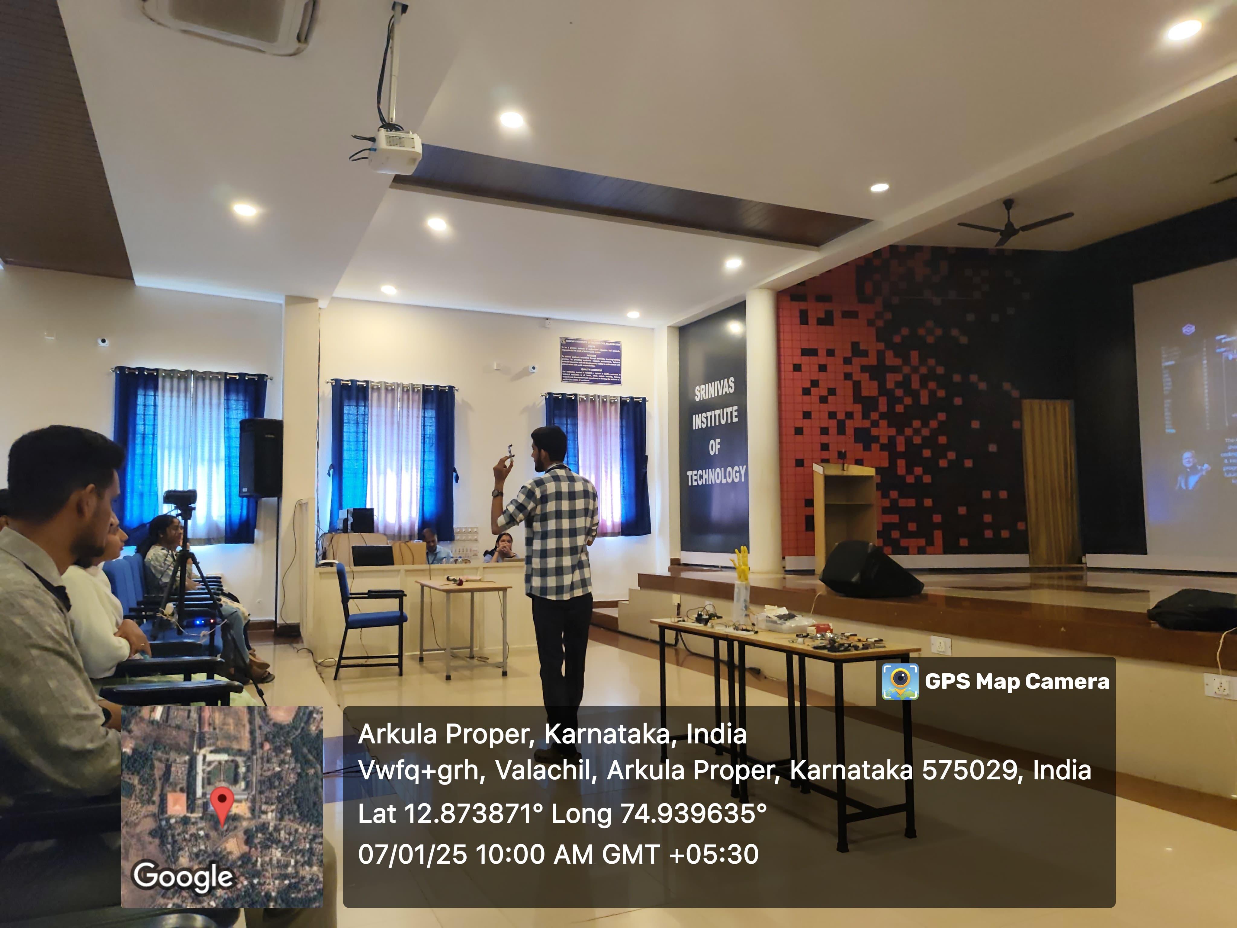 The Department of MCA at Srinivas Institute of Technology, Valachil, conducted an IoT workshop on 7th January 2025, from 9:30 AM to 11:20 AM. The session was led by Mr. Vivek Pai, ATL Mentor of SVS School, Vidhyagiri, along with students Thanish R Shettigar and Ananya Bhat. The event began with a warm welcome for the chief guest, accompanied by a floral presentation by our esteemed Head of Department, Dr. Shashidhar Kini K. The workshop provided students with a foundational understanding of the Internet of Things (IoT) and its core concepts. It introduced popular IoT boards, explored various sensor technologies, and offered valuable guidance on developing IoT-based projects. Practical demonstrations further enriched the learning experience, making complex concepts easier to grasp. The event successfully ignited interest in IoT among students, motivating them to explore this exciting and rapidly evolving field. Participants left with valuable insights and inspiration to pursue innovative IoT applications and projects, contributing to a growing passion for technology and innovation.