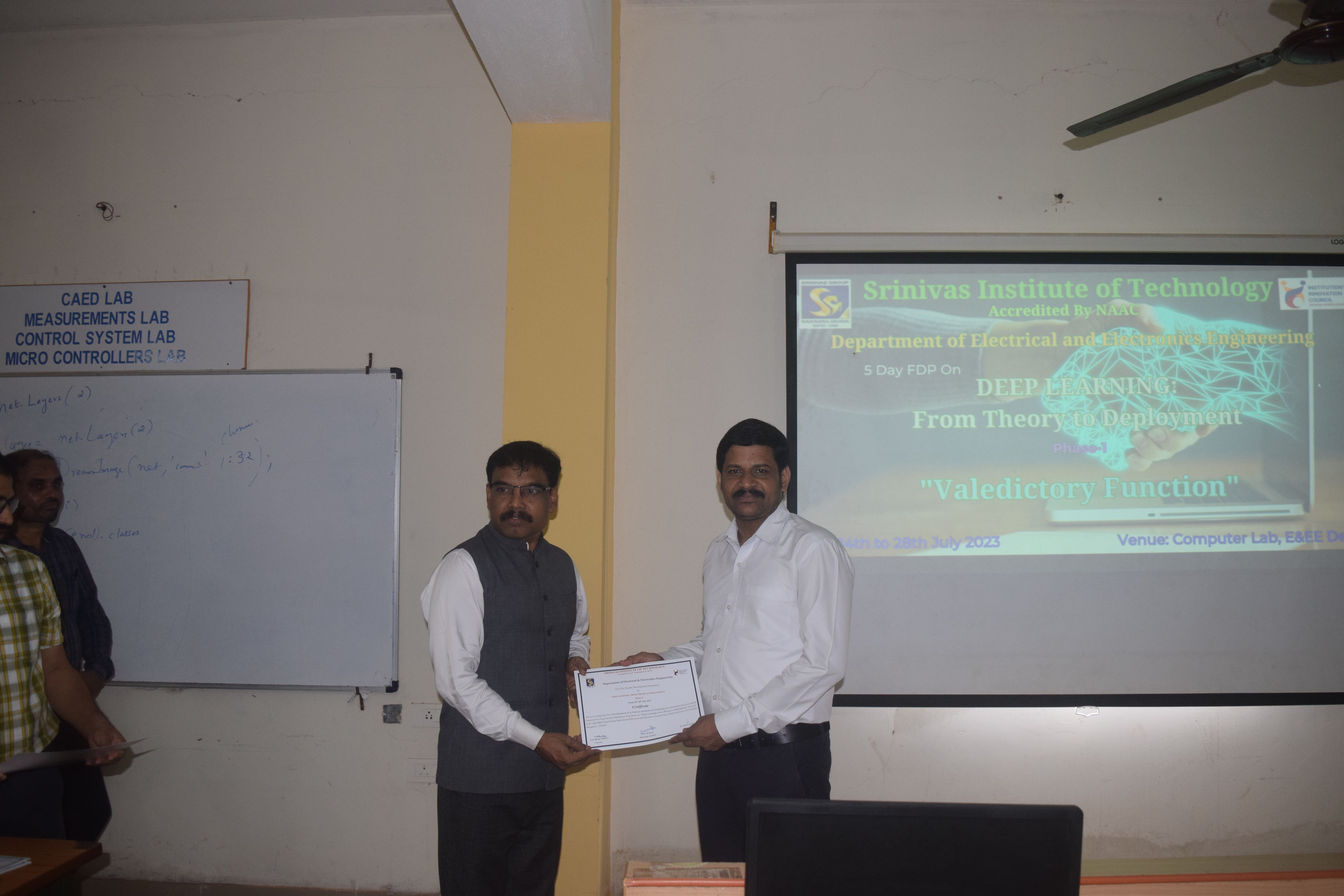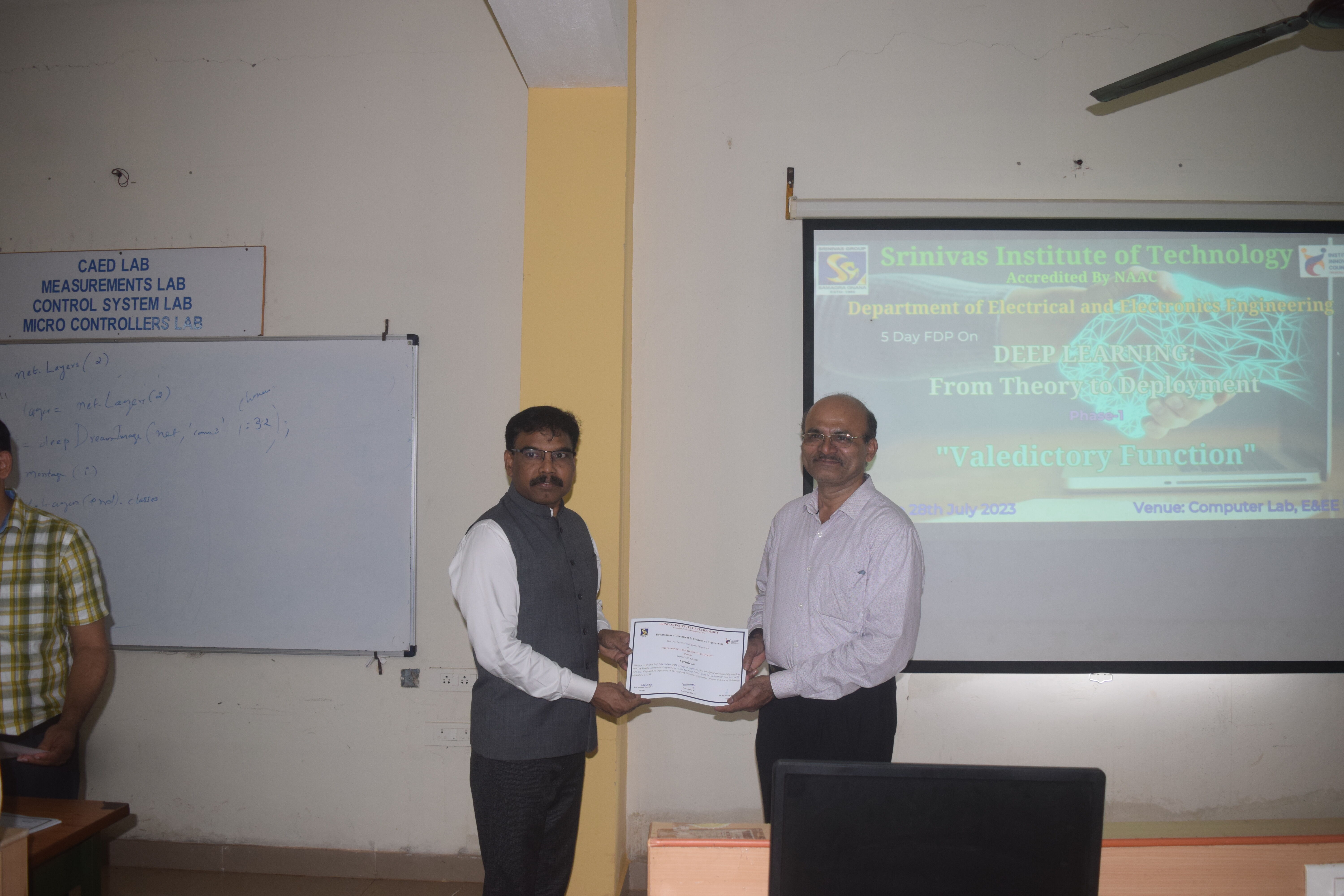 One week Faculty Development Programme (FDP) on “Deep Learning: From Theory to Deployment (Phase 1)” was organized by Department of Electrical & Electronics Engineering, Srinivas Institute of Technology, Mangalure , from 24th July to 28th July,2023. The programme was inaugurated by lighting the lamp by the principal of the college Dr.ShrinivasaMayya D on 24th July at 10am at computer Lab of Electrical Block. In his inaugural address, he advised the participants to utilize all the sessions and gain practical knowledge. The resource person Prof.LokeshaB,Head of EEE department, gave overview of one week FDP. Prof.BheemaShastry welcomed the gathering and Prof. Harshith K proposed the vote of thanks. Master of ceremony for the inaugural function was done by Prof. Ganapathi Sharma and Prof.ShreeramP. Faculty from PA college of Engineering,Canara engineering college and internal faculty from various departments(EC,MR,CS,AIML, Chemistry ,EE)of Srinivas Institute Technology attended the FDP. It was completely a hands-on FDP and participants learned the practical aspects deep learning and its applications. Valedictory function was held on 28th July at 2 pm at computer lab, Electrical Block. In the feedback, participants shared their experience and expressed their desire to attend the Phase 2 of the FDP.Resource person Prof Lokesha Bdistributed the participation certificates to all the participants. Finally one week FDP ended with group photo.