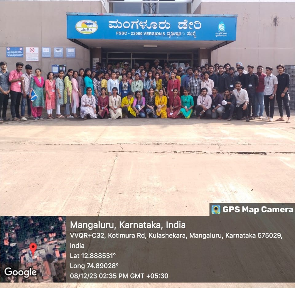 The Department of Computer Science and Engineering, organized an outreach program to Milk diary Kulshekar on 8th December 2023. The Dakshina Kannada Co-Operative Milk Producers Union Limited Mangalore Diary which plays a crucial role in the local community, is a notable establishment involved in the production and distribution of dairy products. It is a large-scale facility equipped with modern machinery for milk processing. Its sources milk from local farmers and processes it into various dairy products, including milk, yogurt, cheese, and more.During our visit, the assigned guide from Kulshekar campus given information on different stages of various milk product processing. The process involves pasteurization, homogenization, and packaging. The dairy adheres to strict quality control measures to ensure the production of safe and high-quality dairy products.Our students took the opportunity to interact with the staff and processing team. They provided insights into their daily operations, challenges faced, and the significance of their work in supporting the local agricultural community.A total of 69 students from 7th semester visited to Dakshina Kannada Co-Operative Milk Producers Campus, Kulshekar, Mangalore. This event was supported by our beloved Principal Dr. Shrinivasa Mayya D and was held under the guidance of Prof. Ravishankara K, Head of the Department, CS&E, Organized by Prof. Deepthi Dsouza, Department Activity Point coordinator and Prof. Guruprasanna J K along with Prof. Anusha, 7th Semester Class Coordinator and Prof. Spoorthi from Department of CS&E..