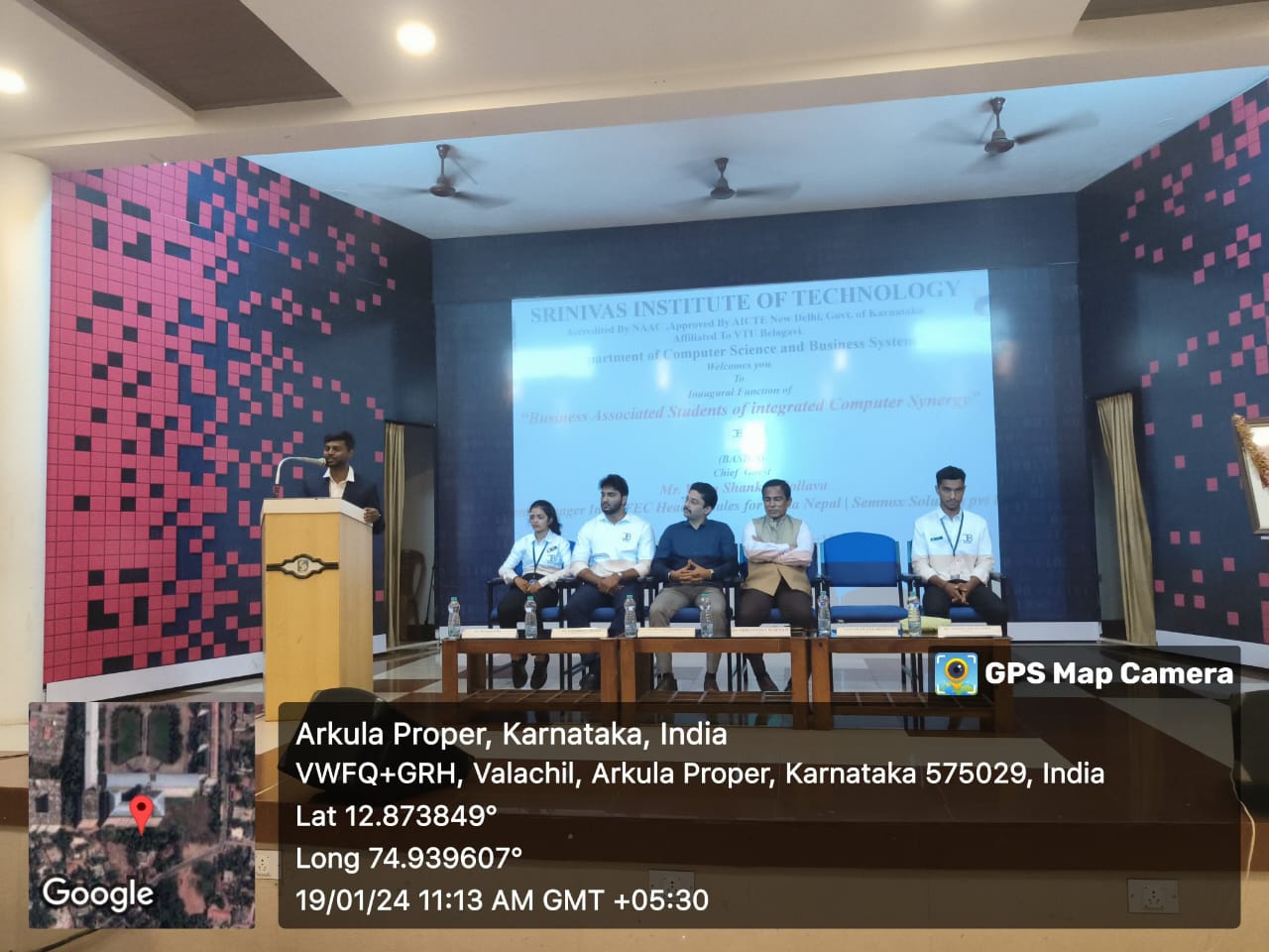 The association inaugural function of Basics (Business Associated Students of Integrated Computer Synergy) was held on 19th December 2023.The event was invocated by Poorvika and Chaitra of 3rd Sem CSBS followed by welcome address by Ms. Rithika, Assistant Professor. Mr. Shailesh Shetty S, HOD, Department of CSBS was present at the event. The association was inaugurated by the chief guest, Mr. Vidya Shankar Bollava Client manager India FEC Heading sales for India Nepal.The inaugural function was presided by Dr.Shrinivasa Mayya D where he appreciated the efforts in making associations and opportunities offered by college in an over-all development, coming together of diverse ideas, promote more events and programs and enhance skills. Ms. Harshitha, Secretary of BASICS gave introduction to the chef guest. The inaugural ceremony was followed by a talk by the chief guest on ‘Effective way of learning’ where he highlighted that learning isn’t limited to college, importance of settling down, preparation for placements, happenings of corporate world, being part of events. The event continued with Mr. Shailesh Shetty S, HOD of CSBS extending congratulations to the office bearers of the associations. The event was followed by complete action plan for academic year 2023-24 was presented by President of BASICS by Mr.Pavin. The function was concluded with a vote of thanks delivered by Mr. Gautham Shetty, the Association Coordinator of BASICS.