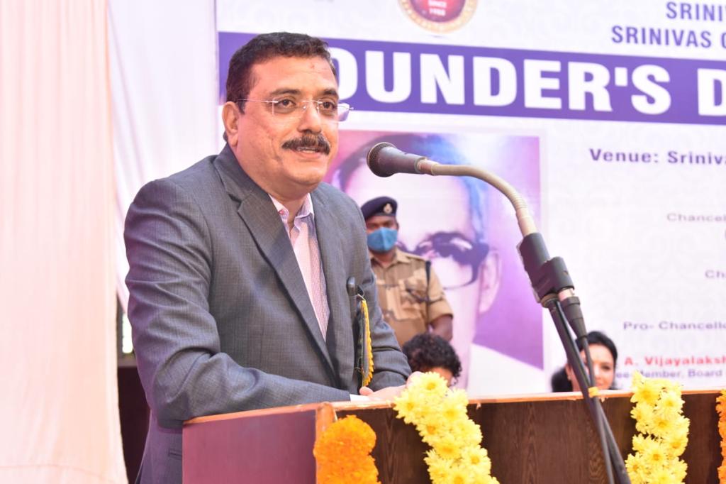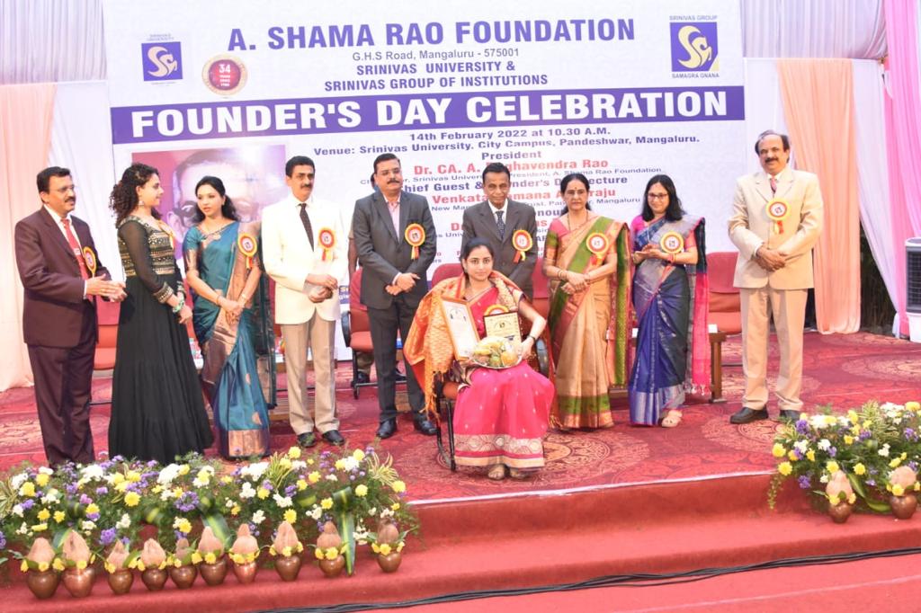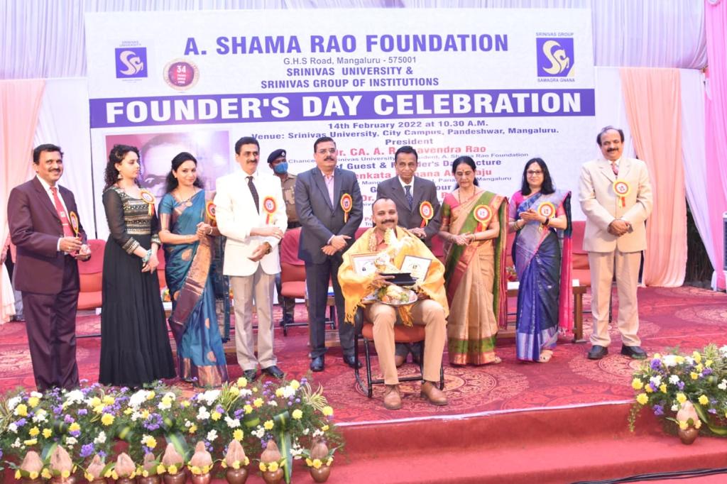 Founder's Day celebration of Srinivas University was organised on 14 February 2022 at Srinivas College Quadrangle, Pandeshwara Campus. Dr Venkata Ramana Akkaraju, Hon'ble Chairman of New Mangalore Port Trust was the Chief Guest of the program. Dr CA A Raghavendra Rao, Hon'ble Chancellor of Srinivas University and President of A Shama Rao Foundation Mangaluru presided over the program. Dr A Srinivas Rao (Hon'ble Pro Chancellor, Srinivas University and Vice President of Srinivas Group of Institutions), Smt A Vijayalakshmi R Rao (Trustee-Member, Board of Governors, Srinivas University), Prof Er Smt A Mitra S Rao (Trustee-Member, Board of Governors, Srinivas University), Dr P S Aithal (Vice Chancellor), Dr Sushma Kesari and Kumari Meghana were present on the dais. Pro Chancellor of Srinivas University, Dr A Srinivas Rao Ji delivered the welcome address. Dr Srinivas Rao briefed the glory of Srinivas University since its inception and the various milestones achieved. Dr Anil Kumar paid homage to the founder Shri A Shama Rao on the occasion of 113th Birth Anniversary. Dr Anil Kumar has given a bird's eye view of Srinivas University. Dr Anil Kumar said that more than twelve thousand students are studying in 82 different programmes at three campuses and around four thousand faculty and staff members are serving the University. In his inaugural address, Dr Venkata Ramana Akkaraju quoted the sayings of renowned Telugu Poetess Sumati and said that Parents will feel proud and satisfied when their Children become Able and Nobel person in the society, achieve success in their life and the glory of success is carry forwarded by the next generation. Dr Venkata Ramana Akkaraju said: Our Dr Raghavendra Rao Ji, because of his hard work, because of his dedication, has made an institute with 7 people from scratch to a State Level Private University. There is a need to reduce the gap between Institute and Industry. Srinivas University is working in this direction which is commendable and this University will become a world class university. Vidya dadaati Vinayam, i.e. Education gives obedience, and this obedience makes you eligible, this eligibility (ability) facilitates you to earn money and success. Once you earn money by following Dharma, definitely you will contribute it to the society and this will give you peace of mind. Every one of us should recognize what is our accountability to the society, and how best we can contribute to the upliftment of the society. Students should inculcate 5 qualities, namely, Kakacheshta, Bakodhyana, Shwana Nidra, Mitahaari and Brahatyagi, in order to get success in their life. Teachers also have responsibilities, they should have interest in what they teach, should know how to teach, how to make it interesting, and should be a role model for the students. Qualities of good students and Expectations of good teachers, both coupled together will solve almost 90% problems in an educational institution. India is a country with 137 crore population with different cultures and languages, but still we are all one, we believe in Unity in Diversity. Our country is fundamentally dependent on democracy, our constitution. Education institutes play an important role in making children the responsible and good citizens of this nation. Contribute your earnings to the society in the form of charity, either in the form of education or healthcare. Try to become entrepreneurs. Think with innovation, and work to Make India competitive. Knowledge, Creativity and Courage will make you a world class citizen. India is a land of sandalwood, land of greetings, land of delivery, land of gratification, we live here, this is our Karma Bhoomi. Let’s work hard, not only for ourselves, let’s work for the society, let’s work for the people around, let’s work for our State and Nation with our innovation, dedication, knowledge, entrepreneurship and with our hard work. Let’s make the dream of our Hon’ble Prime Minister Shri Narendra Bhai Modi Ji to reach a 6 trillion dollars economy by 2025. In his Presidential remarks, Hon’ble Chancellor of Srinivas University, Dr CA A Raghavendra Rao Ji said that with the vision of Jagte Raho Bharat and Udte Raho Bharat, we all should work for the Nation. Dr Raghavendra Rao said, one of the greatest charities is Vidya Dana. We are providing knowledge and skills development training to all the students of Srinivas University to ensure better employment. In this direction, the Center of Excellence has been set up to provide skill development training programmes at the Engineering College campus in Mukka. Srinivas University is a mini India. There are students from all the states of India. We have started MBA programmes in a number of disciplines, in order to promote the people who are serving in private and public sector organisations. Dr Raghavendra Rao Ji said that the curriculum in Srinivas University will be updated in each academic year and in each semester, to compete with changing technology in the industry. On this occasion, Shri Ramananda (Hindi Language Teacher, Govt English Medium High School, Daddal Kadu, Bantwala) and Dr Saroja M (Lecturer in Biology, Bhandarkar's PU College, Kundapura) were felicitated with A Shama Rao Memorial Outstanding Teacher Award 2021-22 for their contribution in the field of Education in the undivided Dakshina Kannada district. Smt C S Radhika (Female Ambulance Driver, Cauvery Ambulances, Kulai) and Shri Varun Alva (Asst Sub Inspector, Reserve Police, Mangaluru) were felicitated with A Shama Rao Memorial Award 2021-22 for their outstanding service in the field of Social Service and Bravery respectively. On this occasion, Dr Sandhya Shenoy of Srinivas University was felicitated for her contribution in the field of Research. Shri Charles K C, Student of Srinivas University was also felicitated for his international recognition in the field of arts and painting. In addition, twelve Ph.D degree awardees and eight gold medal achi
