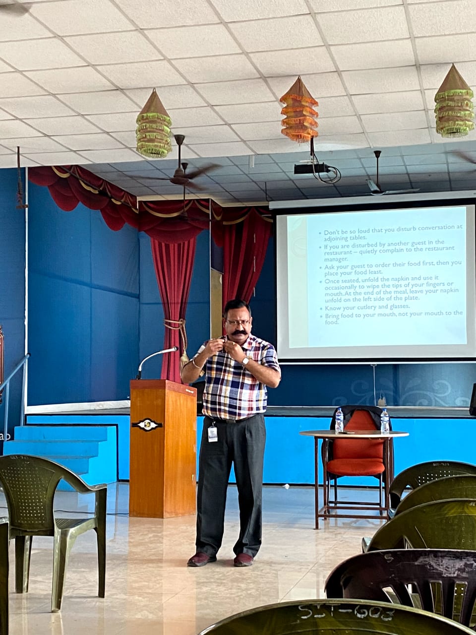 Department of MBA had organised a guest lecture on the topic “Dining Etiquttes” to the students of 1st year MBA on 26th August 2022 in the college Auditorium. Prof. Swaminathan. S, Dean, Institute of Hotel Management & Tourism, Srinivas University was the resource person for the session. Head of the Departement Dr.Ajoy S Joseph and other faculty members were present on the occasion.