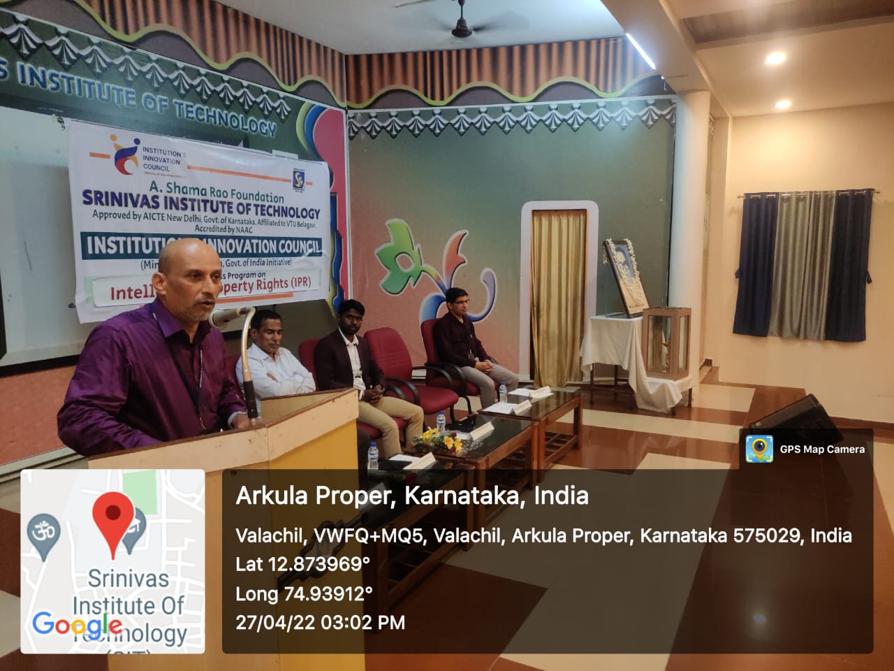Institution's Innovation Council (IIC) in association with the Intellectual Property Rights (IPRs) Cell has organized an Awareness program on Intellectual property rights (IPRs) under Kalam Program for Intellectual Property Literacy and Awareness (KAPILA) in association with AICTE and National Intellectual Awareness Property Mission (NIPAM) on 27th April 2022 at the institute's Seminar hall. Presiding over the inaugural session, the Principal, Dr. Shrinivasa Mayya D., who is also the President of IIC, encouraged students to get awareness on the IPRs that will help them in the process of innovation. The convener of the IIC Dr. Ramakrishna N Hegde, elaborated on the various IPRs and how they would help startups in protecting their rights. He also briefed about IIC. Soon after the formal inauguration, Resource Person Mr. Ramashish Paul, Examiner of Patents and Design Intellectual Property Office (IPO), Chennai, handled a session on Awareness program on Intellectual Property Rights (IPR). The session covered topics: basic knowledge of Intellectual property rights (IPR), importance of IP, Patents, Trademarks, Copyrights and also discussed some best practices followed and case studies. Students and faculty of the institute actively participated in the program. Dr. Shankar K S Head of Mechanical department coordinated the event. The Master of Ceremony was done by Prof. Jayaram Thumbe of Mechanical department.