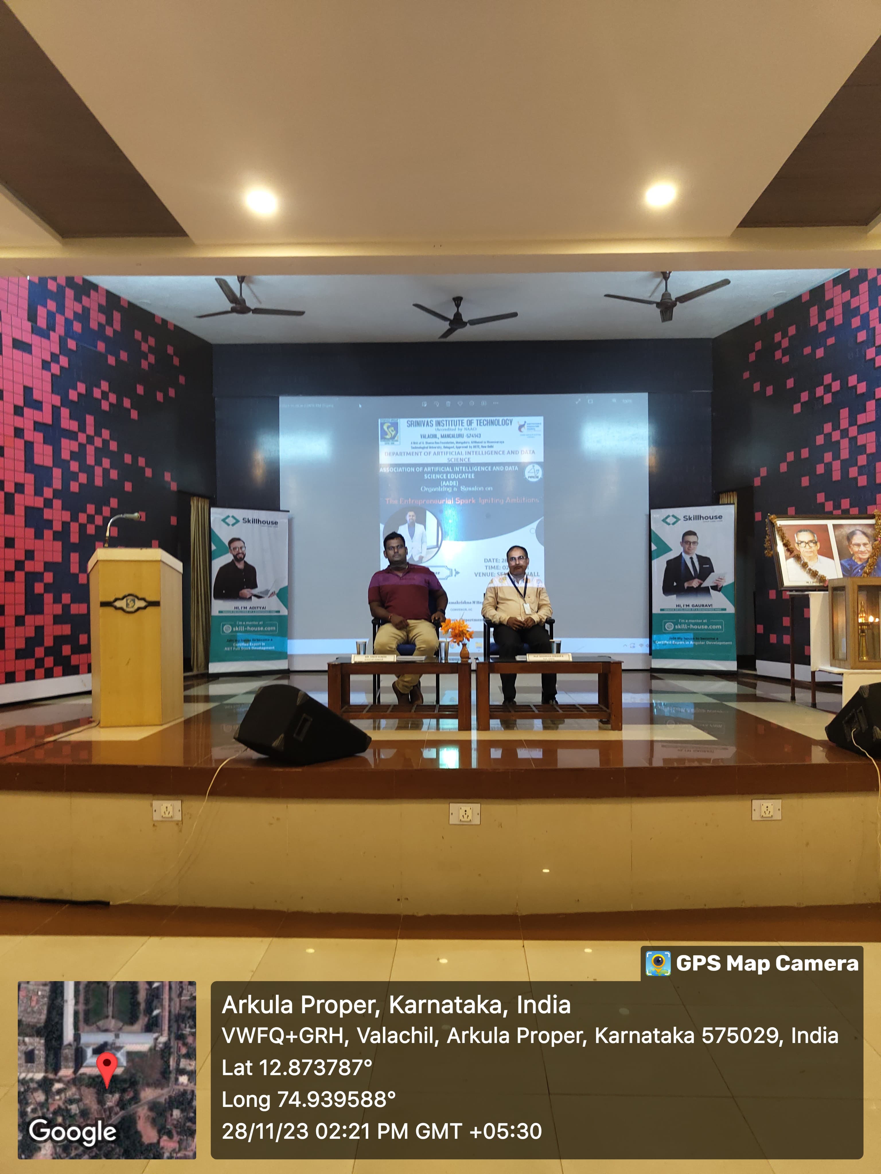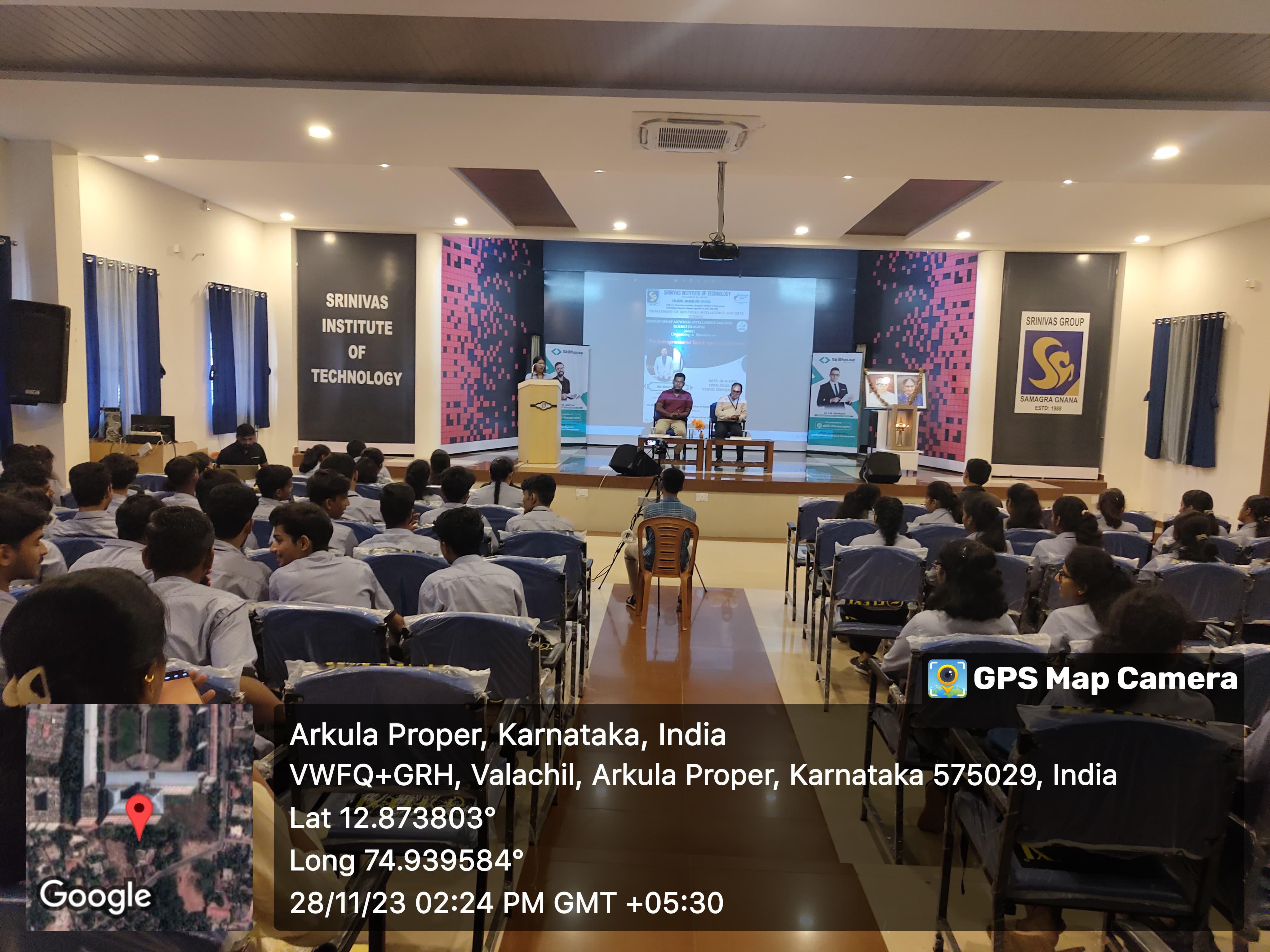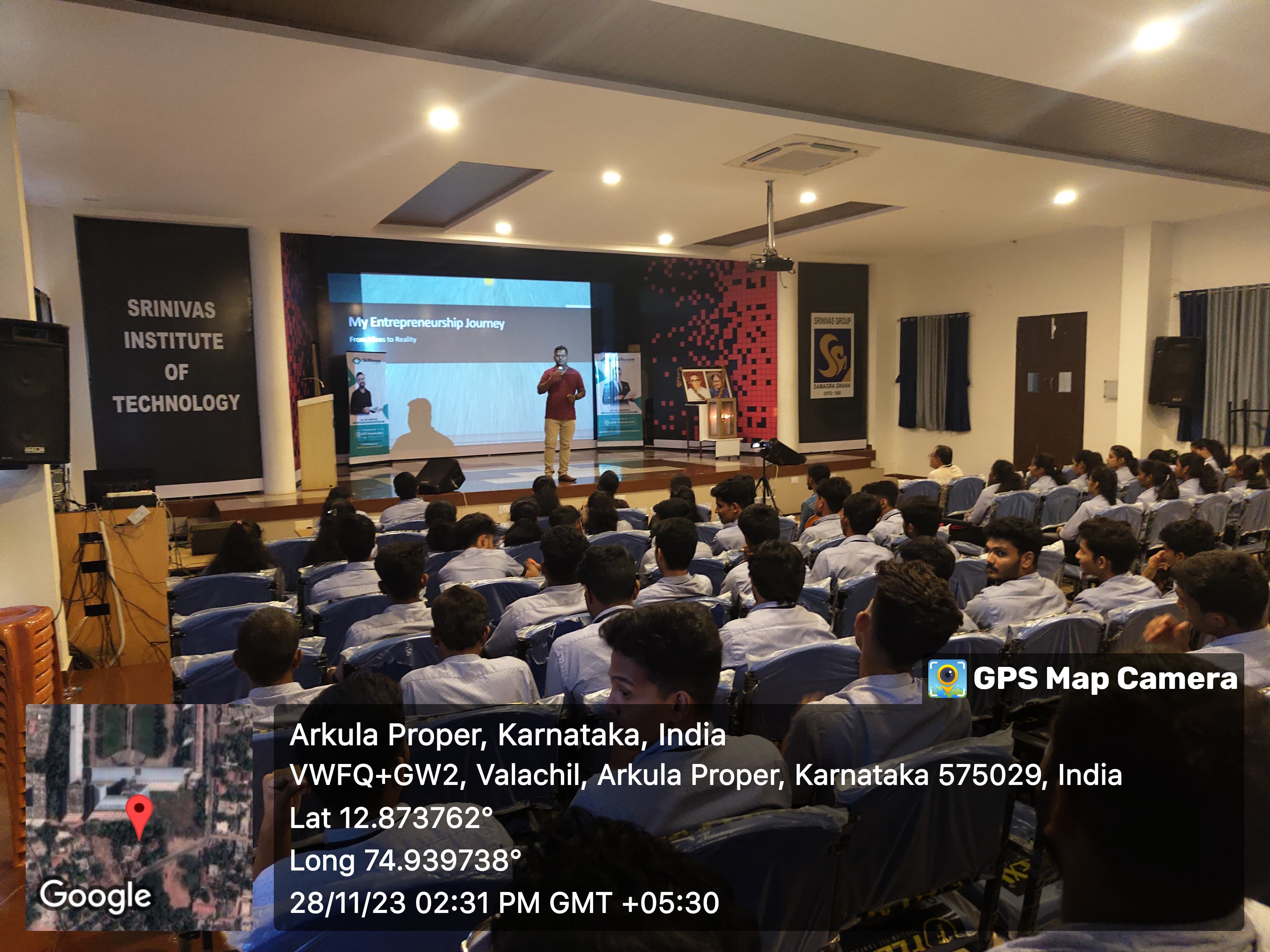 Srinivas Institute of Technology, Valachil Mangaluru, Institution’s Innovation Council (IIC) and Association of Artificial Intelligence & Data Science Educatee organized a session on The Entrepreneurial Spark: Igniting Ambitions on 28th November 2023. Mr. Vinod Kumar, Co-founder and CEO of Aykan and Skill House was the Chief Guest of the function. He in his Chief Guest address highlighted his Entrepreneurial Journey. Ms. Athmi Shetty of 2nd year AI-DS Department welcomed the gathering, and Ms. Anjali Bai of 2nd year AI-DS Department introduced the Chief Guest. Ms. Likitha of the 2nd year AI-DS Department delivered the vote of thanks. Ms. Ganavi of the 2nd year AI-DS Department was the master of the ceremony.The formal function was followed by a talk on The Entrepreneurial Spark: Igniting Ambitions by Mr. Vinod Kumar. The talk was about the journey of an entrepreneur. Resource person has mentioned the changes that happened in a decade in industry and, the challenges faced during the starting of a company. The session provides ideas about the new approach of hiring with Skill House, the goals and visions of the company, and how to identify the value while starting a company. Second-year students of the AI-DS and ISE departments participated in the program.