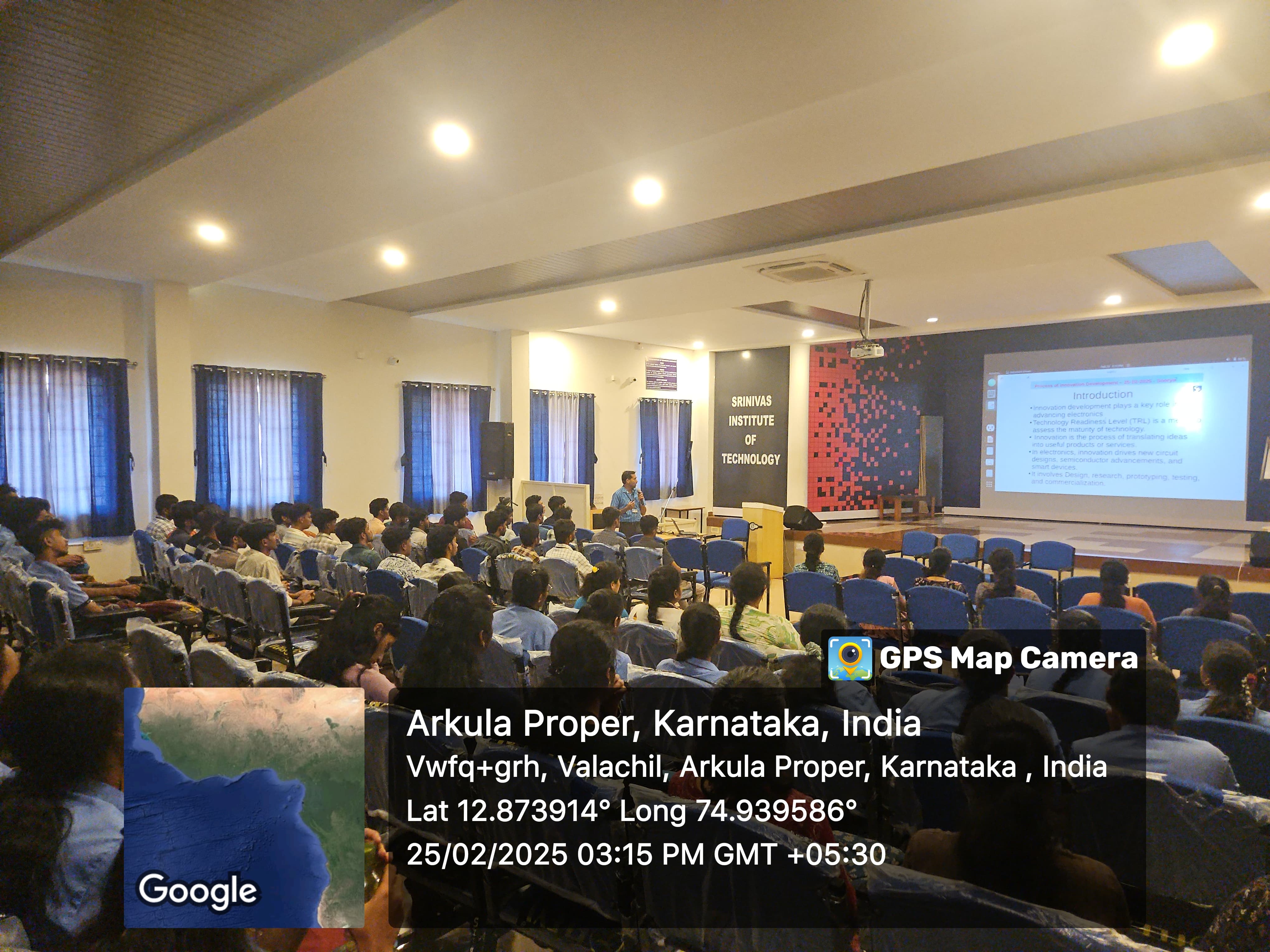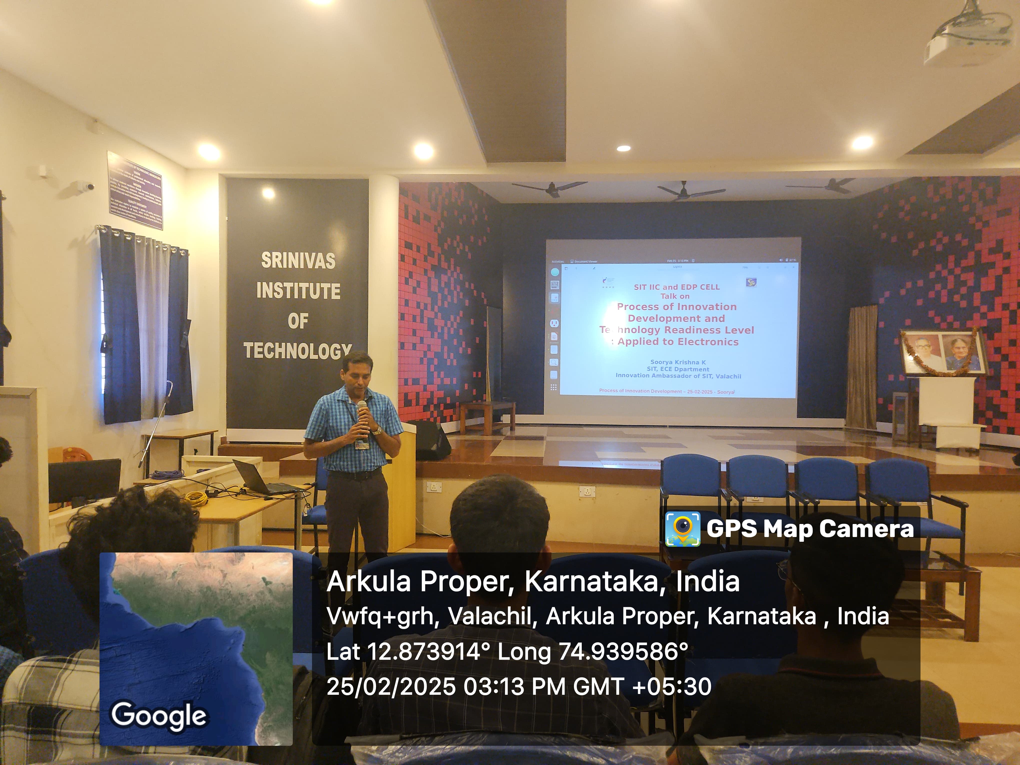 Mangaluru, February 25, 2025: The Department of Electronics and Communication Engineering at Srinivas Institute of Technology, Mangaluru, in association with **STEADY, EDP Cell, and the Institution’s Innovation Council (IIC),** successfully conducted a workshop on *'Process of Innovation Development and Technology Readiness Level - Applied to Electronics'.* The event provided valuable insights into the stages of **innovation development** and the application of **technology readiness levels (TRLs)** in the field of electronics. The workshop was conducted by **Dr. Soorya Krishna K, Head of the Department, ECE,** who shared his expertise on **technological advancements, innovation processes, and industry readiness.** The session covered essential topics such as: - **Technology lifecycle stages** - **Research and development (R&D) strategies** - **Prototyping and commercialization** - **Assessing technology readiness before market deployment** The interactive session enabled attendees, including **students, faculty members, and budding innovators,** to discuss real-world case studies and ask questions about **innovation development in electronics.** The participants appreciated the **practical approach and industry relevance** of the workshop. The event was **successfully coordinated** by **Prof. Flavita Janice Pinto, Staff Coordinator, ECE.** The workshop provided a **comprehensive understanding** of how innovations **progress from conceptualization to real-world applications,** making it an enriching experience for all attendees.
