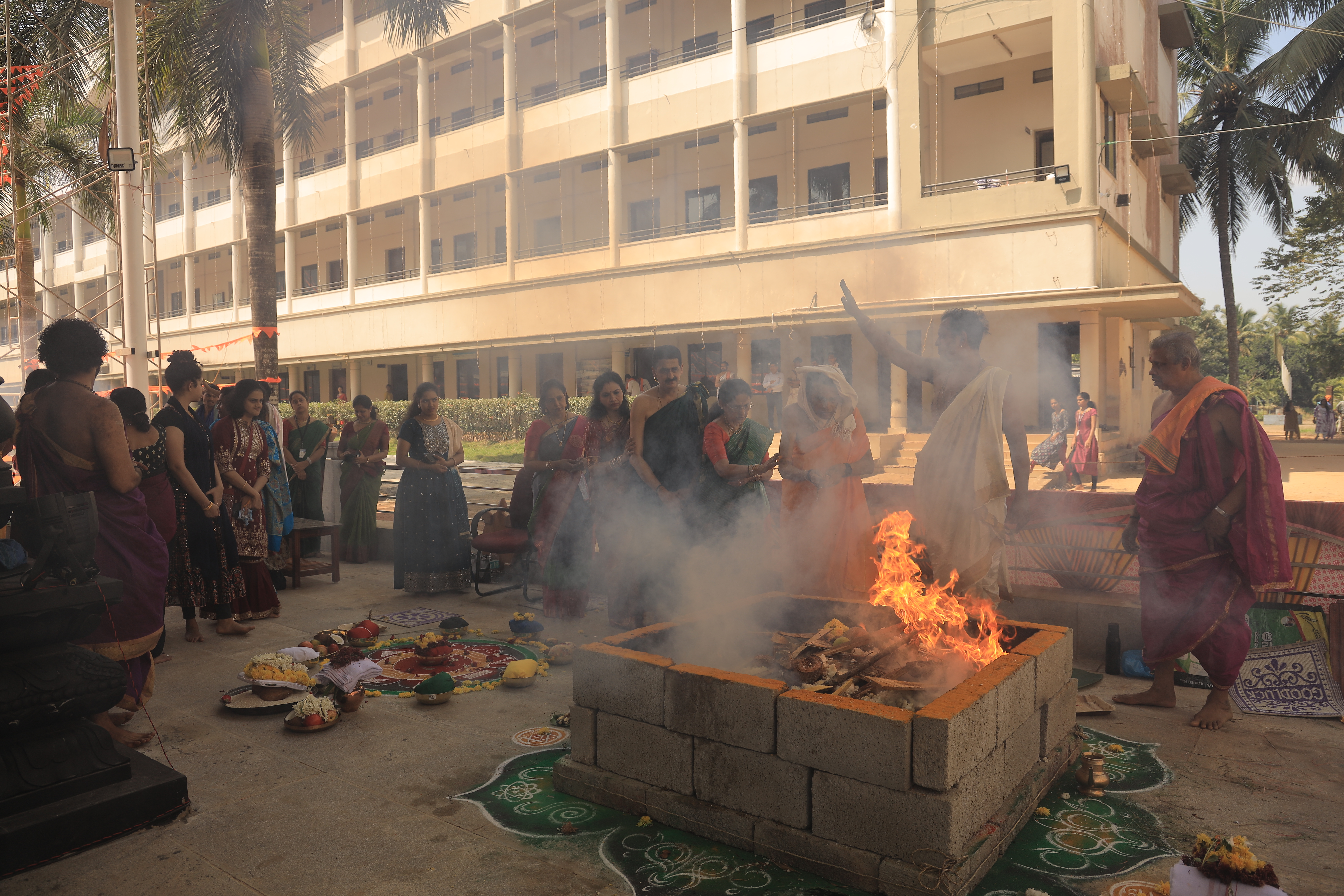 The auspicious day of February 21st, 2024, marked a vibrant and spiritually enriching event filled with various rituals, prayers, bhajans, and cultural performances in Mangaluru. Vedic ceremonial event took place, by the holy hand of the esteemed 𝐃𝐫. 𝐂𝐀 𝐀. 𝐑𝐚𝐠𝐡𝐚𝐯𝐞𝐧𝐝𝐫𝐚 𝐑𝐚𝐨, Hon'ble Chancellor of Srinivasa University and President of A. Shama Rao Foundation Mangalore, accompanied by 𝐀. 𝐕𝐢𝐣𝐚𝐲𝐚𝐥𝐚𝐤𝐬𝐡𝐦𝐢 𝐑. 𝐑𝐚𝐨, Trustee of the Governing Council, Srinivasa University, and 𝐃𝐫. 𝐒𝐫𝐢𝐧𝐢𝐯𝐚𝐬𝐚 𝐑𝐚𝐨, Hon'ble Pro-Chancellor of Srinivasa University, Vice-President of A. Shama Rao Foundation Mangalore, and 𝐏𝐫𝐨𝐟. 𝐒𝐦𝐭. 𝐀. 𝐌𝐢𝐭𝐫𝐚 𝐒. 𝐑𝐚𝐨, Trustee of the Governing Council of Srinivas University. and their esteemed family members. The day commenced with the Navagraha Shanti and ChakraabbaMandalapuja at 8:00 AM, followed by the Lakshmi Narayana Homa, Vaayu Stuti Pujan, and Shanti Prayashchit Homa at 9:00 AM. These rituals were conducted to invoke blessings and peace from the divine forces. As the day progressed, at 5:00 PM, the Adhivasa Homa, Shayanadivasa rituals, Kalash Mandal construction, and Kalash Pujan were performed. Additionally, the Aghora Homa and Lakshmi Durga Puja took place, accompanied by Ashtavadhana and Ashlesha Bali ceremonies, symbolizing devotion and purification.The morning started with devotional singing sessions, or Bhajans, by various groups such as Veeranjaneya Mahila Bhajana Mandali, Shree Hare Krishna Bhajana Mandali, and Shreenidhi Mahila Bhajana Mandali. These sessions were aimed at invoking spirituality and divine grace among the attendees.Following the bhajans, a recitation of Vishnu Sahasra Namavali was conducted, allowing devotees to immerse themselves in the divine names of Lord Vishnu. This was followed by more bhajan sessions by groups like Shreekrishna Mandira and Koota Maha Jagatthu BantwalaAngasamsthe, fostering a sense of unity and devotion among participants.In the afternoon, preparations for a grand procession began, accompanied by yet more bhajan sessions by Shree Jeevanadhara Dyana Yoga Bajana Mandali. The procession, a highlight of the day, showcased the spiritual fervor and cultural richness of the community.As evening approached, the cultural festivities continued with a mesmerizing Saree Dance by the Mahila Sabha and performances by students from SUIAS and SIT. The day culminated with a captivating Yakshagana performance, Krishnarjuna Kalaga, by SIT students, captivating the audience with its traditional storytelling and vibrant costumes.Simultaneously, at Shri Naganagini Nagabhrahma Kshethra Arkula Merlapadavu, Bhajane sessions were held by S. P. Sampath Balaga Bhajana Mandali and Shree Vishnumarthy Bajana Mandali, further enriching the spiritual atmosphere of the day.The event not only provided a platform for religious rituals but also fostered cultural exchange and artistic expression, bringing together people from different backgrounds to celebrate unity, devotion, and tradition. Through prayers, bhajans, and performances, the day served as a reminder of the enduring values of faith, harmony, and community spirit.