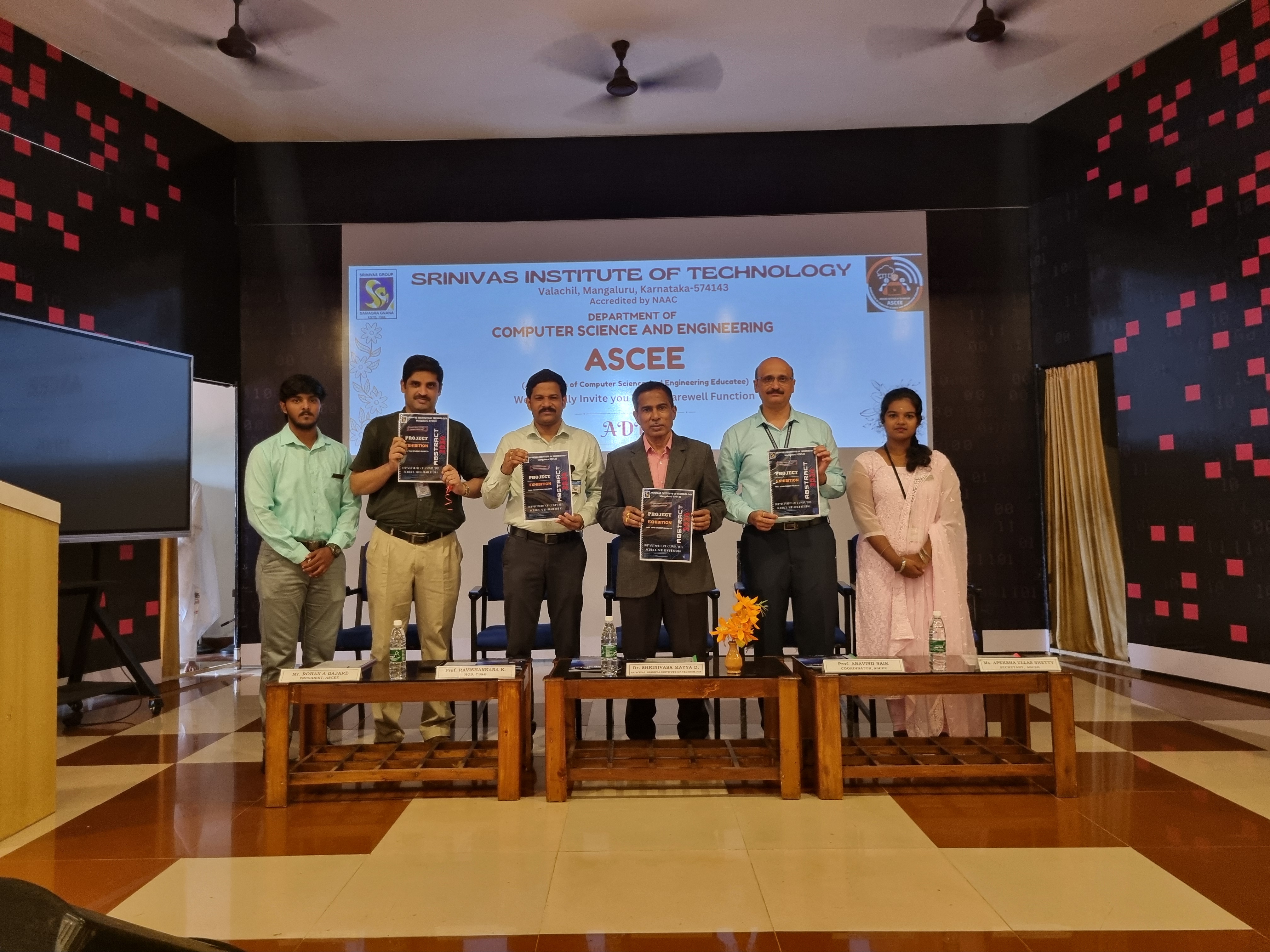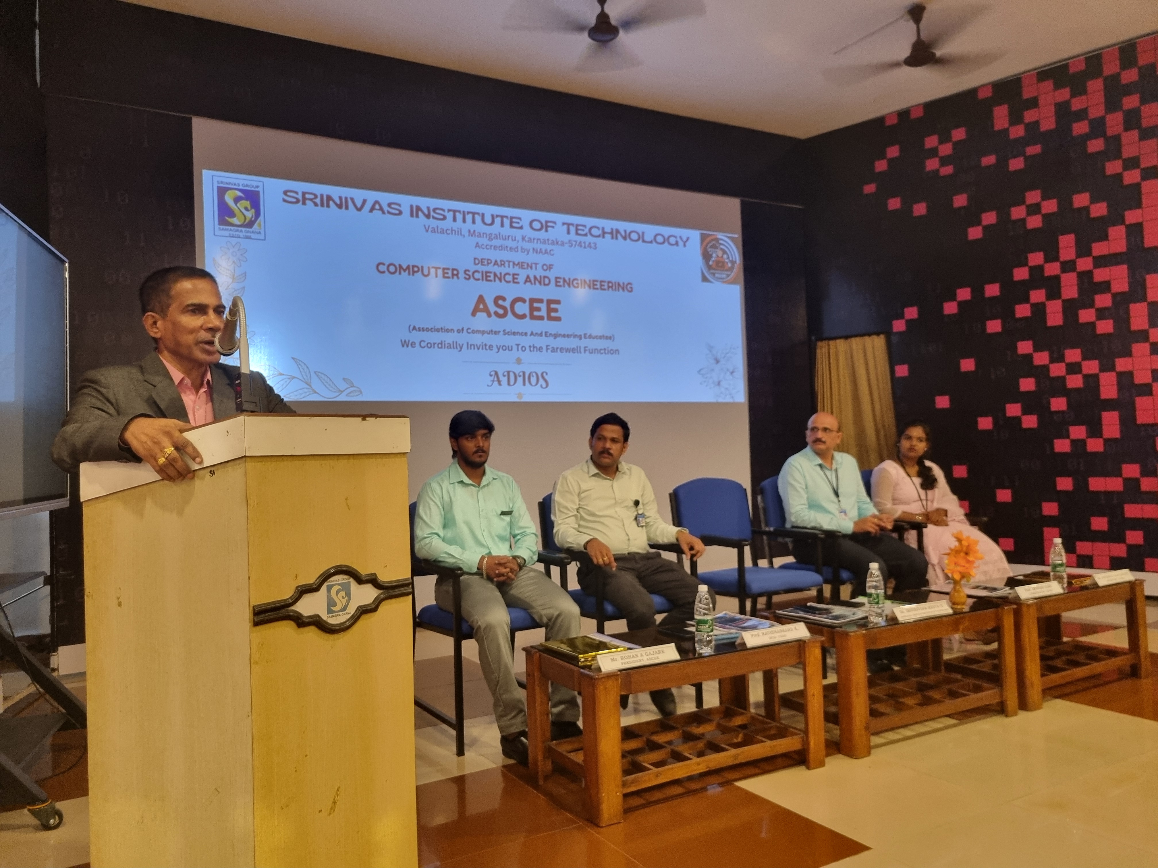 The Farewell and Valedictory function of CS&E student association ASCEE 2023-24 was held at Srinivas Institute of Technology, Mangaluru on 23rd May 2024 by the Department of Computer Science and Engineering.Dr. Shrinivasa Mayya D, Principal of the college, in his presidential address congratulated the outgoing students on this accomplishment and said “Graduation is the beginning of a life long journey of knowledge and experiences”. He also urged the students to develop positive attitude and being optimistic in their life, which is the key to success. Prof. Ravishankara K., Head of the Department CSE ,Honorary President ASCEE, addressed the gathering and appreciated the ASCEE team for their dedicated involvement in numerous activities conducted during the year 2023-2024. He also expressed his heartfelt blessings to the outgoing students and wished them to be successful in every aspect of their life. Prof. Aravind Naik, Staff Coordinator, ASCEE appreciated the team efforts for successfully conducting all the activities during the current academic year.Dr. Shrinivasa Mayya D., Principal of the College felicitated the prize winners of ALTIUS-24 events by awarding them with the certificates and prizes. The annual report of ASCEE activities of the academic year 2023-24 was presented by Ms. Sudeeksha V Herle, Documentation Coordinator, ASCEE. The 15th edition of the department magazine “SPRINKLE ” and book of Project Abstracts of final year students were released on this occasion. During this event, the outgoing students expressed their feedback, shared their experiences and views. The welcome address was delivered by Mr. Geddada Nethranand, Vice-President, ASCEE and Ms. Chaithrashree C S, Joint-Secretary, ASCEE proposed the vote of thanks. The entire program was compered by Ms. Pavana and Ms. Nandana Rajesh. The formal function was followed by a bidding farewell to the seniors by the third year students.