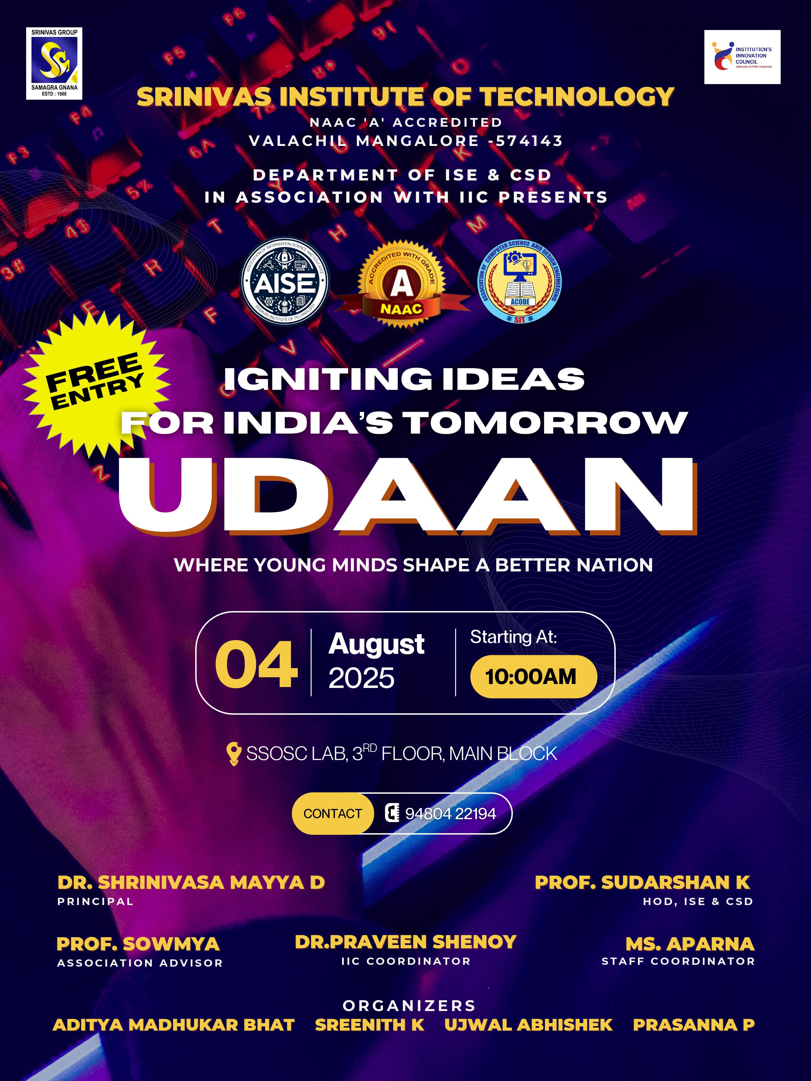 🚀 Welcome to Udaan 2025 – The College Level Ideathon Are you an engineering student ready to turn your ideas into innovative solutions for India’s development Join us at Srinivas Institute of Technology for Udaan 2025 – a dynamic Ideathon challenge that fosters creativity impact and transformation 💡 No entry fee 🌟 Exciting rewards 🤝 National level exposure Let your ideas take flight
