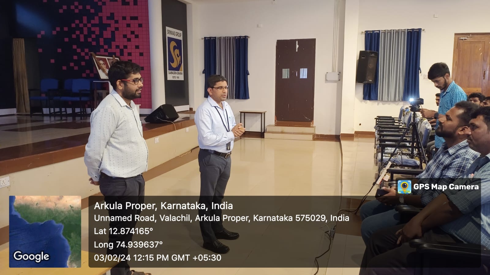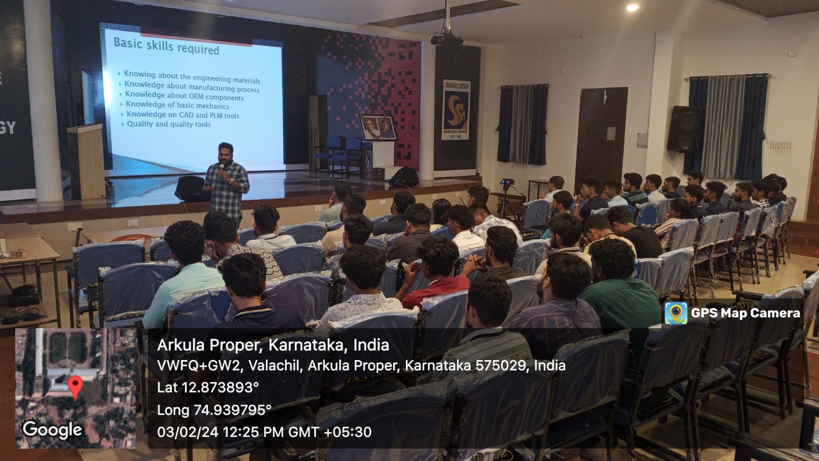 Department of Mechanical Engineering and Marine Engineering in association of Srinivas Advanced Manufacturing and Research Theatre (SAMARTH) of Mechanical engineering department, Srinivas Institute of Technology, Valachil, Mangaluru hosting a series of technical talks called as “Momentum”. In view of this second series of Expert talk Series was organized on 03/02/2024 at 12:00pm on the topic “Recent trends and requirements in mechanical Industry”. Mr. Chetan S, Senior Electro-Mechanical Design engineer at Schneider Electric was the resource person.Mr. Chetan gave introduction about the the role and scope of mechanical engineer in any of the industry, researcg and development. Since his field was electro mechanical devices, most of the topics covered things about electric motors, servo motors and its driving system. He also extended his talk towards various fields where mechanical engineer fits. Fields like design and product design, manufacturing, production engineering, quality management, marketing etc, were covered during the presentation. He guided the students about the courses or training required to join such an industries. The Session was concluded with the doubt clearing session.Program was presided by Dr. Shrinivasa Mayya D, Principal of the college. Dr. Shankar K S, HoD of Mechanical Engineering department, Dr. Lokesh V, HoD, Marine Engineering department, Mr. SathyaPrakash A, Faculty coordinator of ASMA and CEO of SAMARTH, Mr. Sunil Prakash Rodrigues, Faculty coordinator of AIMES, HoDs of various departments, and Faculty members were present during the session.
