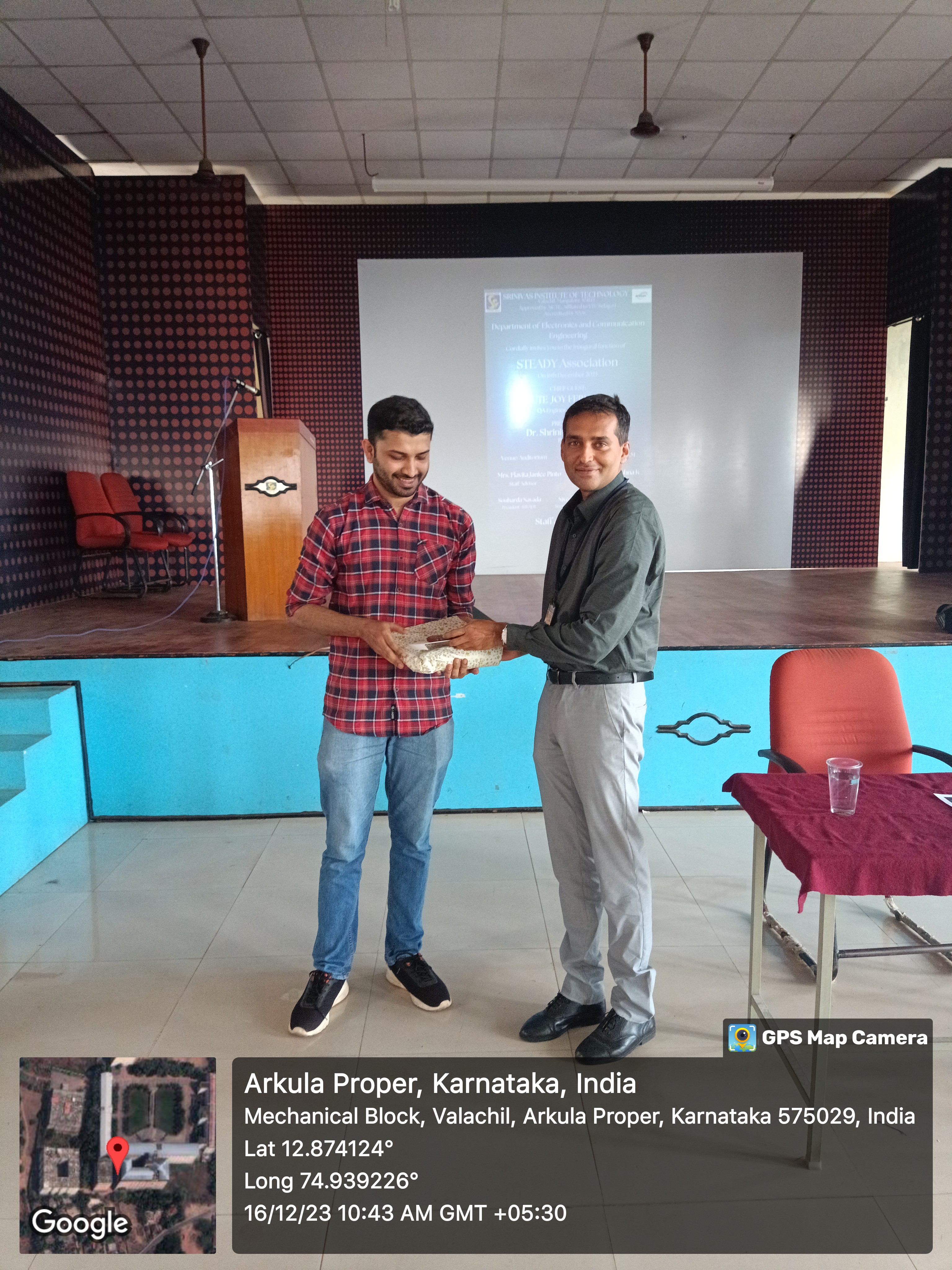 On December 16, 2023, the association of Electronics and Communication Engineering ‘STEADY’ hosted an insightful and inspiring career guidance talk by Mr. Kenute Fernandes. The event aimed to provide valuable insights into career development, personal growth, and navigating the professional landscape. Mr. Kenute Fernandes shared his experiences and expertise, offering guidance to students and professionals alike.Mr. Kenute Fernandes, a distinguished professional from Riskonnect, captivated the audience with his credentials and achievements. His diverse background and success story set the stage for an engaging and informative session. The talk delved into the importance of self-discovery and career exploration. Mr. Kenute Fernandes encouraged attendees to identify their passions, strengths, and interests, emphasizing that a fulfilling career often aligns with personal values.In a rapidly evolving professional landscape, Mr. Kenute Fernandes stressed the significance of adaptability and continuous learning. He shared anecdotes from his own journey, highlighting how staying curious and open to new opportunities played a pivotal role in his success. He offered practical tips on networking strategies, emphasizing the value of mentorship and collaboration. He shared practical advice on goal-setting and encouraged attendees to take initiative in their careers.The talk left a lasting impact on the audience, offering valuable insights and practical advice for navigating the complexities of the professional world. The event served as a beacon of motivation for individuals at various stages of their careers, reinforcing the importance of continuous learning, resilience, and strategic networking in achieving long-term success.