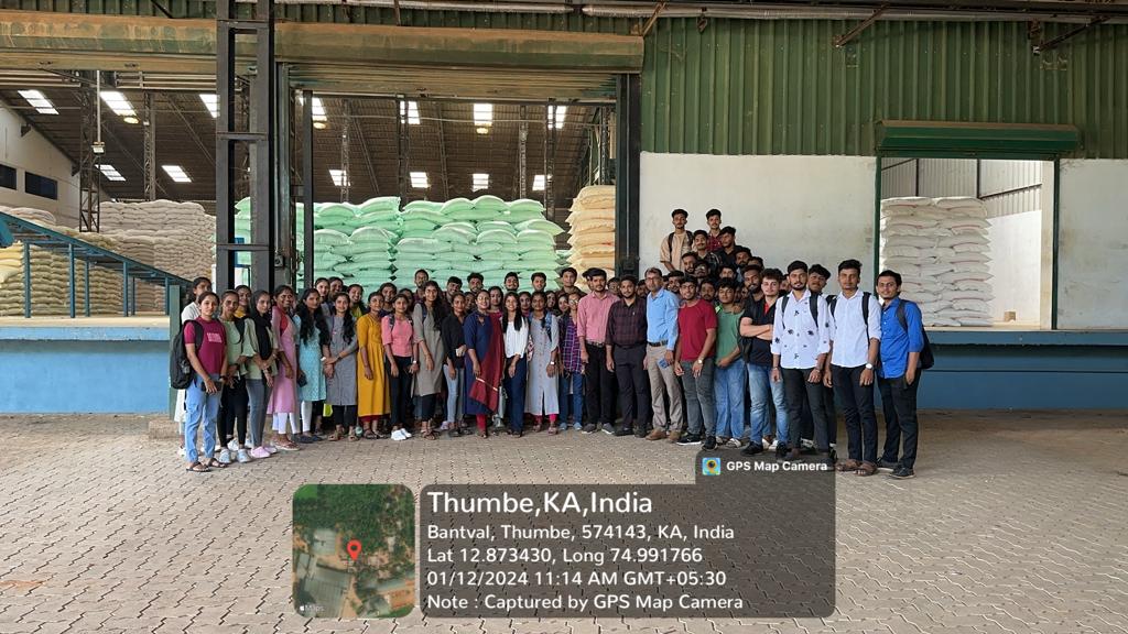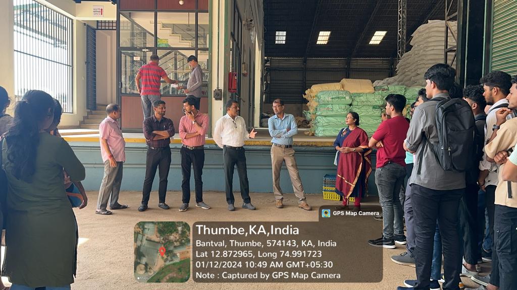 An exposure and field visit to “Bharath Agrovet Industries” Thumbe, Mangalore for problem identification was organized under the banner of VOLMAS in association with Institution’s Innovation Council on 12th January, 2024. The students of first year MBA took part in the field visited and interacted with the management of Bharath Agrovet Industries and discussed about the various issues faced by the company in the current economic environment. A total of 102 students took part in the field visit accompanied by 2 faculty members from the department. The students had the opportunity to visit the factory and see the manufacturing process involved in producing the chicken feed.
