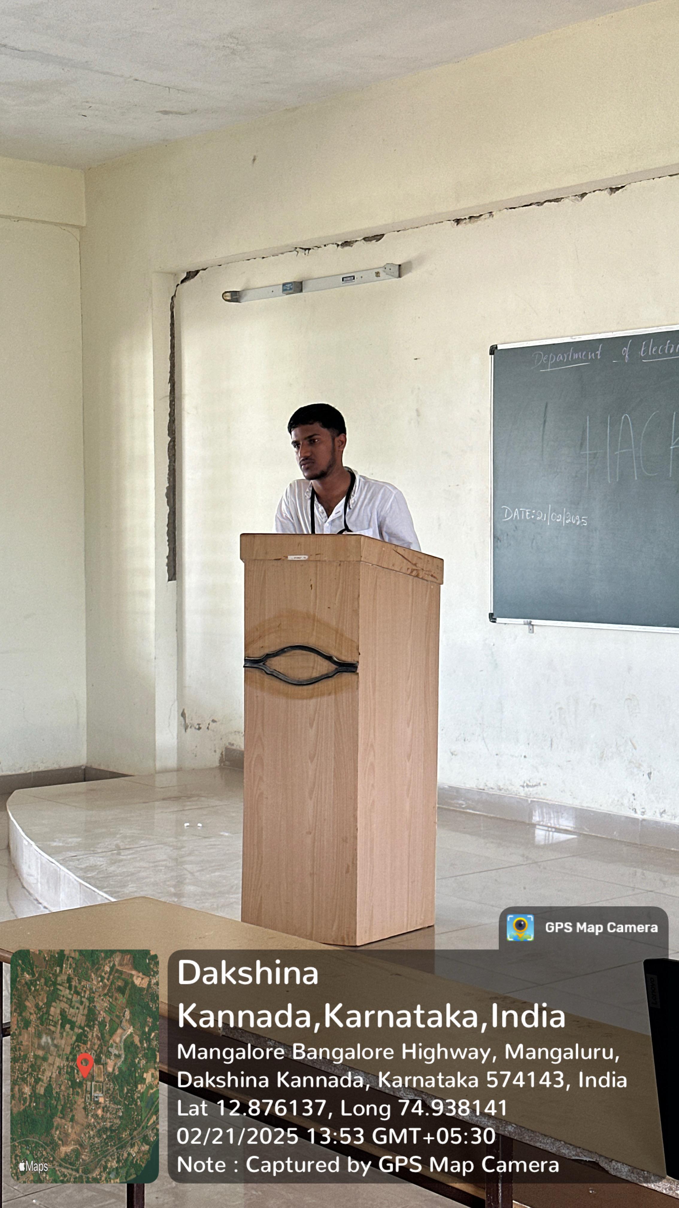 Mangaluru, February 21, 2025: The Department of Electrical and Electronics Engineering at Srinivas Institute of Technology conducted the 'Hackduino' event, a hands-on workshop designed to introduce students to Arduino fundamentals. This event aimed to ignite a passion for electronics and programming while fostering innovation and technological creativity. The workshop featured an insightful session by Aniruddha KV and Pruthvi Raj, who provided an in-depth introduction to Arduino and facilitated engaging hands-on activities, giving participants practical exposure to working with Arduino boards. The event commenced with a warm welcome by P. Apoorva Shenoy, setting a positive and enthusiastic tone for the workshop. A key highlight was the active participation of 6th-semester EEE students, who played a crucial role in guiding and supporting participants through hands-on projects, ensuring a fulfilling and enriching experience for all attendees. The 'Hackduino' workshop was a great success, leaving students inspired and well-equipped with essential skills in electronics and programming, further strengthening their interest in embedded systems and innovation.