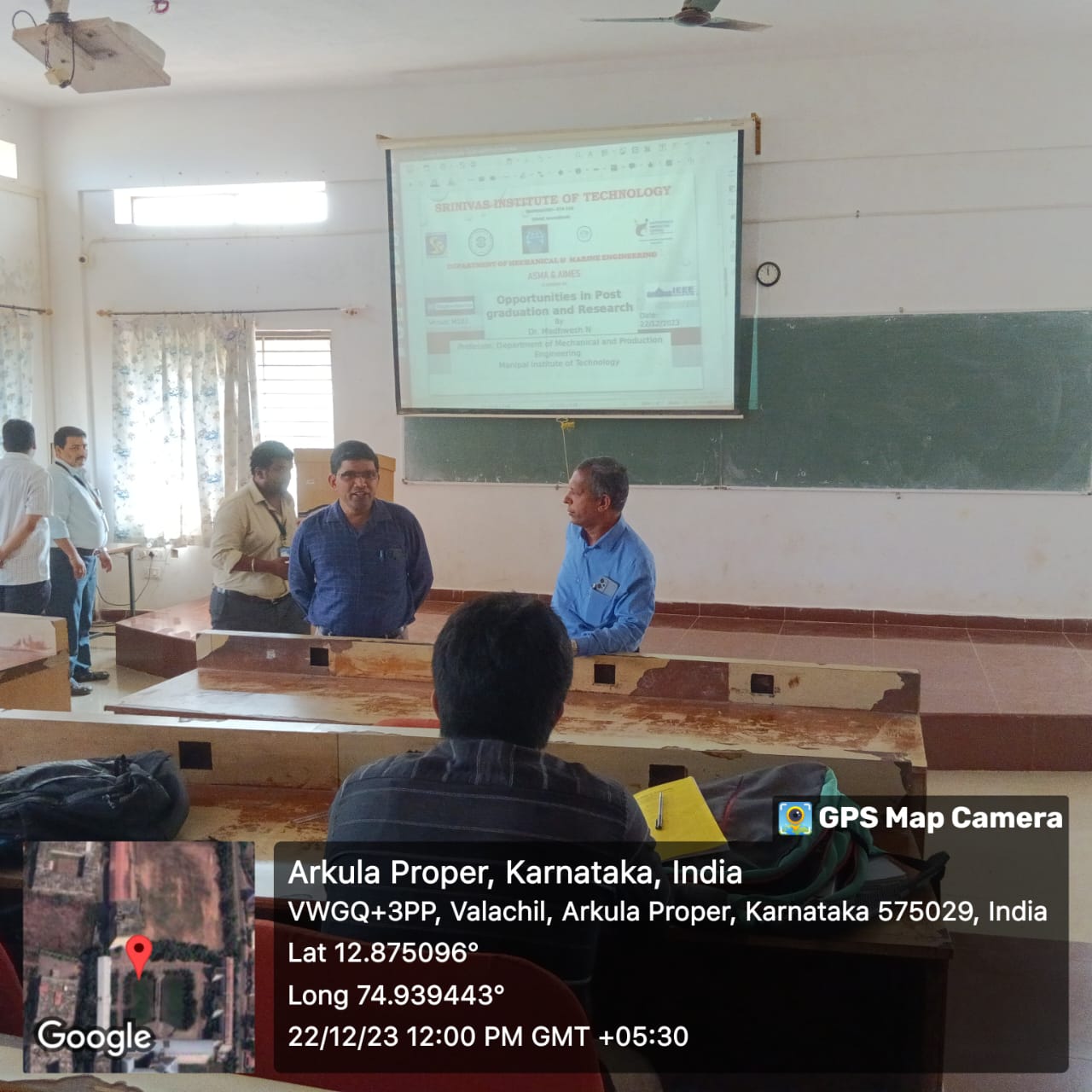 A technical talk session on opportunities in post graduation and research was jointly organized by All Students Mechanical Association (ASMA) of Mechanical Engineering department and Association of Integrated Marine Engineering Students (AIMES) of Marine Engineering Department, Srinivas Institute of Technology, Valachil, Mangaluru. Dr. Shivakumar, Dean, Department of Mechanical and Industrial Engineering, Manipal Institute of Technology, Manipal was the resource person.Dr. Shivakumar gave illustrative information regarding the various post graduate opportunities available after UG. Professor also gave detailed information on various research opportunities, Internship opportunities for the UG as well as PG Students and available stipend. During his presentation he cleared various doubts came from the student community. Session was very much informative where it cleared many of the doubts had by the students. HoD of Mechanical Engineering Department, Dr. Shankar K S introduced the resource person and HoD of the Marine Engineering Department, Dr. Lokesh V was present during the event. Prof. Mohammed Gowspeer, Assistant Professor, Department of Mechanical Engineering Coordinated the programme.