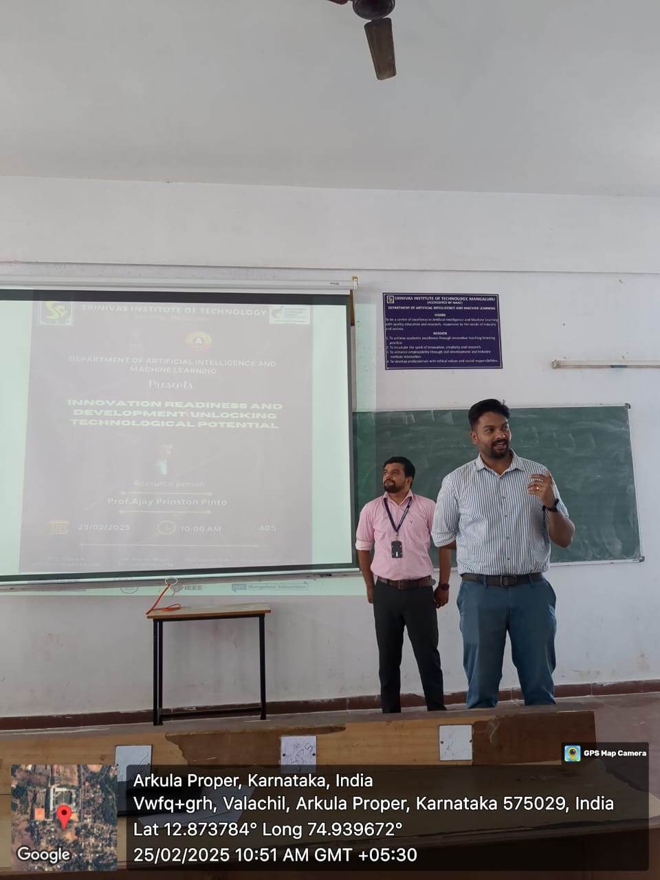 Innovation Readiness and Development: Unlocking Technological Potential” The Department of Artificial Intelligence and Machine Learning (AIML) at Srinivas Institute of Technology, Mangaluru, organized a technical session titled Innovation Readiness and Development: Unlocking Technological Potential on 25th February 2025 under the Institution’s Innovation Council (IIC). The session featured Prof. Ajay Prinston Pinto as the resource person, who shared valuable insights on fostering innovation and leveraging technological advancements for development. The event aimed to equip students with the necessary knowledge and skills to enhance their innovation readiness. The program was coordinated by Prof. Nivin K S from the AIML department, with Dr. Praveen Shenoy serving as the IIC Coordinator. The event was conducted under the guidance of Prof. Daya Naik (HOD, AIML) and Dr. Shrinivasa Mayya D (Principal, SIT). The session provided an engaging platform for students to explore innovation-driven growth and its role in emerging technologies.