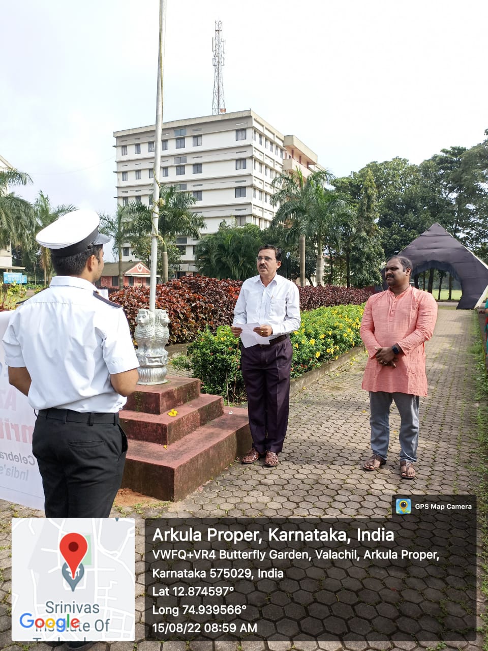 Srinivas Institute of Technology celebrated 75th Independence Day on 15th August 2022. A flag Hoisting ceremony was conducted on the occasion. Dr. A.R.Shabaraya, Principal, Srinivas College of Pharmacy was the chief guest on the occasion and hoisted the National Flag. Prof.Tony Sebastian, Sports Coordinator, Dr. Ananth Kumar Kulkarnai, Student Welfare Officer, other staff members and students were present on the occasion.