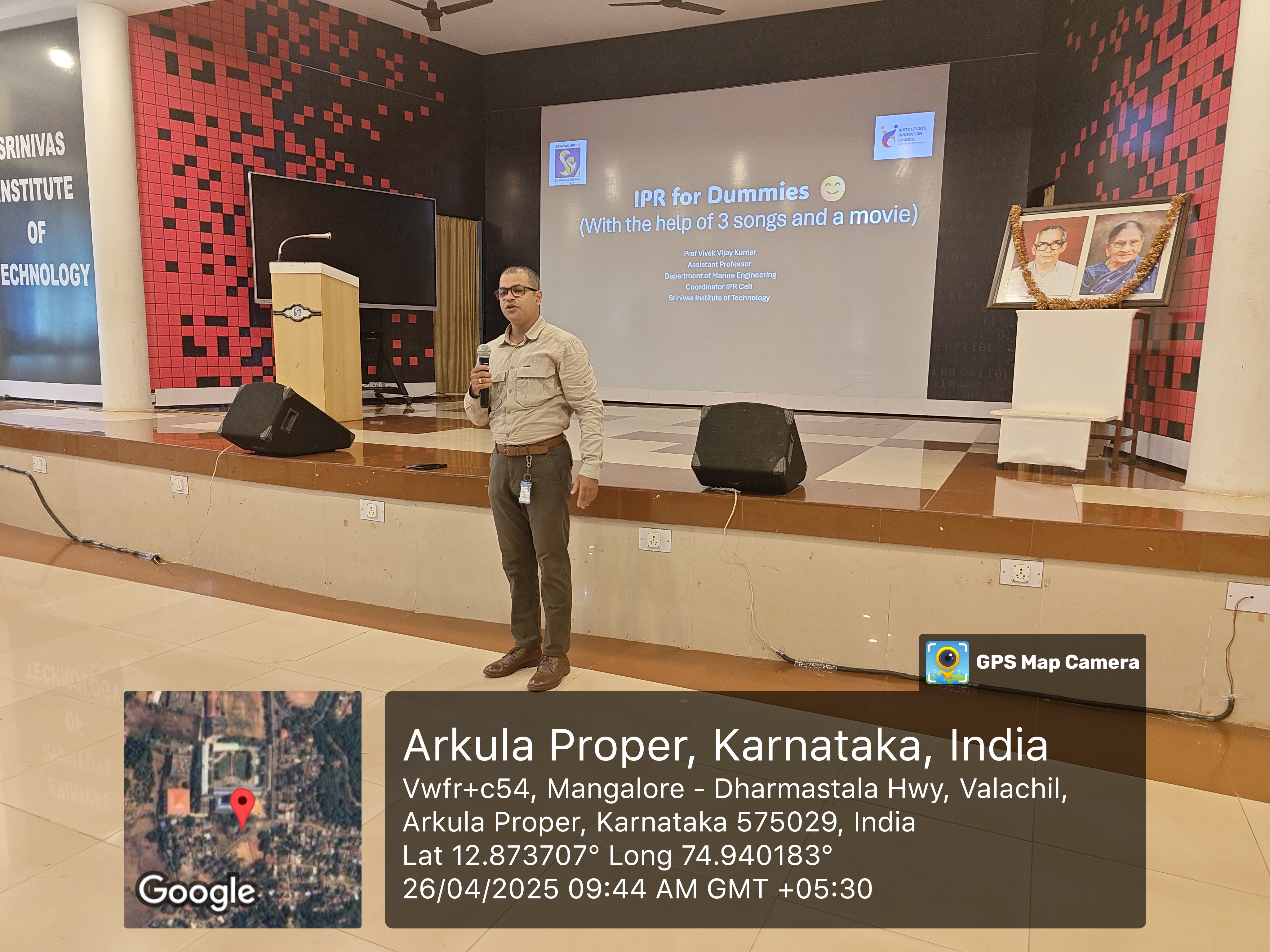 World Intellectual Property Day Celebration at Srinivas Institute of Technology On the occasion of World Intellectual Property Day, the Institution's Innovation Council (IIC), in association with the IPR Cell of Srinivas Institute of Technology, Valachil, organized a vibrant awareness session on 26th April 2025 at the Seminar Hall. The resource person for the event, Prof. Vivek Vijay Kumar, Assistant Professor, Department of Marine Engineering, delivered an engaging session titled "IPR for Dummies (With the help of 3 songs and a movie)". Through an innovative approach, Prof. Vivek explained the core concepts of Intellectual Property Rights (IPR) using songs and videos, illustrating how similar ideas can be expressed through different forms and yet be distinct - thereby underlining the importance of originality and creative expression in protecting intellectual works. Prof. Vivek also discussed how the landscape of Intellectual Property has evolved with the advent of AI tools, citing examples such as Ghibli Studios to demonstrate how traditional ideas and artistic expressions are being reinterpreted and challenged in the modern era. The event witnessed enthusiastic participation from first-year students of the Departments of Aeronautical Engineering, Automobile Engineering, Mechanical Engineering, and Marine Engineering. The session was highly interactive, encouraging students to view their academic and technical projects through the lens of innovation and patenting. Prof. Rakesh Mallya also addressed the gathering, motivating the students to think beyond their curriculum and work towards patenting their creative projects and ideas. As a token of appreciation for his insightful and thought-provoking session, a memento was presented to Prof. Vivek Vijay Kumar by the organizing committee. The event was coordinated under the able leadership of Prof. Gourish Hegde (Event Coordinator), Prof. Jayaram Thumbe (Convenor, IPR Cell), Dr. Praveen Shenoy (Convenor, Institution's Innovation Council), and Dr. Shrinivasa Mayya D (Principal, Srinivas Institute of Technology), whose collective efforts ensured the success of the program. The program successfully ignited a fresh spirit of innovation, intellectual curiosity, and contemporary awareness among the budding engineers, marking a memorable celebration of World Intellectual Property Day.