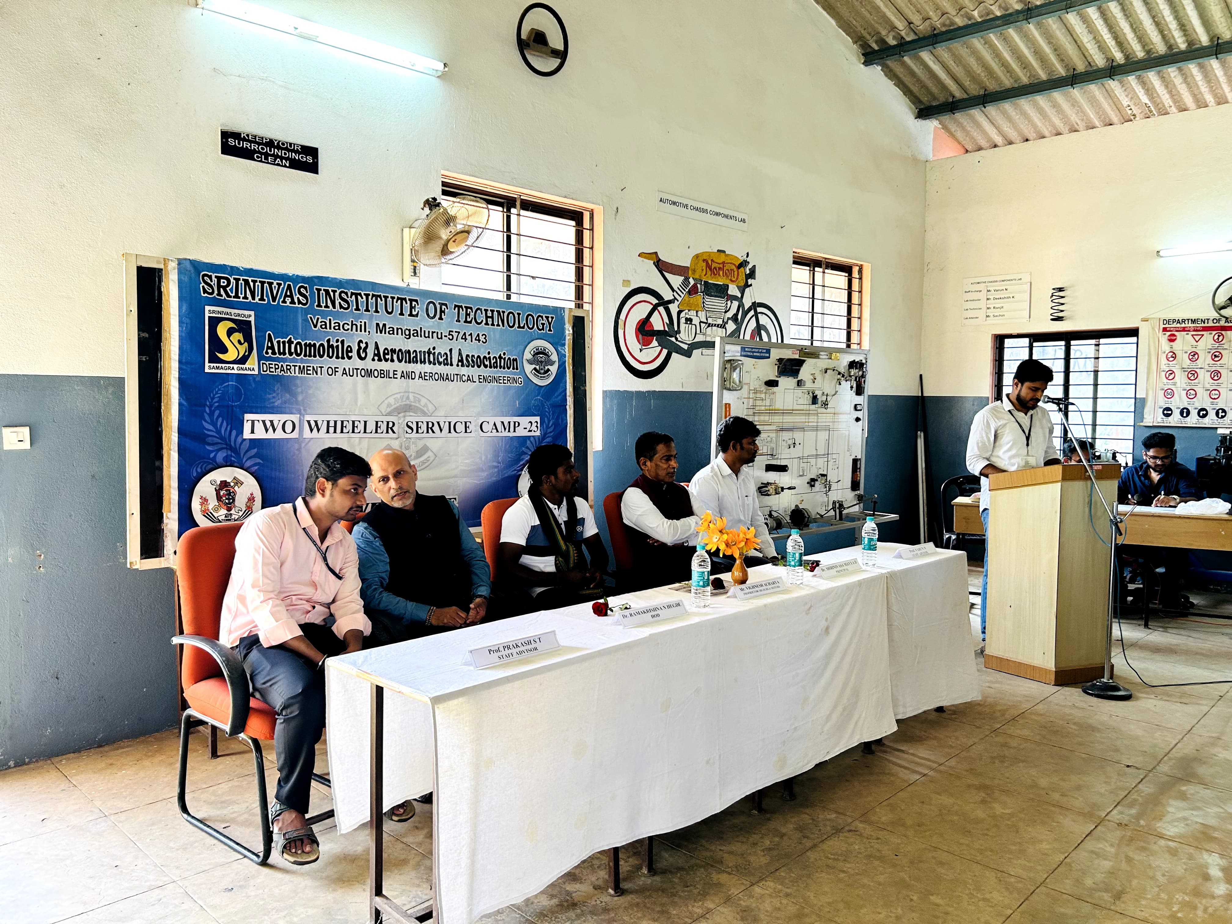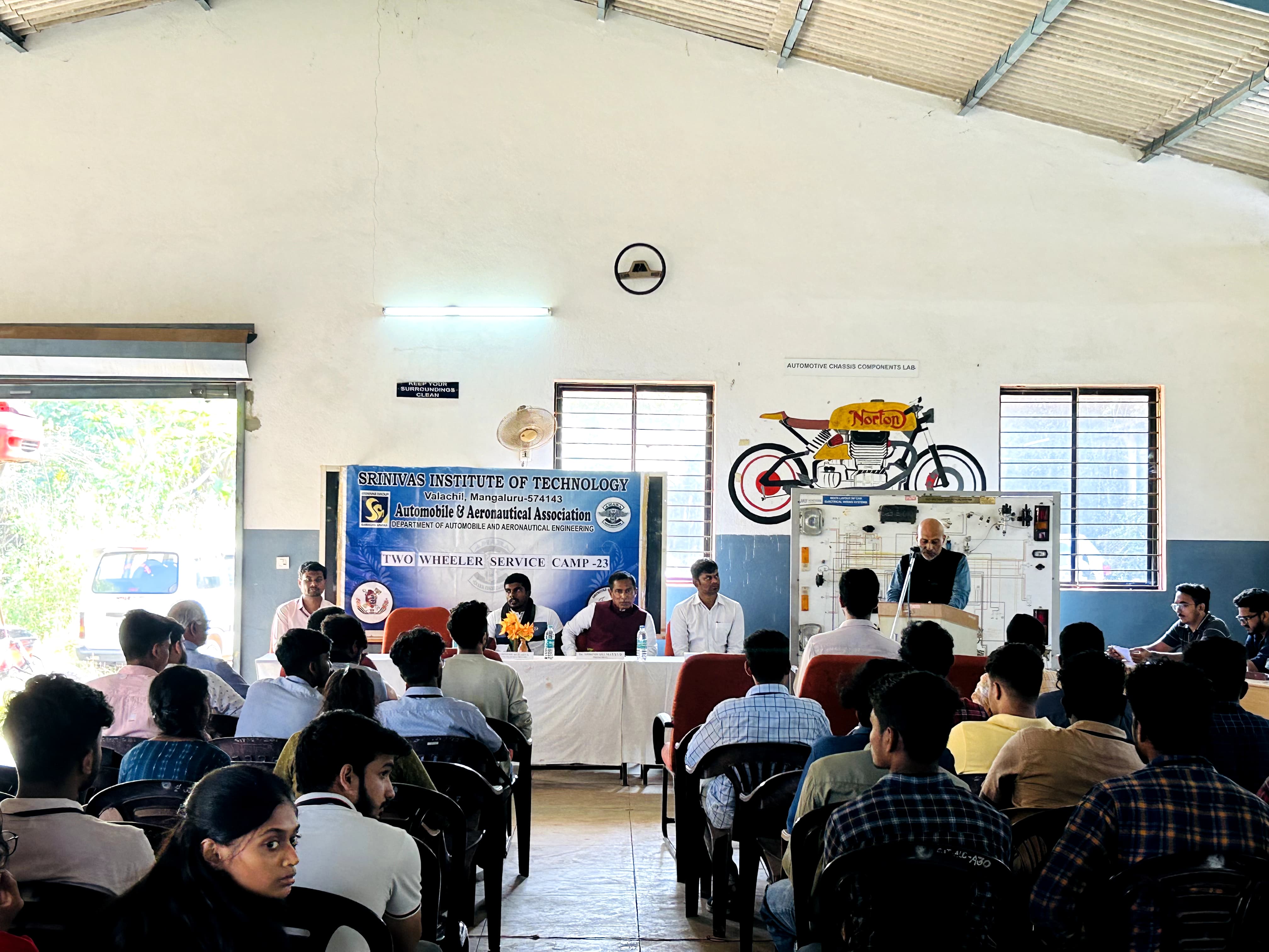 Department of Automobile Engineering, Srinivas Institute of Technology, Valachil, Mangaluru, organized one day workshop “TWO-WHEELER SERVICE CAMP - 2023”, for the students on 7th December 2023 in the Automobile Department workshop. Shri. Vighnesh Acharya, Proprietor, Sri Durga Motors, Mangaluru, graced the occasion as the chief guest and gave a hands-on training to students related service and maintenance of all types of two-wheeler vehicles.Dr. Ramakrishna N. Hegde, HOD, Automobile Engineering, in his speech explained the importance of service sector in Automobile and asked the student to improve their observation skills, which could help them to learn and analyze the problems. He also advised the students to take part in the technical hands-on activities, so that they can get practical knowledge. Dr. Shrinivasa Mayya D. Principal, Srinivas Institute of Technology, Mangaluru wished the students to have a fruitful interaction with the expert during the workshop and motivated the students to participate in skill development workshops regularly.Mr. Satwik K welcomed the gathering. Mr. Naresh Choudary, Student coordinator delivered the vote of thanks. Master of ceremony was done by Mr. Harshith.The workshop was coordinated by Mr. Prakash S T and Mr. Varun N, Assistant professor, Automobile Engineering Department. More than 40 students actively participated in the workshop and more than 20 two wheelers were serviced. This workshop helped students to understand the basic check points required in general service and other maintenance such as brake service, oil change, body water service of two wheelers.The workshop was successfully completed with the support from faculties of Automobile Department, HOD, Principal and the Management.