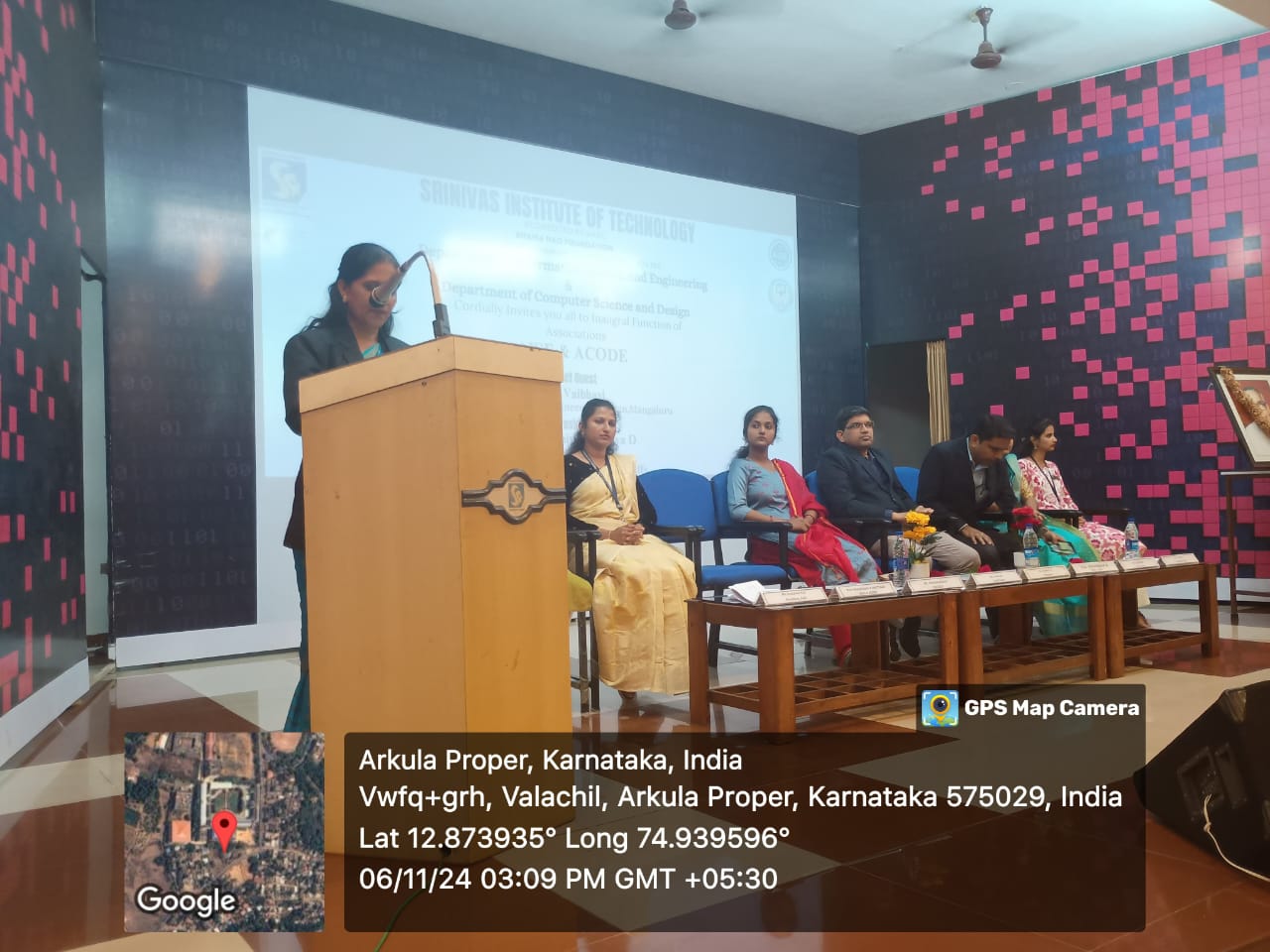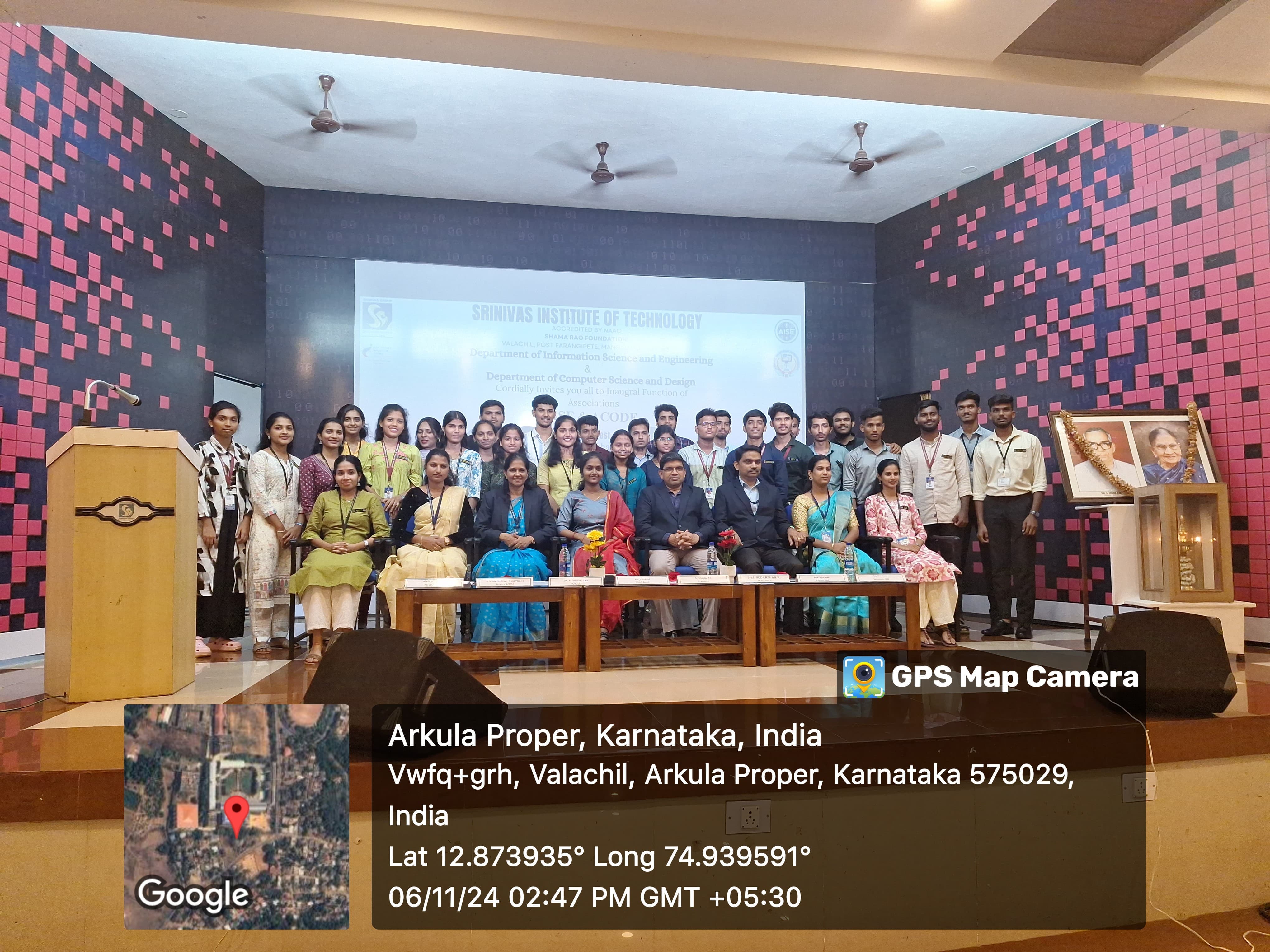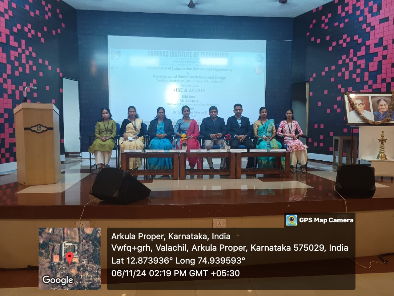 SRINIVAS INSTITUTE OF TECHNOLOGY, MANGALURU Department of Information Science and Engineering and Computer Science and Design ASSOCIATION-INAUGURATION The combined association inaugural function of AISE and ACODE was held on 6th November 2024.The event was invocated by Joshna and team of 3rd sem ISE, followed by welcome address by Sinchana Secretary of AISE. Dr.Padmanayana HOD,Department of ACODE, Prof.Sudharshan K HOD, Department of AISE, were present at the event. The association was inaugurated by the chief guest, Ms. Vaibhavi Software engineer , Aykan, Mangalore. The inaugural function was presided by Dr.Shankar K S, Head of the Department Mechanical Engineering where he appreciated the efforts in making associations and opportunities offered by college in an over-all development, coming together of diverse ideas, promote more events and programs and enhance skills. The inaugural ceremony was followed by a talk by the chief guest on ‘Effective way of learning-Placement Talk’ where she highlighted that learning isn’t limited to college, importance of settling down, preparation for placements, happenings of corporate world, being part of events. The event continued with the Dr.Padmanayana, HOD of CSD and Prof. Sudarshan K, HOD of ISE extending congratulations to the office bearers of the associations. The event was followed by complete action plan for academic year 2024-25 was presented by President of AISE Ms.Jayashree K R. Prof. Rajeshwari R Shettigar, the faculty advisor of ACODE (Association of Computer Science and Engineering), formally announced and introduced the office bearers for the respective associations fr the academic year 2024-25 to the gathered audience. Mrs. Sowmya, the faculty advisor of AISE (Association of Information Science and Engineering), announced the prize winners of various events conducted under both associations. The function was concluded with a vote of thanks delivered by Ms. Vaishnavi, Secretary of ACODE. The Chief Guest, Ms. Vaibhavi, a Software Developer at Aykan, Mangaluru, delivered an insightful talk on the topic “Pathway to Placement Success.” During her presentation, she highlighted essential strategies for students preparing for placements, including the importance of self-assessment, setting clear goals, and building both technical and interpersonal skills. She emphasized a growth mindset and adaptability as keys to thriving in today’s dynamic job market, inspiring students with practical advice and actionable steps to achieve success in their career journeys. Master of Ceremonies for the event were Aishwarya Poojari from 5th-semester ISE and Deeksha Shetty from 5th-semester CSD, who guided the proceedings with grace and enthusiasm. 1