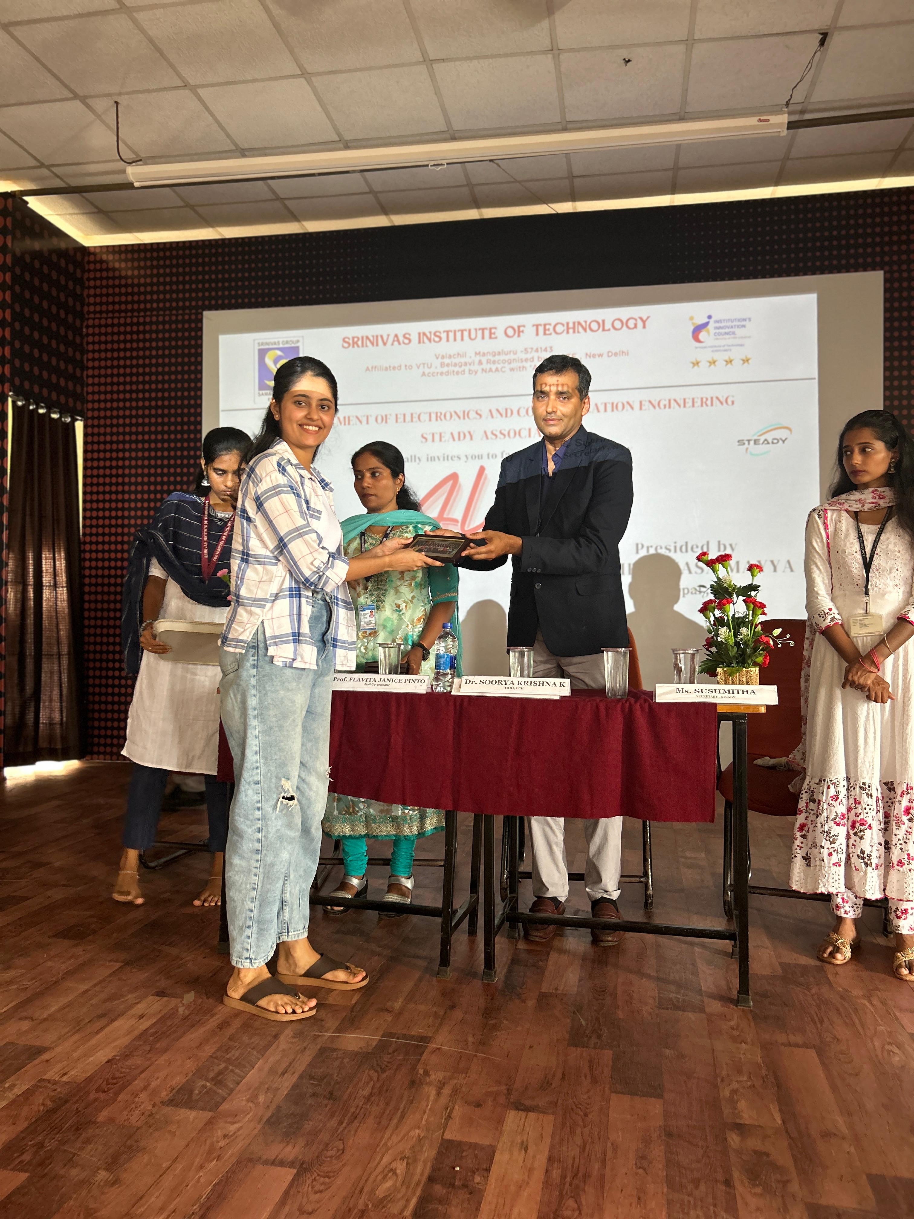 The Department of Electronics and Communication Engineering at Srinivas Institute of Technology, Valachil, held an emotional and vibrant farewell and valedictory function titled “Alvida” on Saturday, May 10, 2025, at the college auditorium under the banner of the STEADY Association. The ceremony commenced with a soulful prayer song rendered by Ms. Kavya of 6th semester ECE and Ms. Shreya of 4th semester ECE, setting a serene and respectful tone for the day. This was followed by a welcome address by Mr. Prajwal of 6th semester ECE, who warmly greeted the dignitaries, faculty, and students, highlighting the significance of the event. The event was presided over by Dr. Shrinivasa Mayya D, Principal of SIT, who in his address, appreciated the efforts of the outgoing batch and encouraged them to carry forward the values of the institution. He wished them success in all future endeavors. Dr. Soorya Krishna K, Head of the ECE Department, also addressed the gathering, expressing their pride in the students' achievements and contributions. Ms. Akshatha of 6th semester ECE presented the STEADY Association Annual Report, outlining the year’s academic and extracurricular highlights. It was followed by a prize distribution ceremony, wherein meritorious students and winners of various events and activities conducted under STEADY were recognized and honored. The event concluded with a heartfelt vote of thanks by Ms. Pranitha of 6th semester ECE, who acknowledged the efforts of the organizers, staff, and participants for making the event a memorable one. “Alvida” was a perfect blend of nostalgia, celebration, and inspiration, leaving everyone with cherished memories.