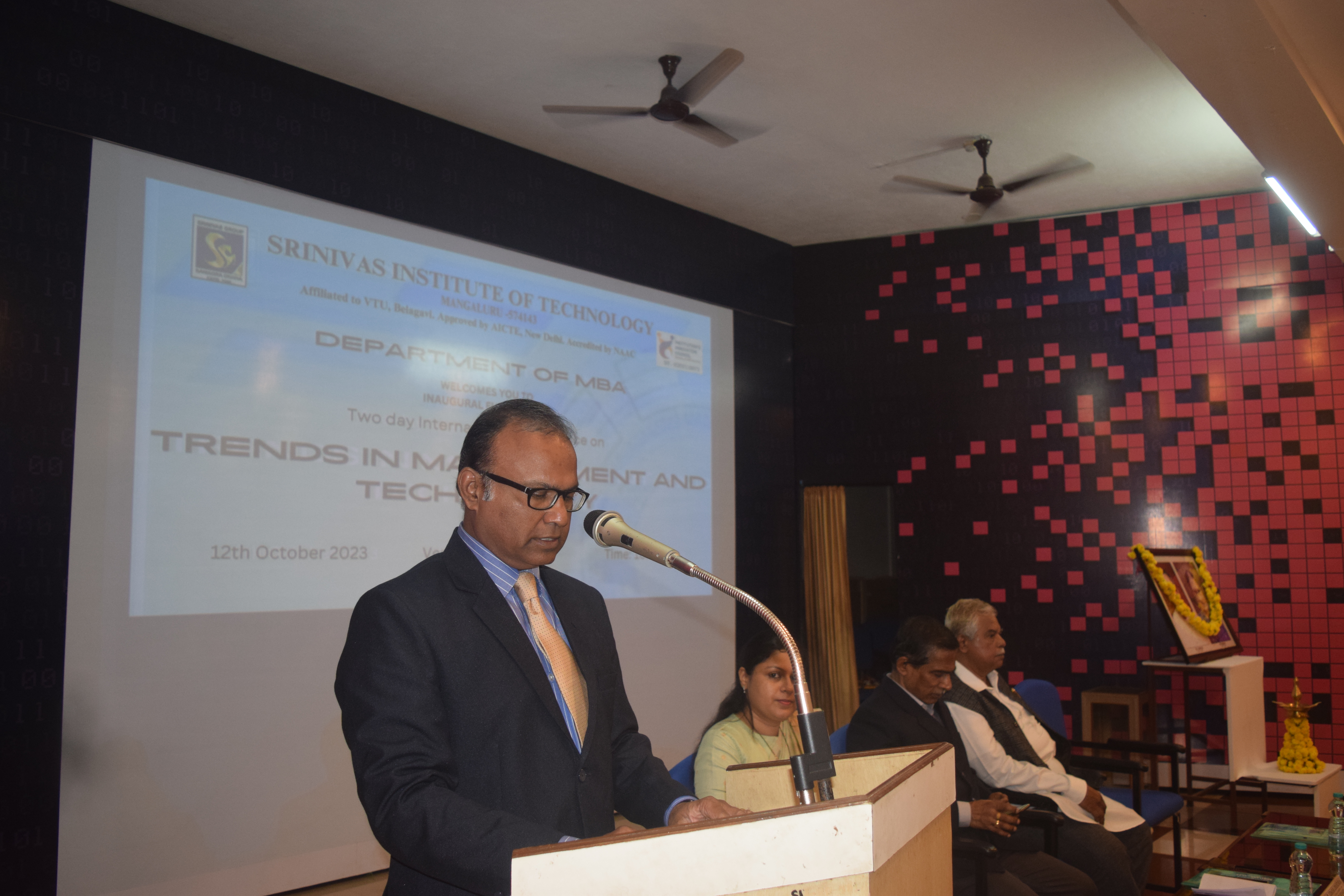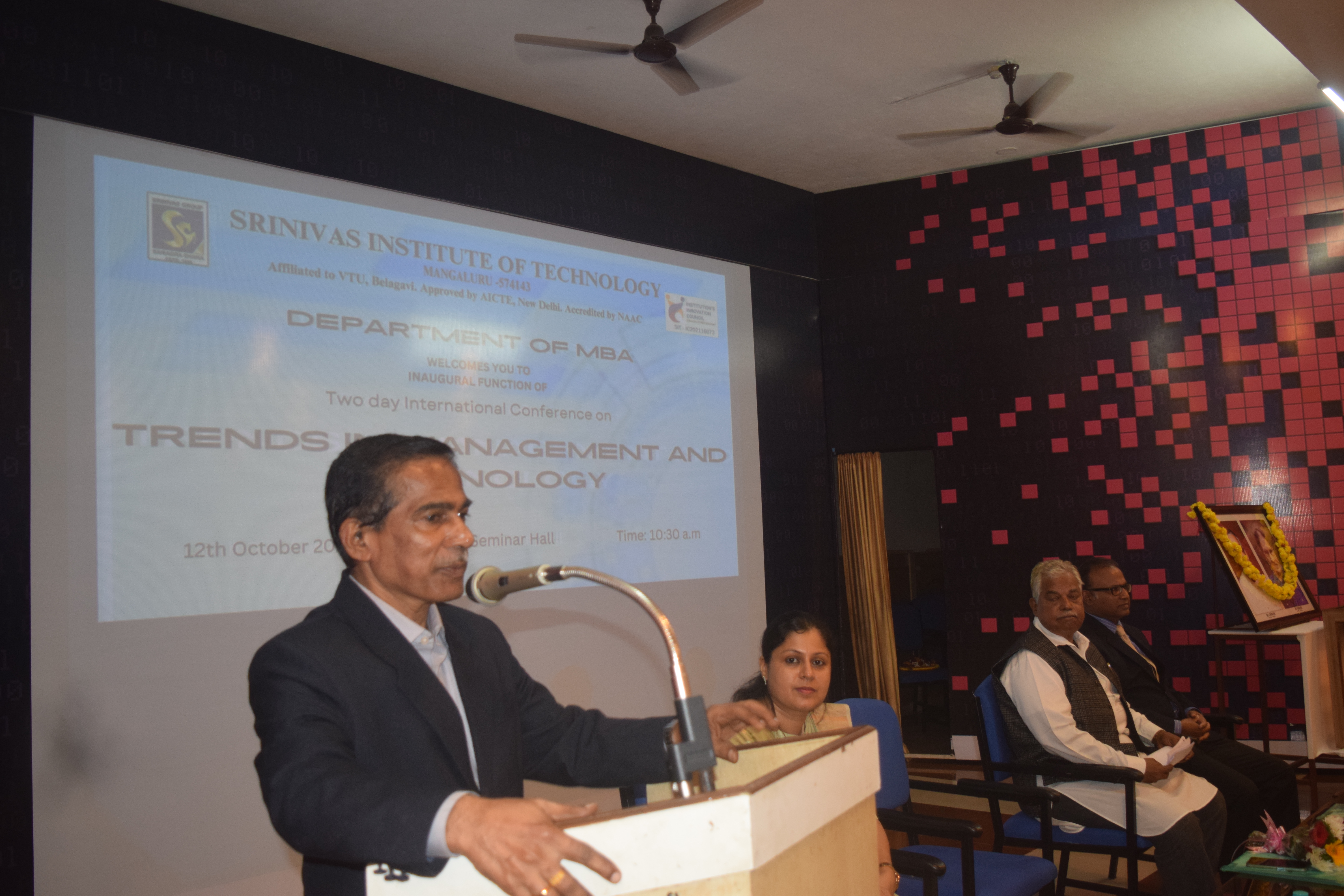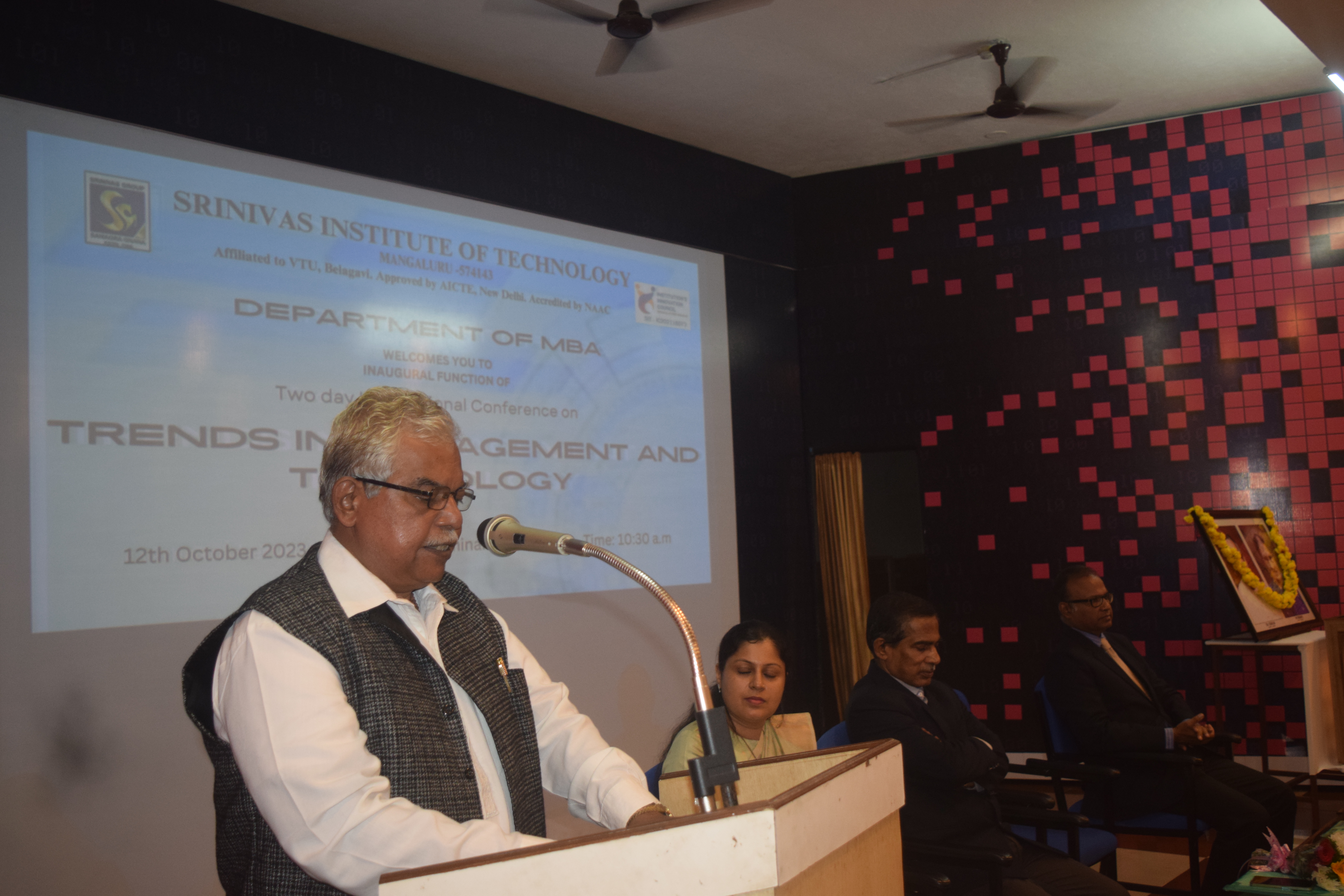 Two Day International Conference on Trends in Management and Technology was organized by MBA department of Srinivas Institute of Technology, Valachil Mangalore on 12th and 13th October 2023. The Two Day International Conference was inaugurated by Dr.P N Udaya Chandra,Former Principal, SDM College Ujire. In his inaugural address he highlighted the impact of technology on various industries and also the requirement of innovation for the development of business in the current scenario and he also delivered key note address. The formal function was inaugurated by lighting the lamp by the dignitaries. Dr.Nasser Alhamar Alkathiri, Deputy of Assistant Vice chancellor for PG studies, Scientific Research & Innovation, College of Economics & Business Administration, University of Technology & Applied Sciences, Salalah, Oman, delivered the Keynote address. Dr. Shrinivasa Mayya D, Principal of the college was the president of the function. He in his presidential address highlighted the importance of adopting latest technologies in all the sectors. Prof.Rashmi, Conference Coordinator, briefed about the conference. Dr.Ajoy S Joseph, HOD, MBA department welcomed the gathering and introduced Chief guest to the audience, Prof.Mallika delivered the vote of thanks. . Prof.Steevan Robert Tellis was the master of ceremony on the occasion. There were 3 sessions for presentations. 70 delegates from India and abroad presented their papers in this international conference.