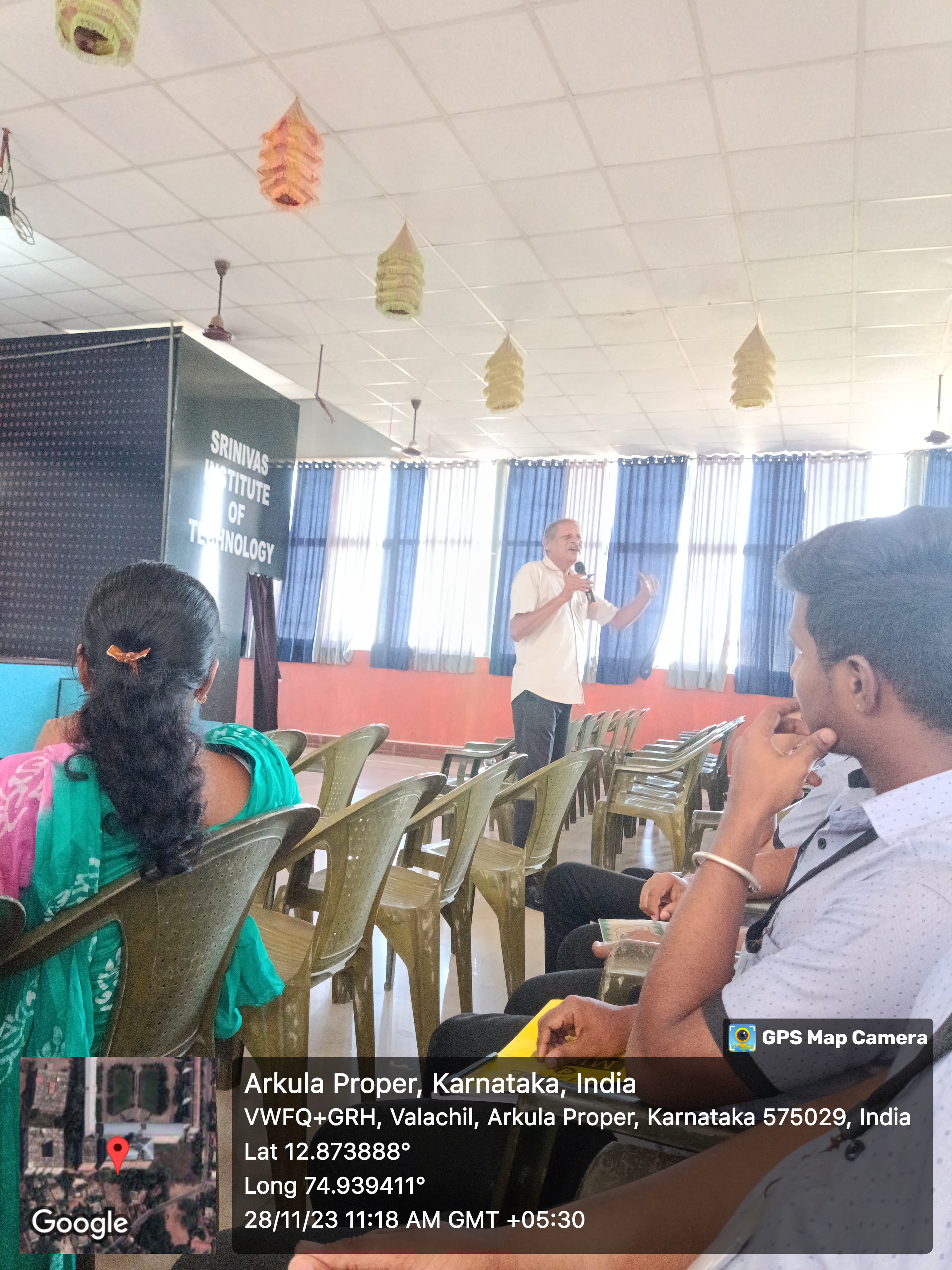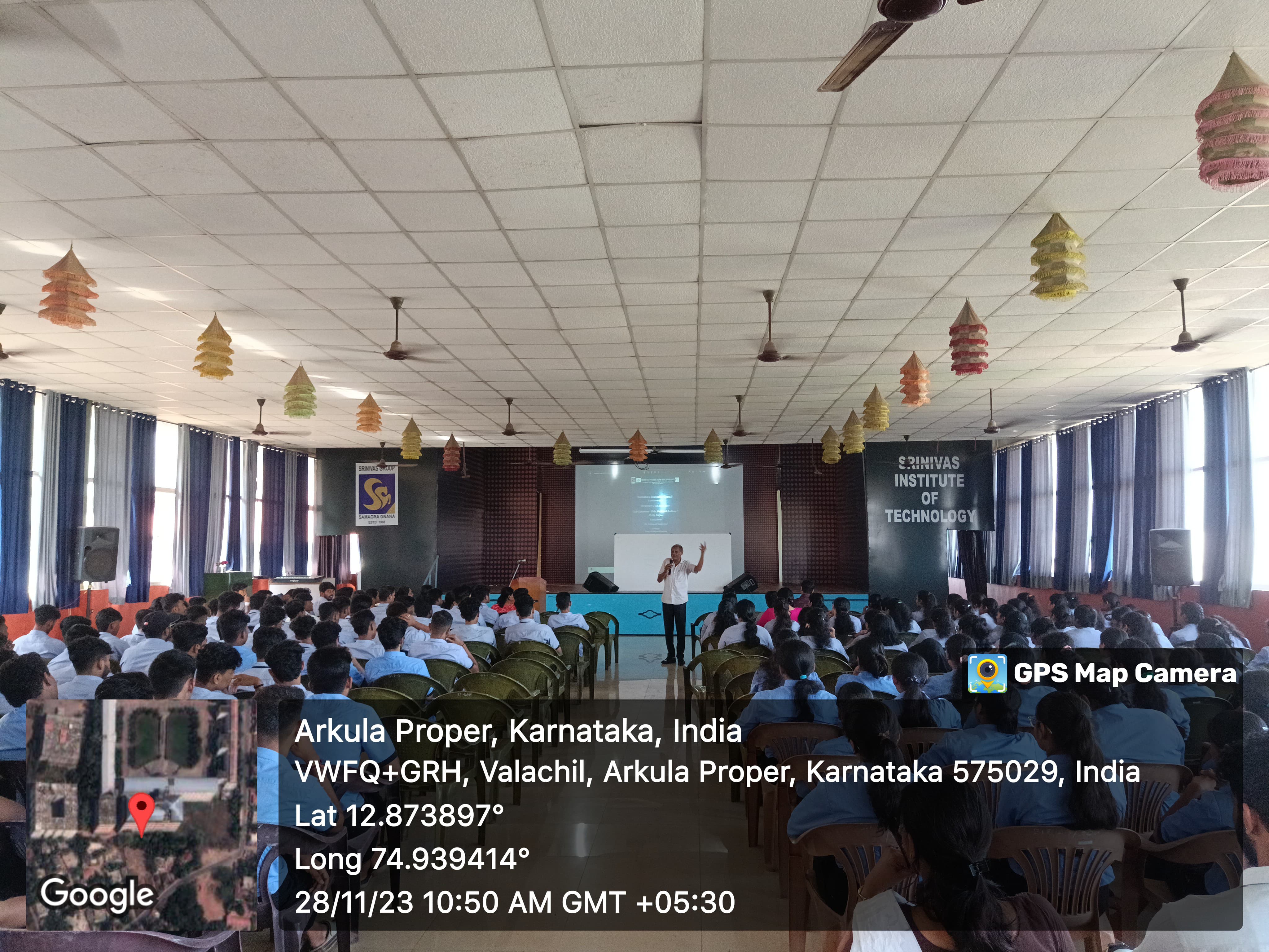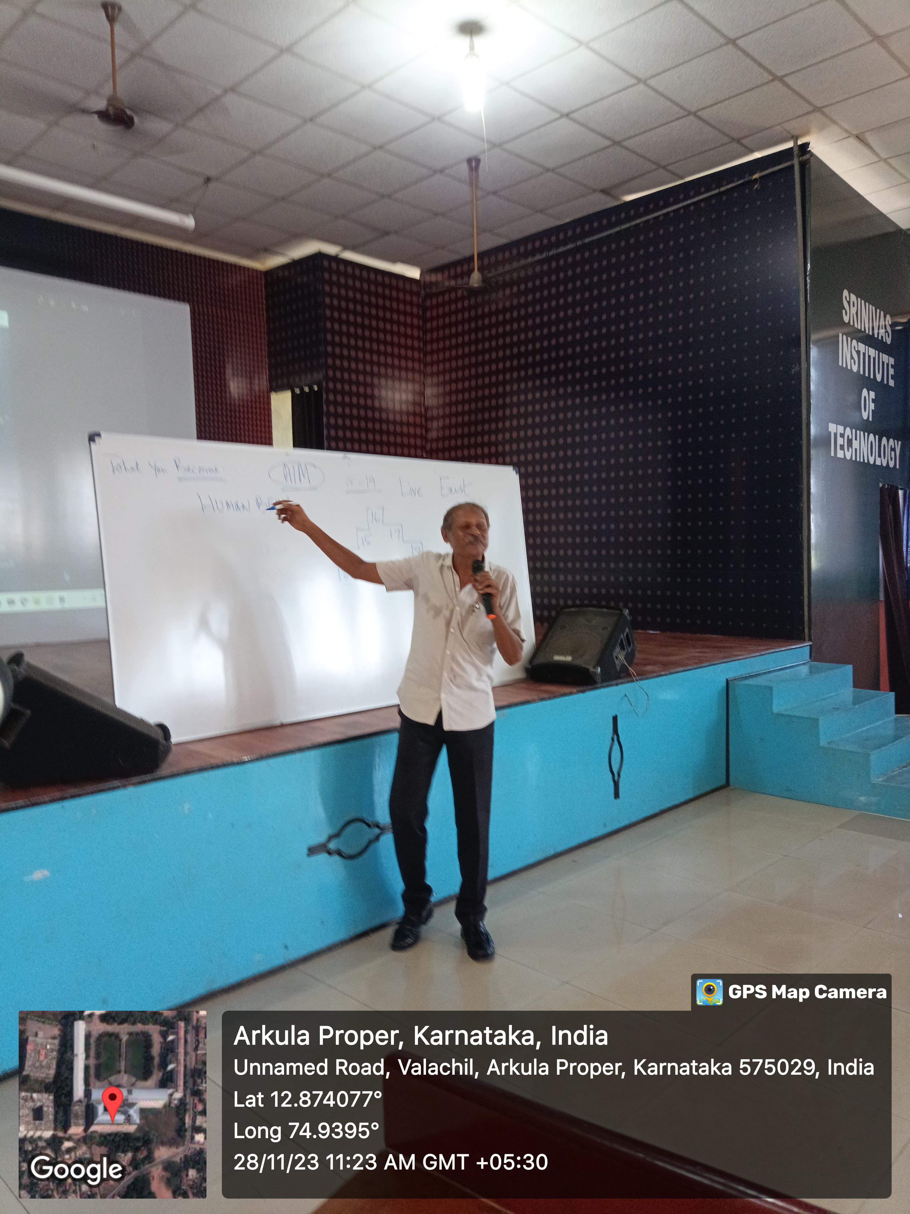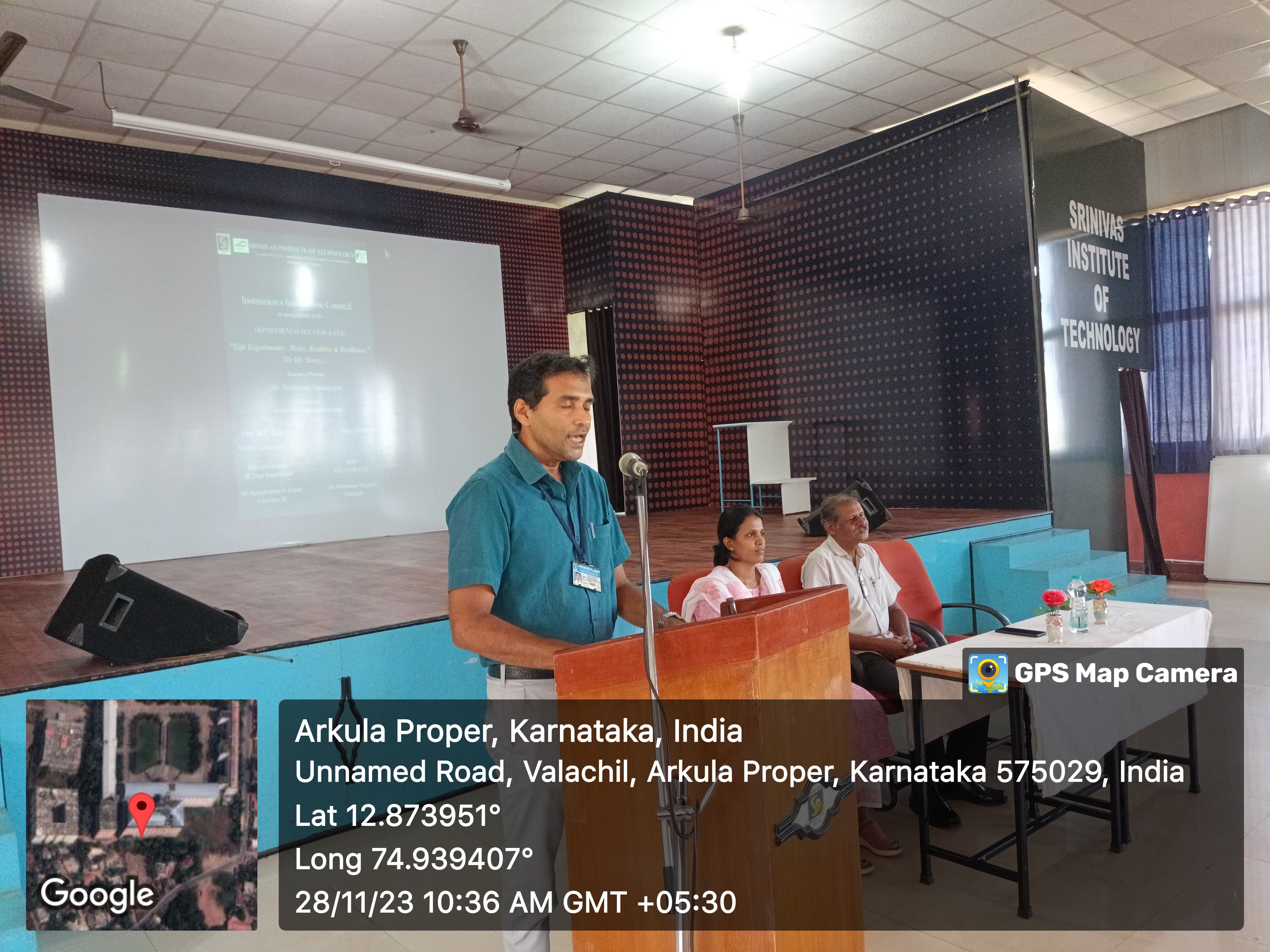 The SIT ECE Department, Dept. of Computer Science and Business System and Computer Science and Design with the IIC cell, organized a session on 'Life Experiments-Risks, Realities &Resilience'-My life Story. This program took place on 28-11-2023 in Auditorium,4th floor, SIT. Mr. Srinivasan Nandagopal, Co-Founder, Centre for Integrated Learning served as the resource person. He encouraged students to write their life story by explaining the purpose of life, being human and living and existing in the system by aiming into future goal. Additionally, he also spoke about inverted pyramid of life, the risks and realities which exists in the system. Students of 3rd & 1st semester ECE, CS-BS, and CS-D actively participated in this program.