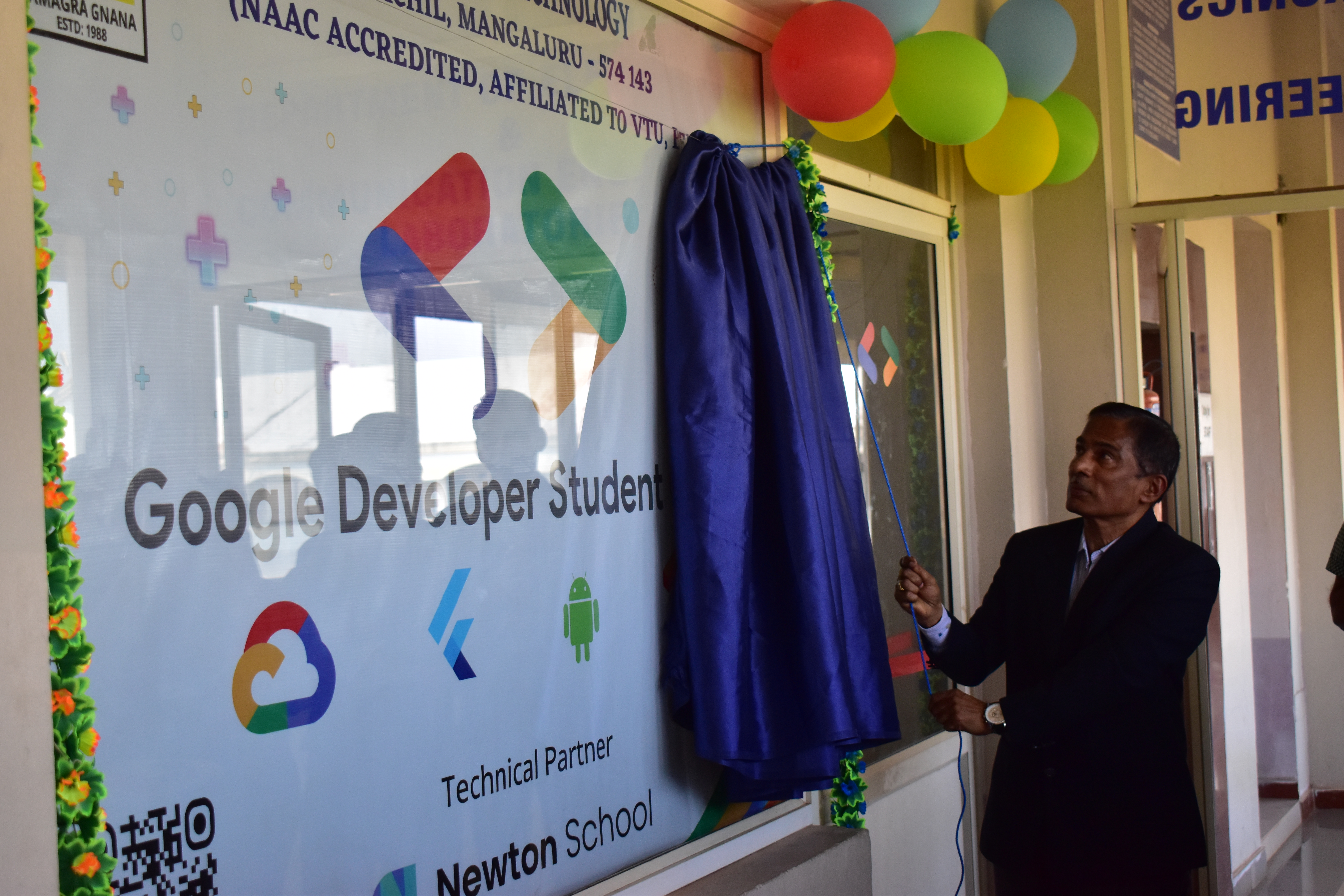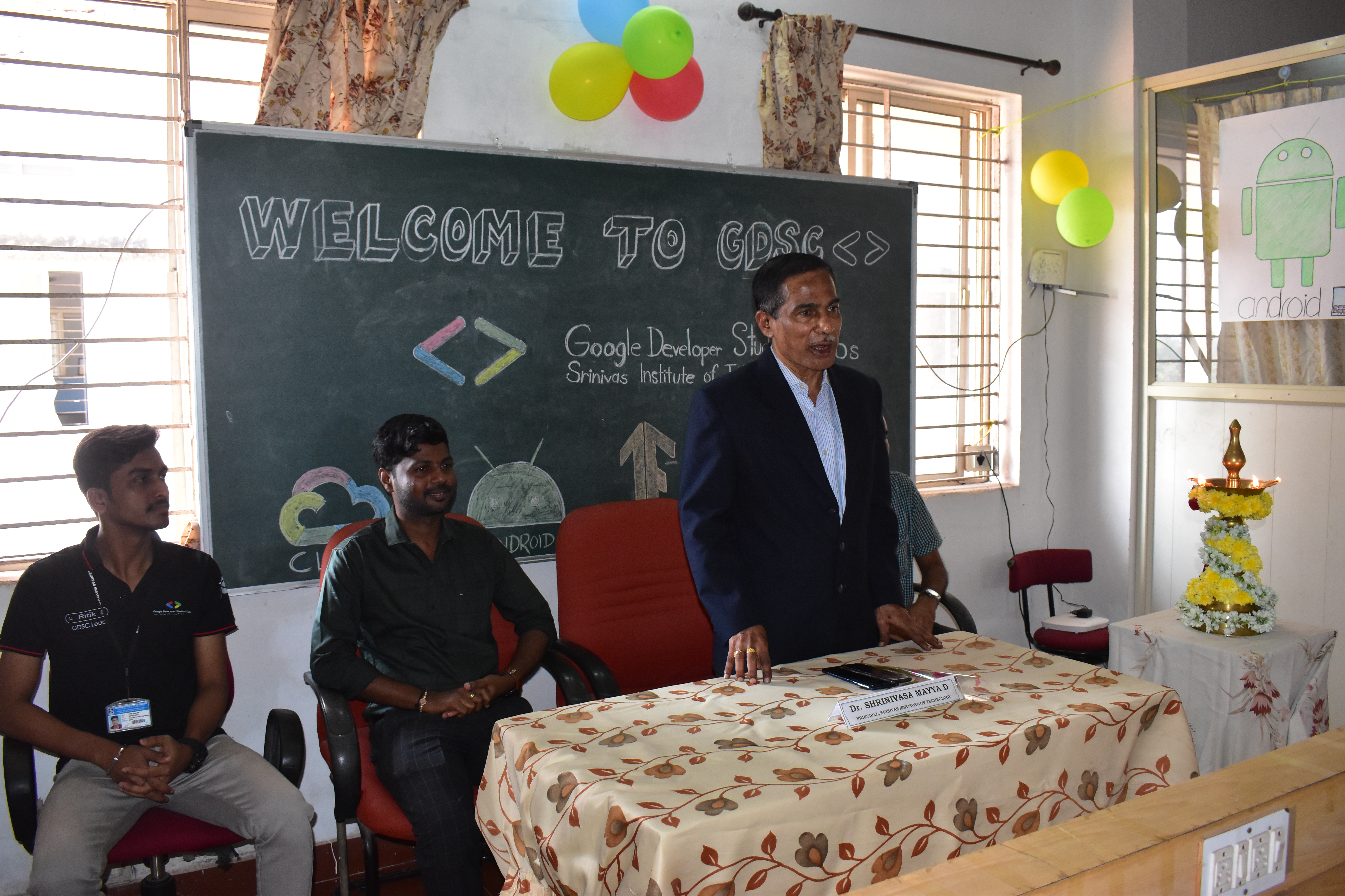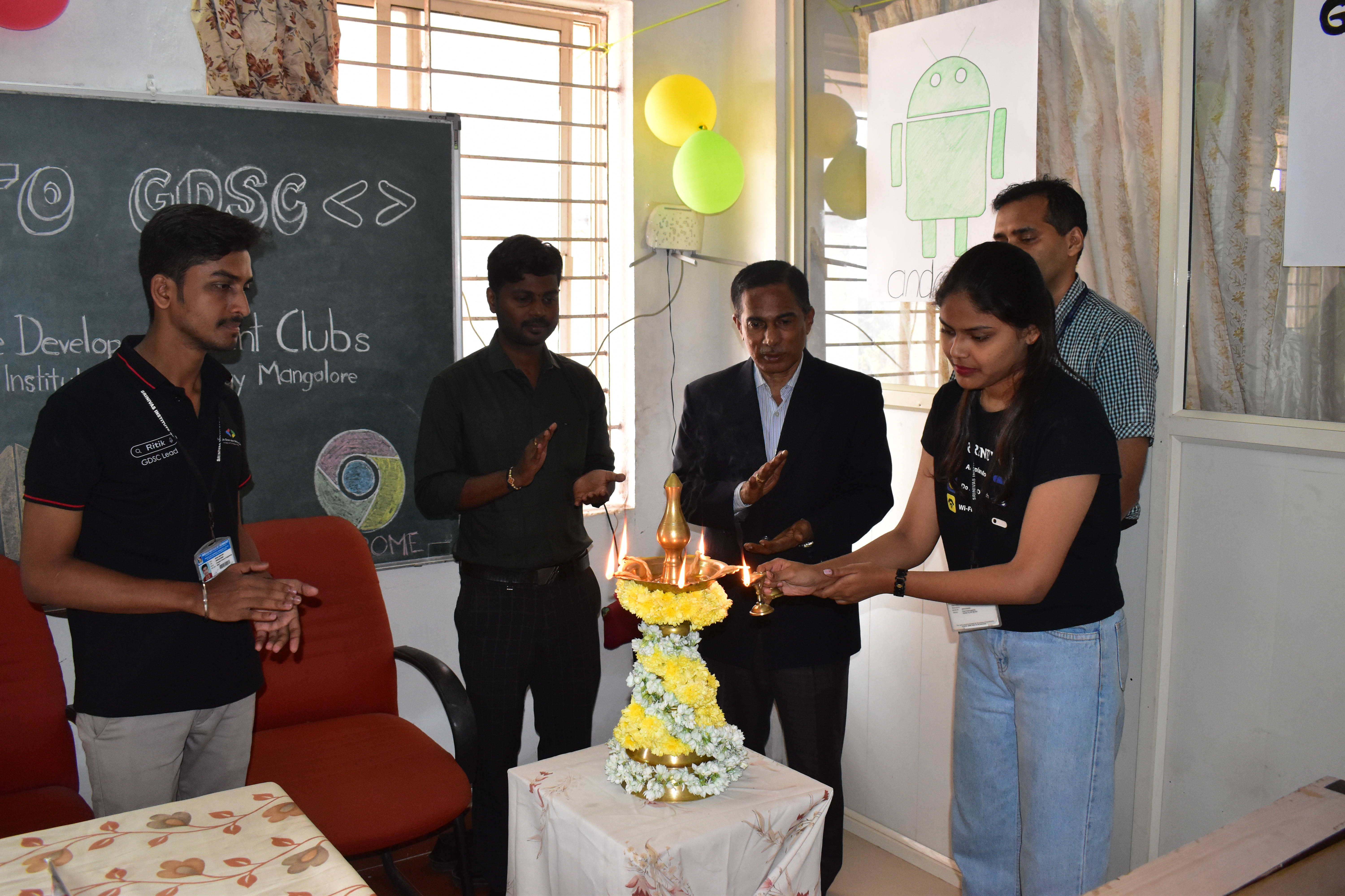 The inauguration of the Google Developer Student Clubs (GDSC) on the third floor of the Academic Block at Srinivas Institute of Technology took place on December 20, 2023, with Dr. Shrinivasa Mayya D lighting the lamp. He congratulated the students and encouraged them to make use of this club to gain knowledge. Professor Shailesh Shetty served as the Faculty Advisor of the GDSC Club. Mr. Rithik Ranjan is the GDSC lead, and information about the club's office bearers is available at GDSC Srinivas Institute of Technology. Google Developer Student Clubs (GDSC) are university-based community groups powered by Google Developers for students interested in technology. The aim is to help students bridge the gap between theory and practice. By joining the Google Developer Student Club @ SIT, students can attend workshops, hackathons, and other exciting events. They can enhance their technical skills through a peer-to-peer learning environment and expand their network by meeting tech leaders and professionals. Every student from any degree program interested in evolving as a developer is welcome to join the GDSC group. They can become a member by following this link: GDSC SIT Membership.