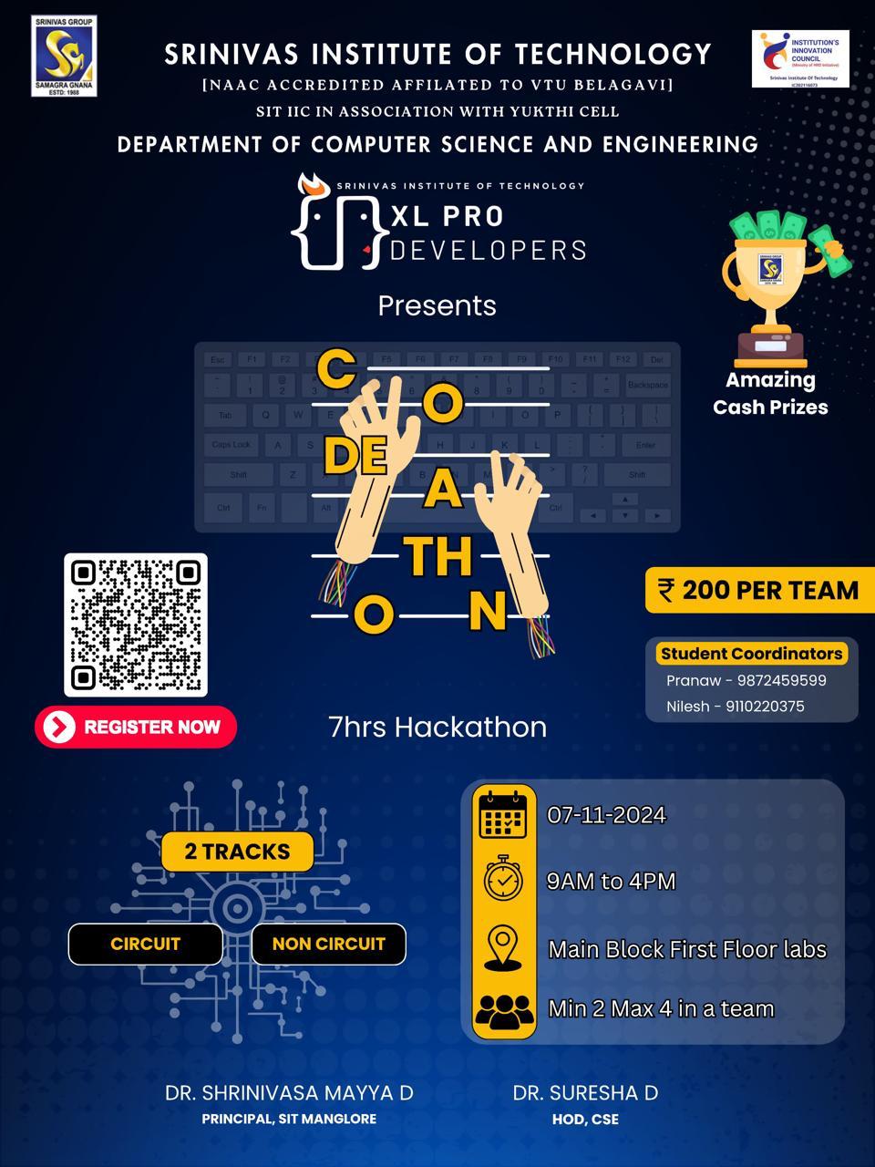 SRINIVAS INSTITUTE OF TECHNOLOGY,MANGALURU NAAC ACCREDITED Department of Computer Science and Engineering Code-a-Thon On November 7, 2024, XL Pro Developers hosted a dynamic 7-hour hackathon, Code-a-Thon, at the SSOSC lab, which drew an enthusiastic turnout of 53 teams. The hackathon featured two competitive tracks—Circuits and Non-Circuits—tailored to challenge the problem-solving skills of participants. The Circuits track presented three problem statements, while the noncircuits track offered two, allowing teams to showcase technical creativity and collaboration. The event commenced with a formal function, graced by the Principal, Dr. Srinivasa Mayya D, who inspired participants with motivational words. Reema from the 5th-semester CS B section emceed the opening ceremony, adding to the events spirited start. Student coordinators Pranaw Kumar and Nilesh, both from the 7th-semester CS B section, played key roles in organizing the event, supported by staff coordinator Mr. Alwyn Edison Mendonca and the Head of the Department, Dr. Suresha D.The competition was fierce, but ultimately the winnersemerged with Team Raudra claiming first place in the Circuital track, followed by Team Code Crafters in second. In the non-circuital track, Team Aero took the top spot, with Team Mecholtz securing second place. The event concludedat4:00PM,leaving participants energized by the experience and celebrating their achievements in technical innovation. The Code-a-Thon highlighted both the technical expertise and collaborative spirit of the students, setting a high benchmark for future events. Highlights of Code-a-thon event