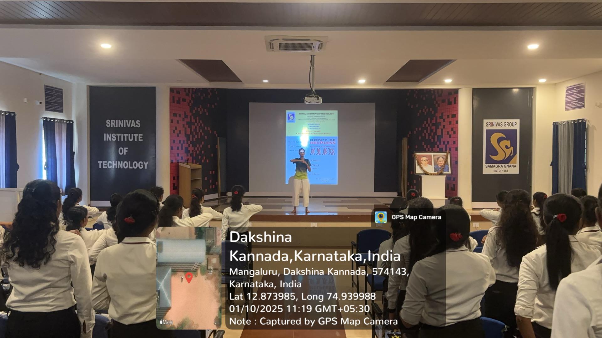 Women Cell at Srinivas Institute of Technology, Valachil, Mangaluru, organized A Self Defence work shop for Women, Shield yourself on 10-1-2025 to Female Students of SIT . The resource person was Nayana, Karate Trainer and Black Belt holder. Around 100 students took the benefit of the Workshop.