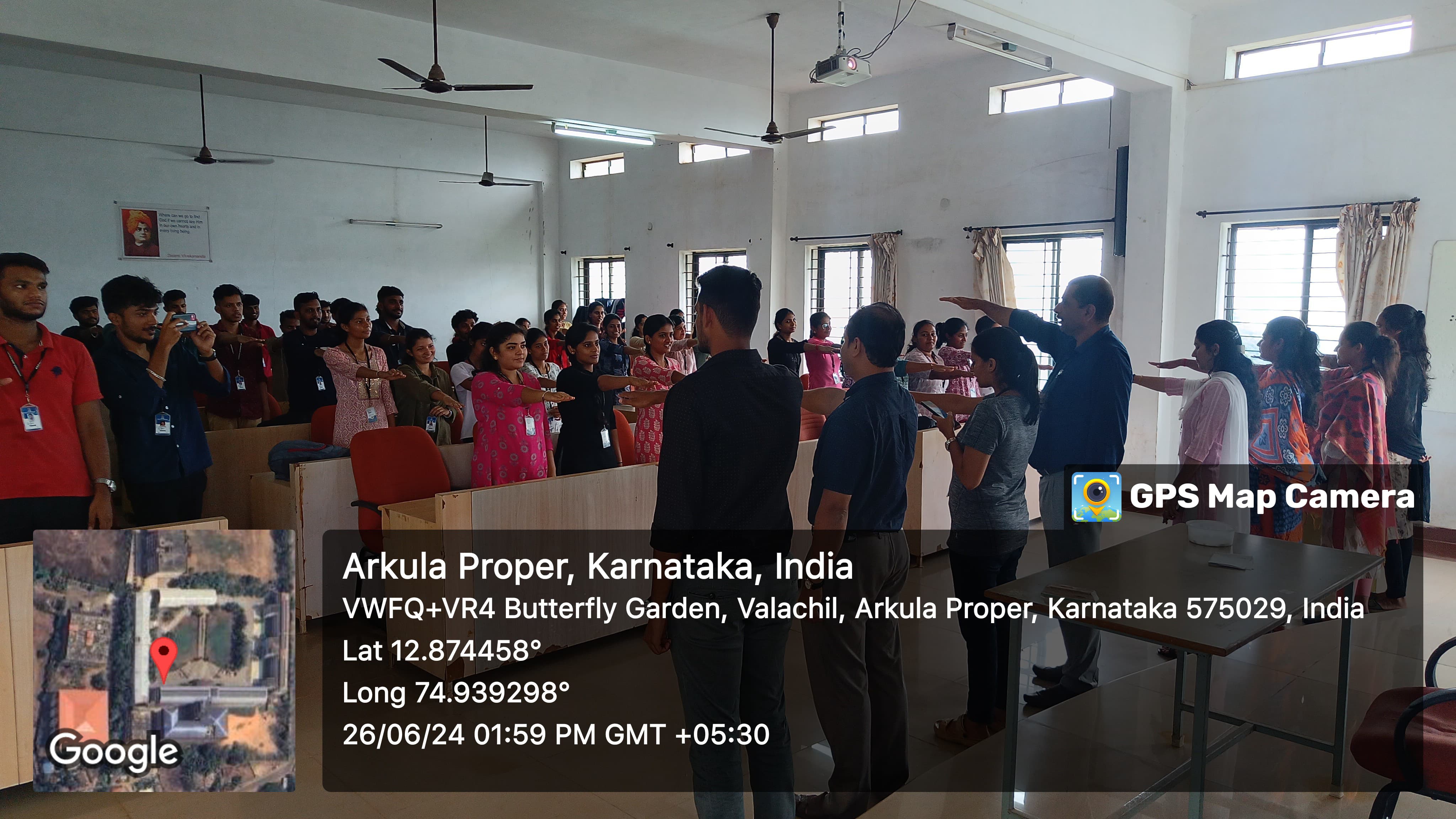 On June 26, 2024, the Department of MCA at Srinivas Institute of Technology (SIT) observed International Drug Abuse Awareness Day with a solemn pledge to combat drug abuse within its community. Led by faculty members and attended by MCA students, the event aimed to raise awareness and foster a proactive stance against substance abuse.The pledge highlighted the department's commitment to nurturing a safe and supportive environment for all students and staff at SIT. By uniting in this pledge, the MCA department reaffirmed its dedication to promoting health, well-being, and academic success free from the impact of drug abuse.This initiative served as a proactive step towards addressing the challenges posed by drug abuse within the educational setting. It emphasized the importance of education, prevention, and community support in creating a drug-free campus environment where students can thrive both academically and personally.