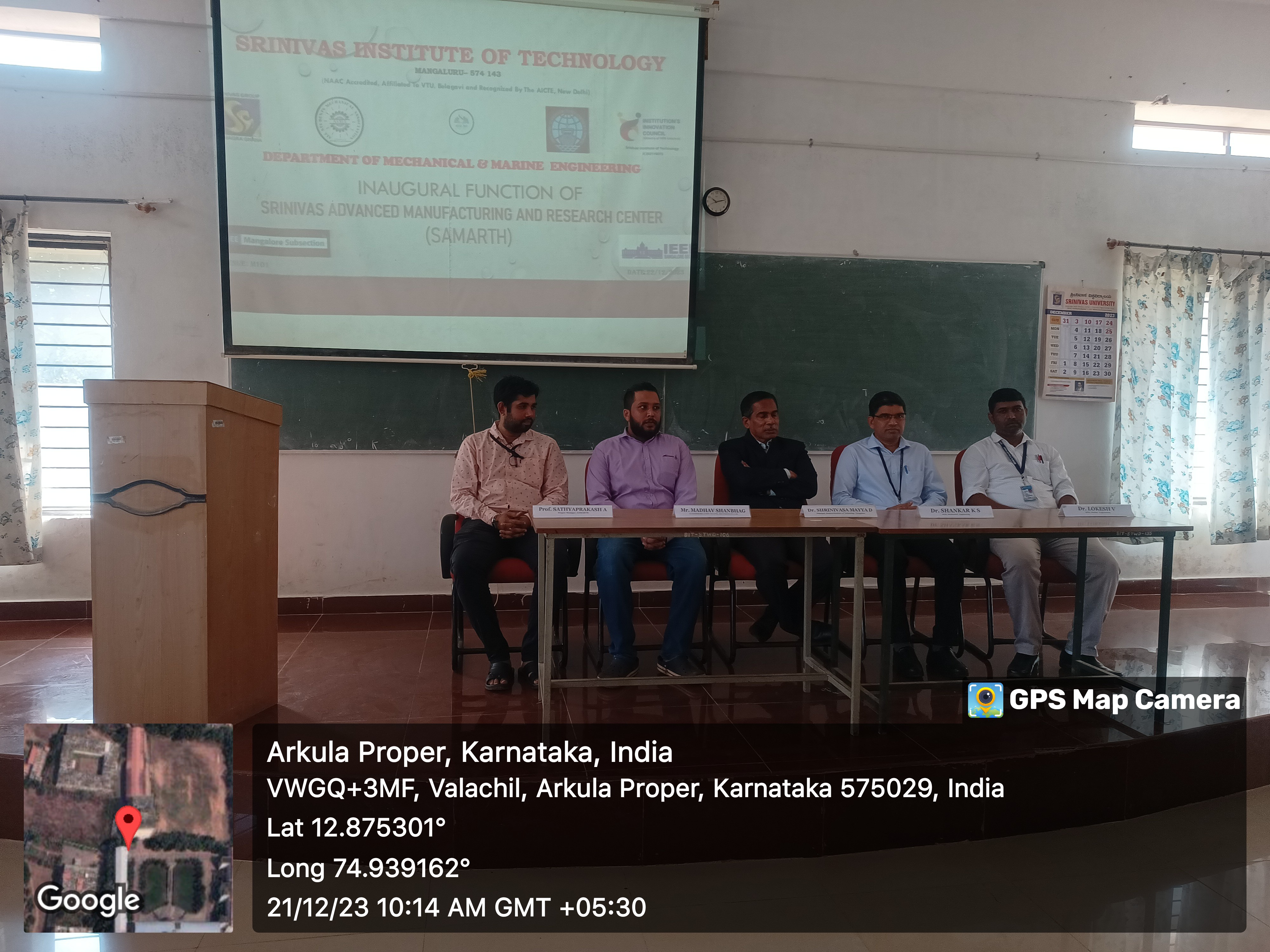 The inaugural function of Srinivas Advanced Manufacturing and Research Theatre (SAMARTH), of Mechanical engineering department, Srinivas Institute of Technology , Valachil, Mangaluru, was held on Saturday 21st December 2023. Mr. Madhav Shanbhag, Customer relation officer, JSW Paints PVT Ltd., was the Chief Guest of the function. Mr. Abhishek Bhandi of 5th sem mechanical Engineering welcomed the gathering, where as Ms Thejaswini of 3rd sem Mechanical Engineering invoked the blessings of god through her prayer. Dr. Shankar K S, Hod of Mechanical Engineering department addressed the students and thanked Mr. Madhav Shanbhag for his contribution in building SAMARTH. He also briefed about the purpose of setting the research theatre. Dr. Shrinivasa Mayya D, Principal of the college, was the president of the inaugural function, in his presidential address, he encouraged the students to make use of the new technologies available and grow themselves and to be prepared for the upcoming increase in demand for the Mechanical engineers. Dr. Lokesh V, Hod of the Marine Engineering was present during the function. Mr. SathyaPrakash, Project Manager of SAMARTH was also present during the function. Mr Subrahmanya of 5th sem Mechanical Engineering delivered the vote of thanks. The program was compered by Mr. Chirayu G.