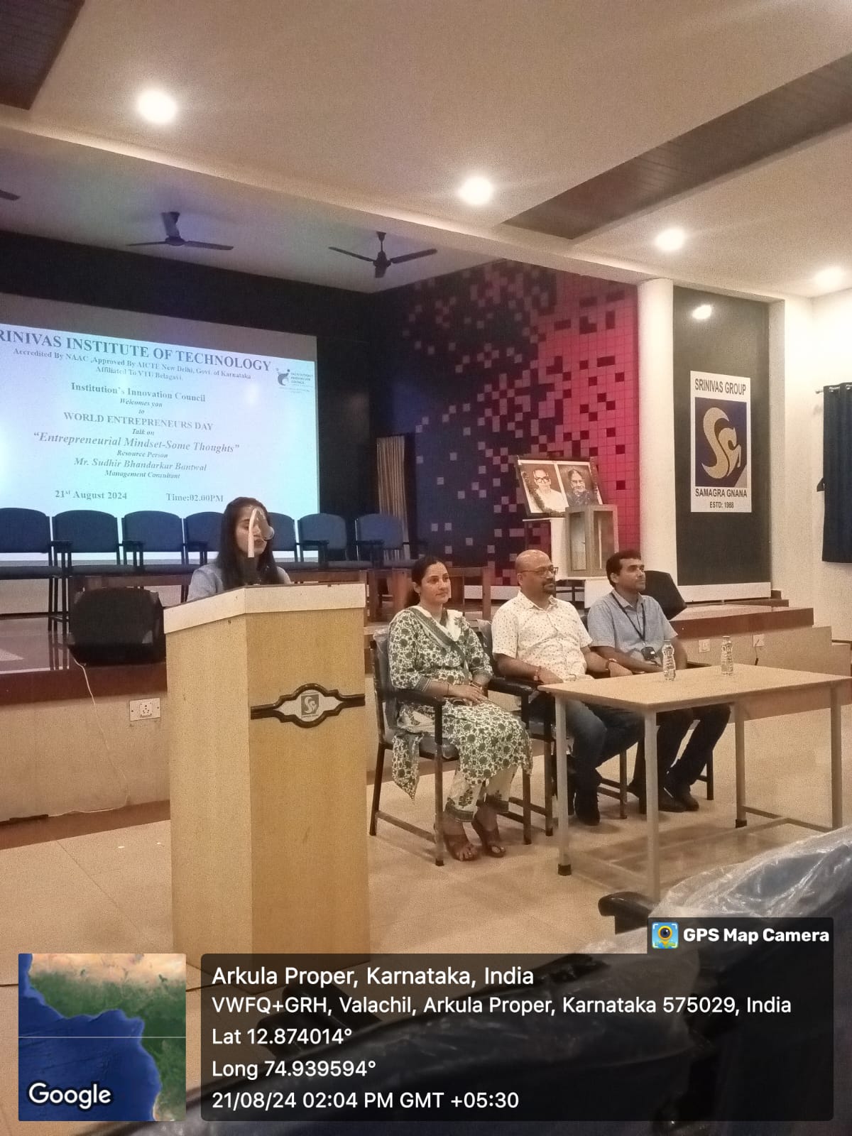 Srinivas Institute of Technology, Valachil, Mangalore, in collaboration with the Institution's Innovation Council (IIC), celebrated World Entrepreneurs Day on August 21, 2024. MsArpita Shetty of 4thsemCSBS Department welcomed the gathering and introduced the Chief guest Mr Sudhir Bhandarkar Bantwal, Management consultant. Mr Sudhir Bhandarkar Bantwaldelivered a talk on the topic Entrepreneurial Mindset – SomeThoughts. The program drew approximately 200 students from various engineering disciplines. As a token of appreciation, Dr. Soorya Krishna K presented a memento toMr Sudhir Bhandarkar Bantwal. In his address, Mr. Sudhir elucidated the concept of entrepreneurship through relevant real-life examples, aiming to inspire the next generation of business leaders. He emphasized critical success factors for entrepreneurs, including perseverance, never compromising on quality, being hands-on, maintaining financial discipline, focusing on value creation, ensuring compliance, and building a strong network. This event provided valuable insights and practical knowledge to aspiring entrepreneurs among the student body.